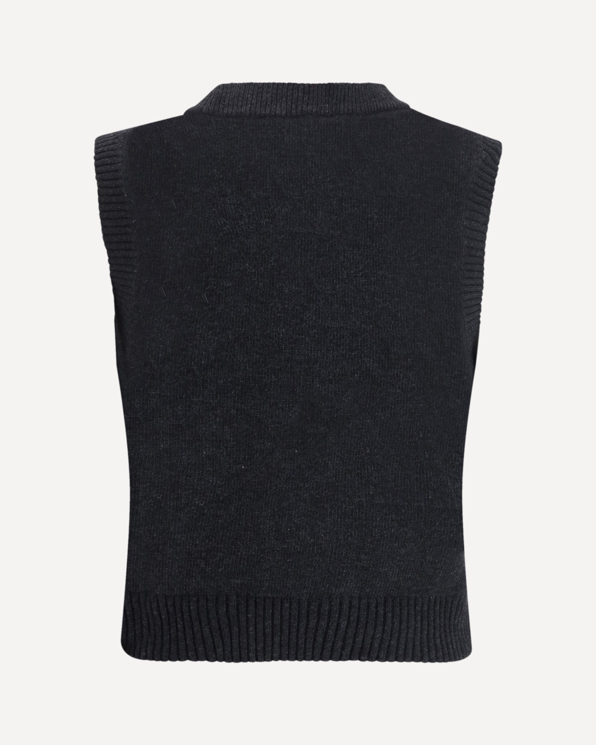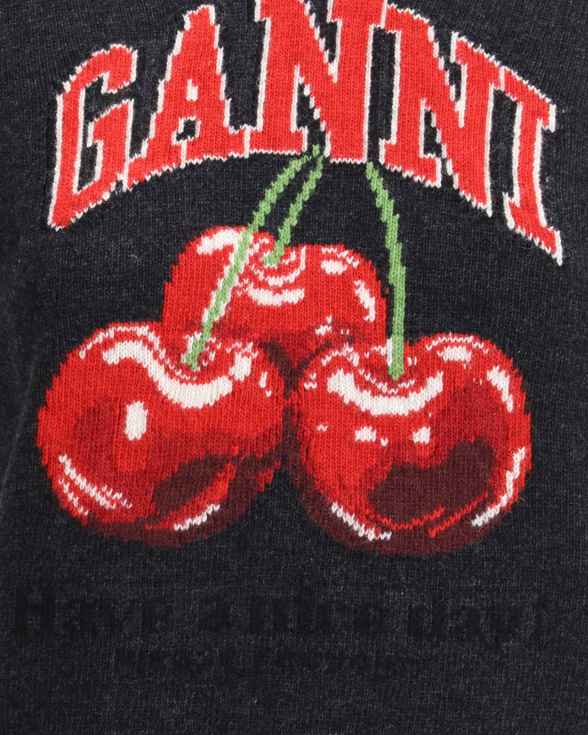 The Wool Vest with graphic cherries By Ganni turns a classic wool vest into a playful, expressive piece. The clean round neckline and ribbed edges create a balanced, structured frame, while the cherry print adds a lively, spirited touch to the soft knit texture. Finished with the signature GANNI logo, the piece captures the brand’s modern, joyful identity. A versatile layer that brings charm and personality to everyday styling.