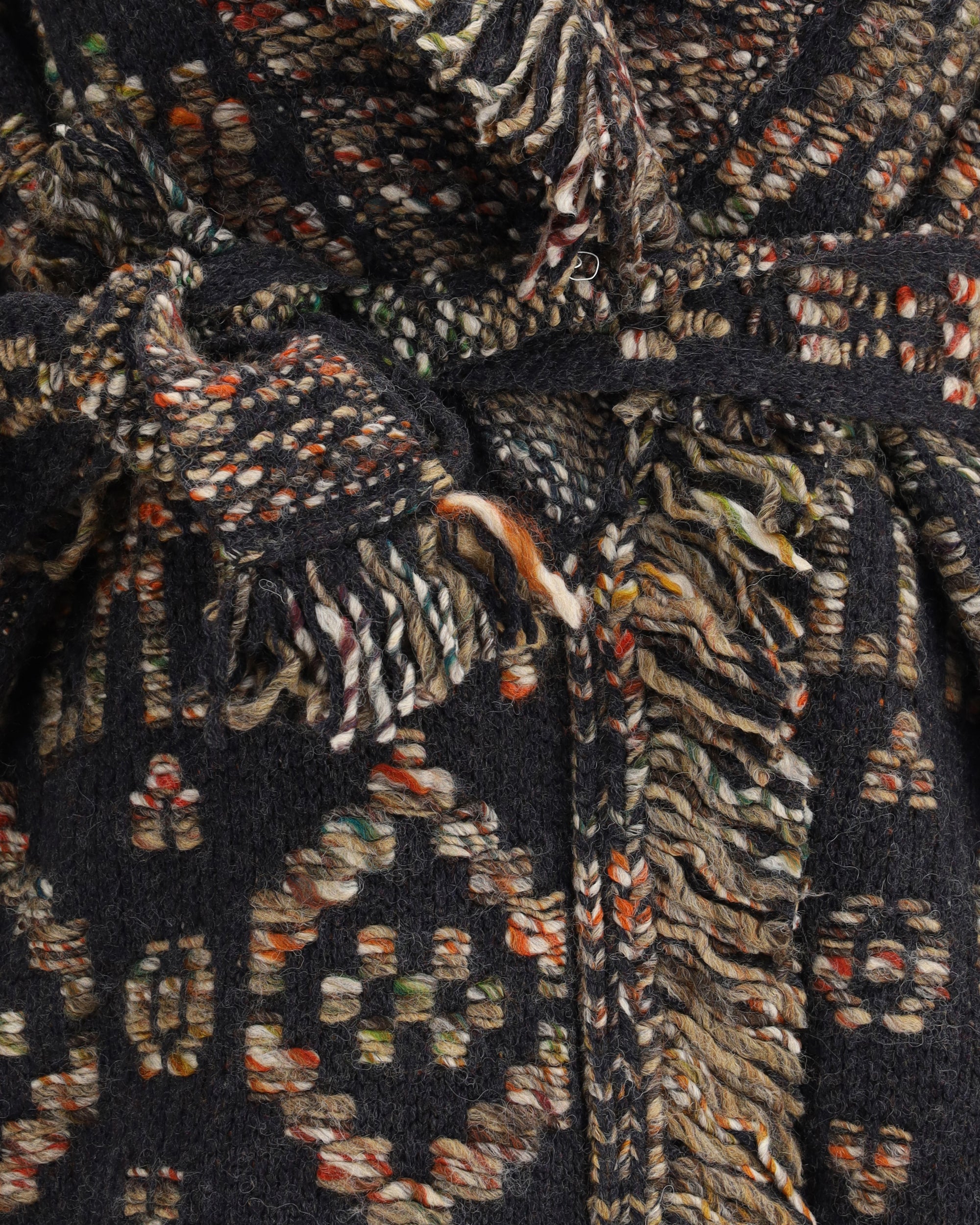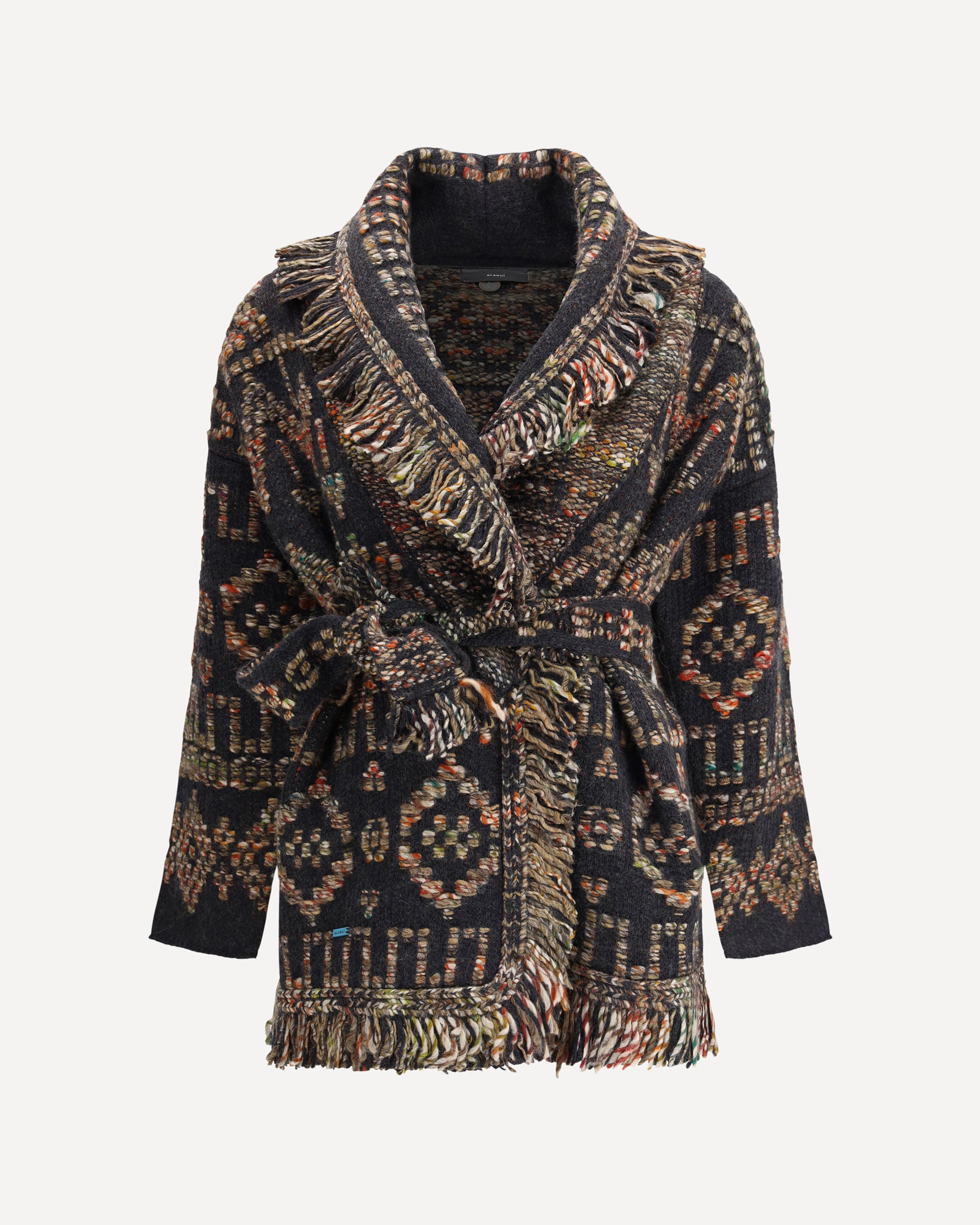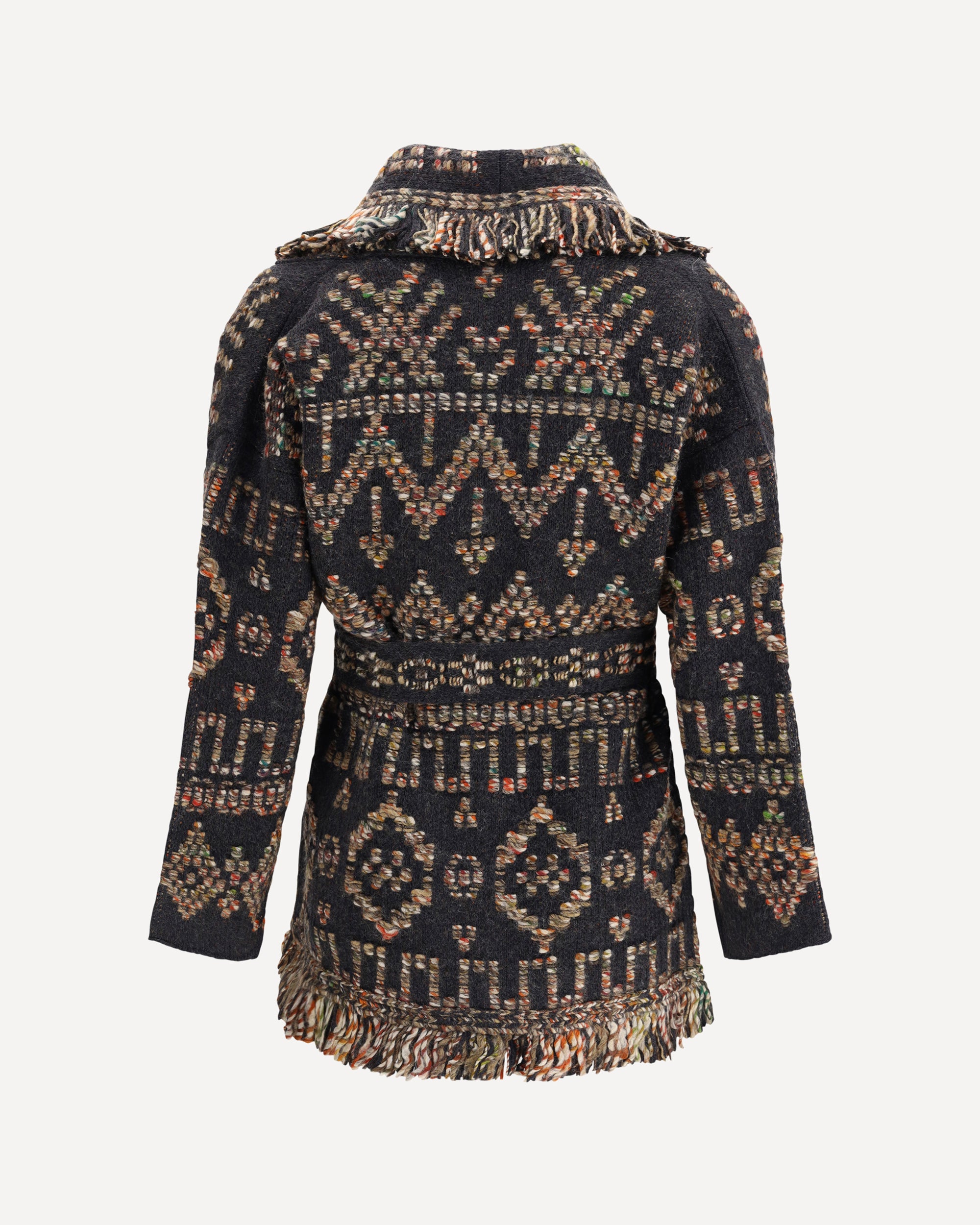 Alanui's Grunge Beat Cardigan features a geometric weave knit pattern inspired by the Pacific Northwest's rebellious aesthetic. Earthy hues enhance its natural appeal, while the coordinating belt and fringed edges complete the design with a distinctive handcrafted touch.