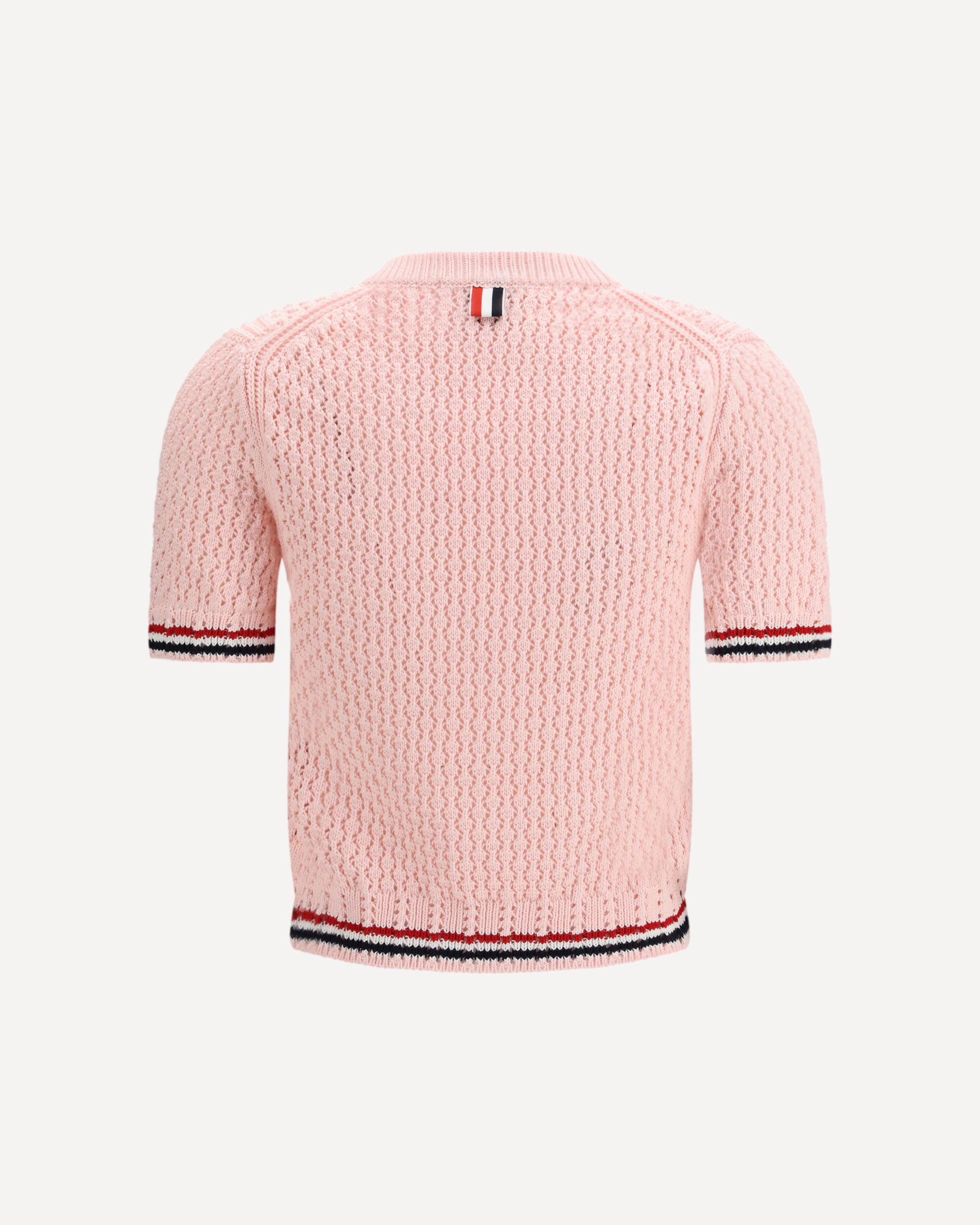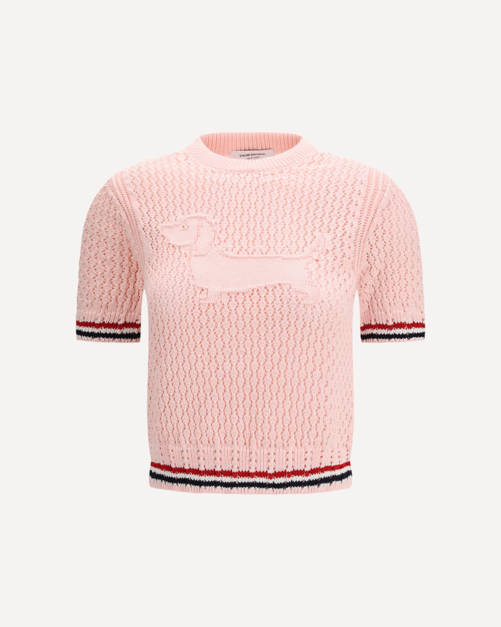The Hector T-shirt by Thom Browne features an elegant pointelle stitch construction showcasing the iconic Hector dog motif. Designed with a crew neck, short sleeves, and signature striped detailing, it blends refined craftsmanship with the brand’s unmistakable aesthetic.