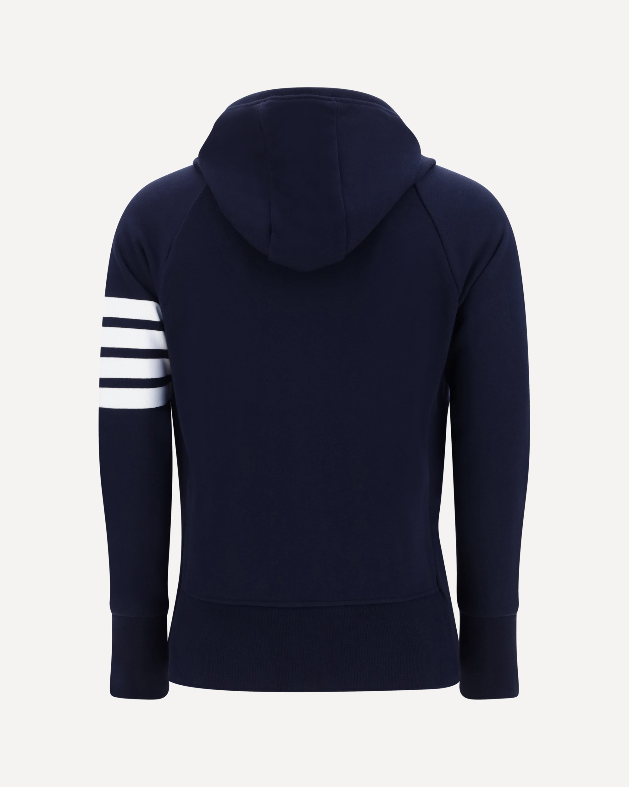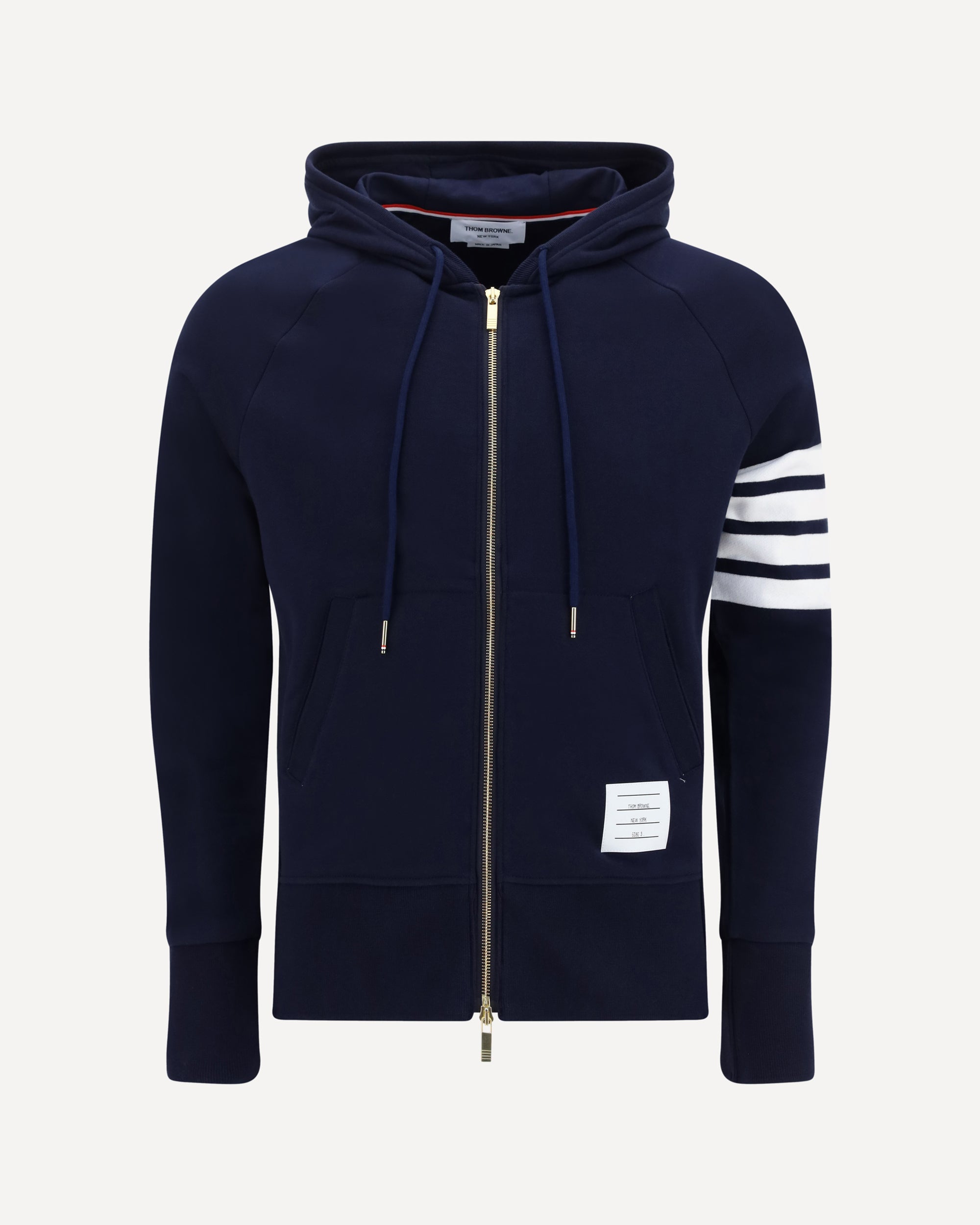 Thom Browne's Cotton Hoodie features a front zipper closure and an adjustable drawstring hood for a customizable fit. Featuring two welt pockets on the front, it is enhanced by the iconic white bands on the left sleeve and the brand's logo patch on the front. The ribbed hem and cuffs complete the design, making this sweatshirt a versatile and distinctive garment, perfect for a casual and refined look.