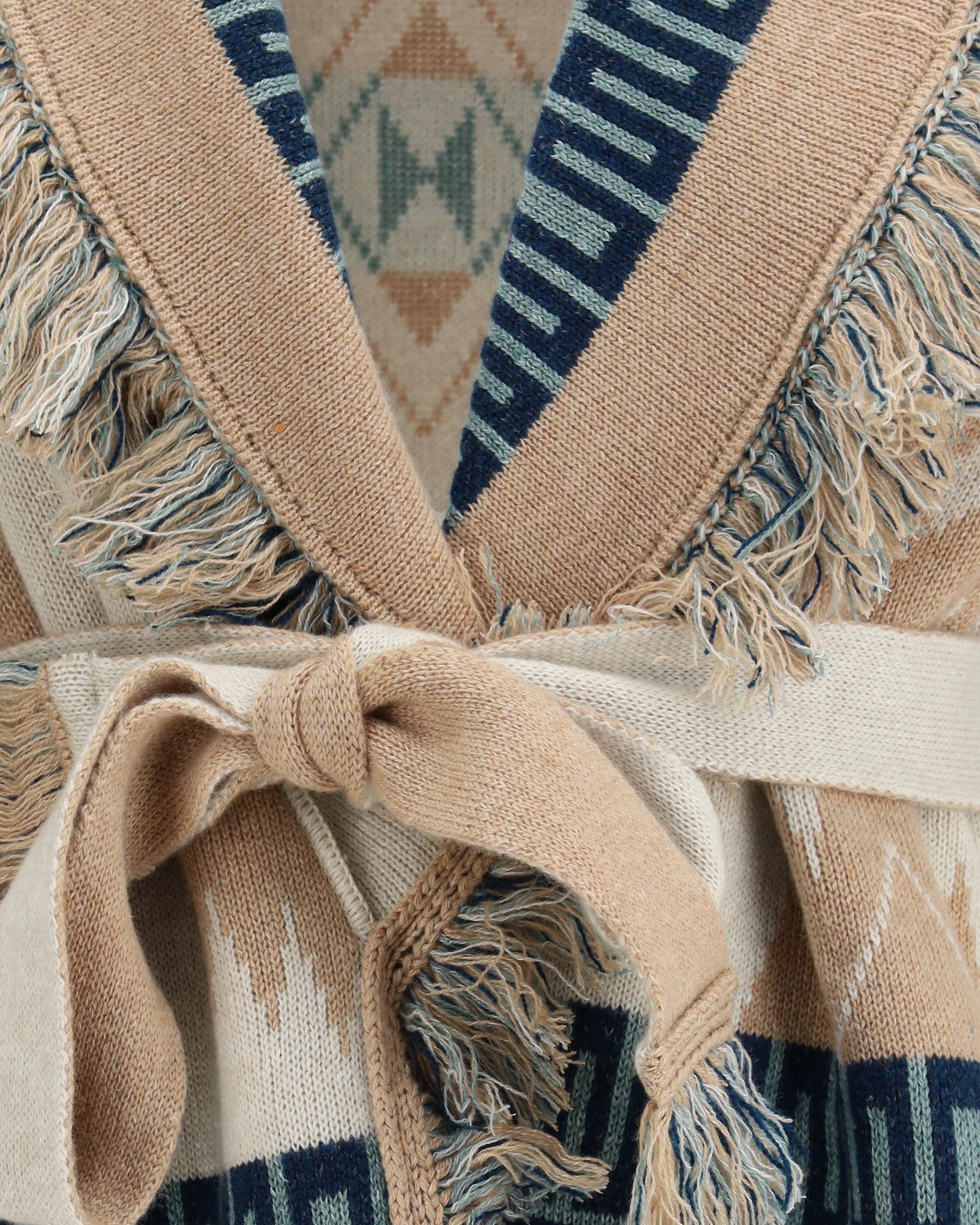 The Icon Jacquard Cardigan by Alanui is a timeless piece crafted for comfort, travel, and effortless style. Featuring the signature Icon fit and the brand’s iconic Alanui Pattern, it is meticulously made from pure cashmere using an intricate double jacquard knit. Finished with a two-tone tie belt and multicolored fringed edges, this luxurious cardigan embodies Alanui’s spirit of relaxed sophistication and artisanal craftsmanship.