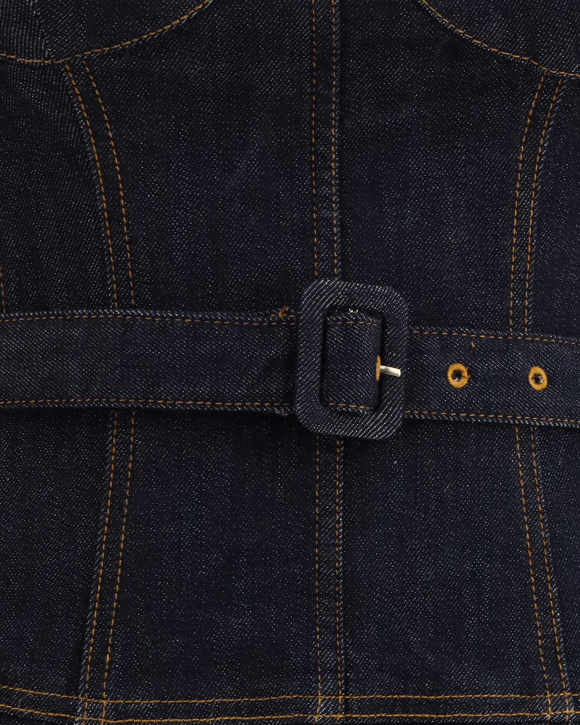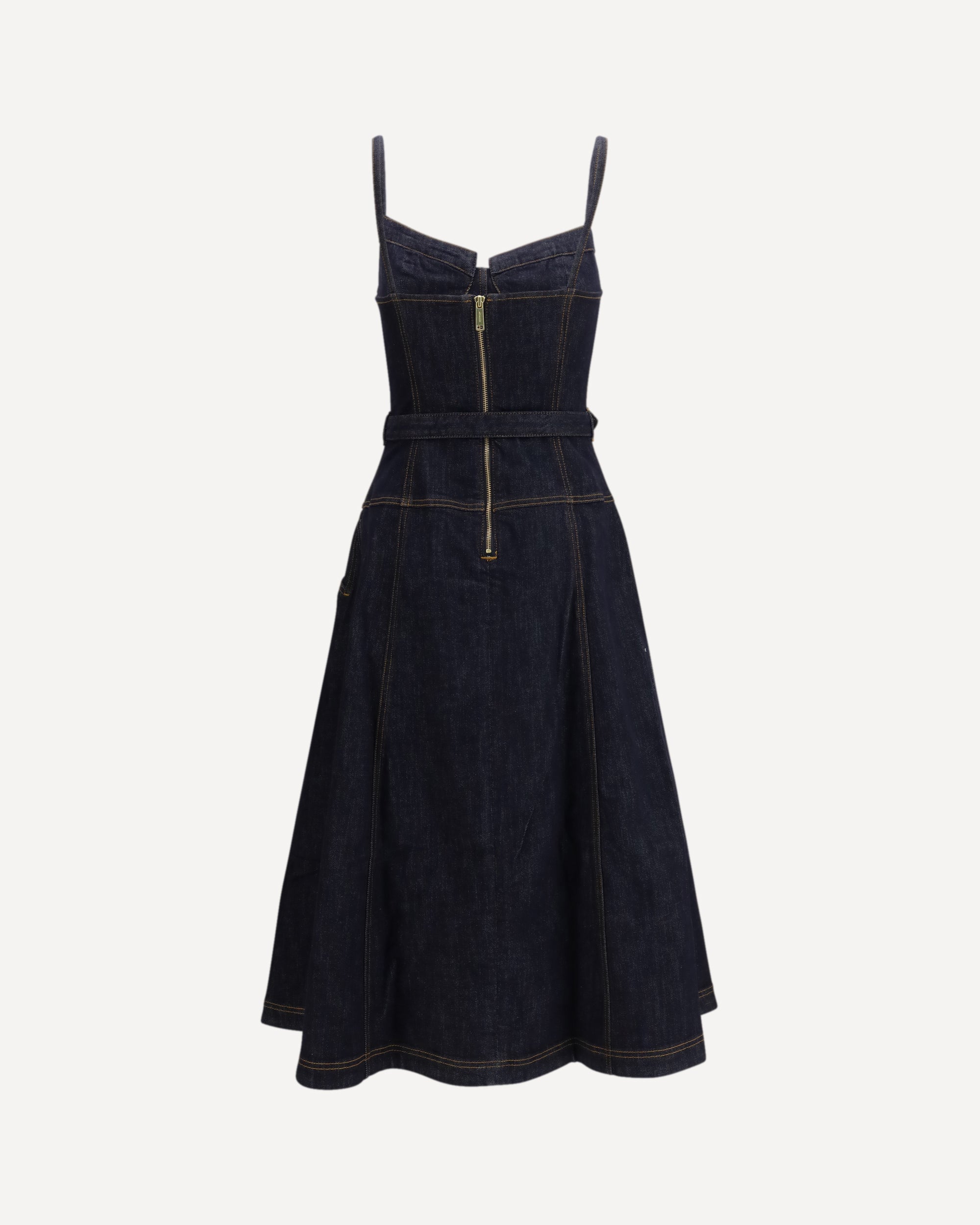 The denim flared midi Dress by Self-Portrait reimagines denim with a refined, feminine attitude. The fitted bodice is shaped by a sensual sweetheart neckline, flowing into a full flared skirt that adds movement and elegance. Street-inspired details like contrast stitching and an exposed back zip introduce a modern edge, while the dropped waist and removable belt subtly define the silhouette. A versatile piece, designed to transition effortlessly from day to night with flats or heels.