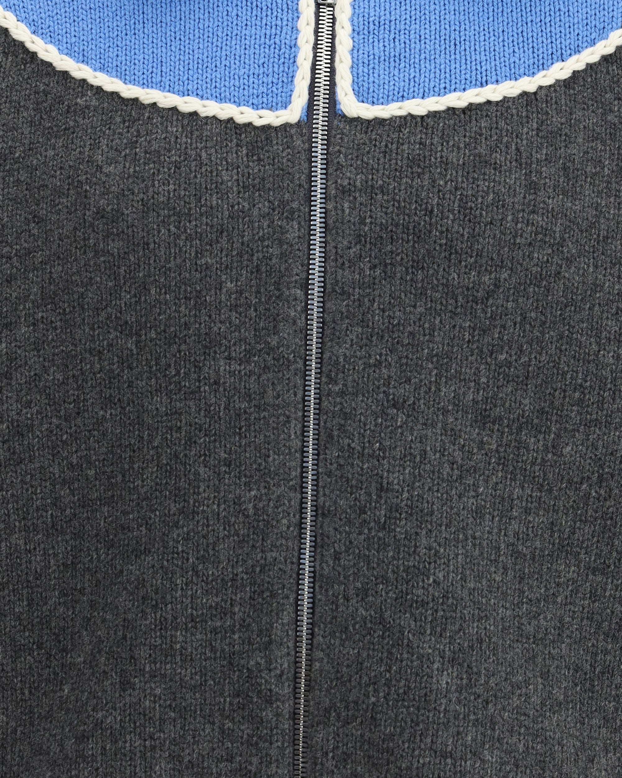 The Wool zipped Jacket by Bottega Veneta is crafted from color-block knitted wool in anthracite and admiral blue tones. Featuring a zip closure and viscose lining, it has a regular fit that combines comfort with refined style, making it a versatile piece for any occasion.