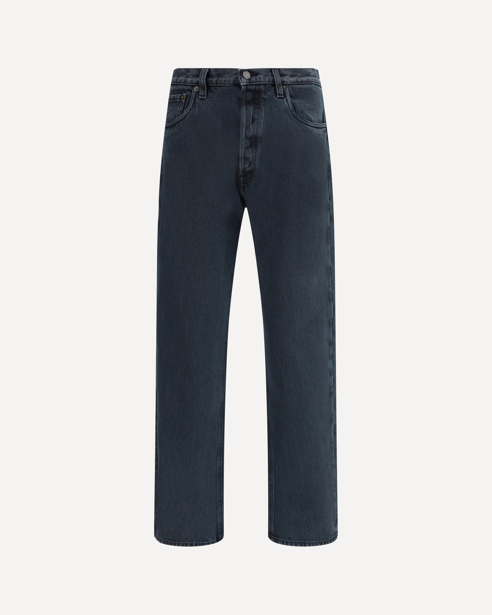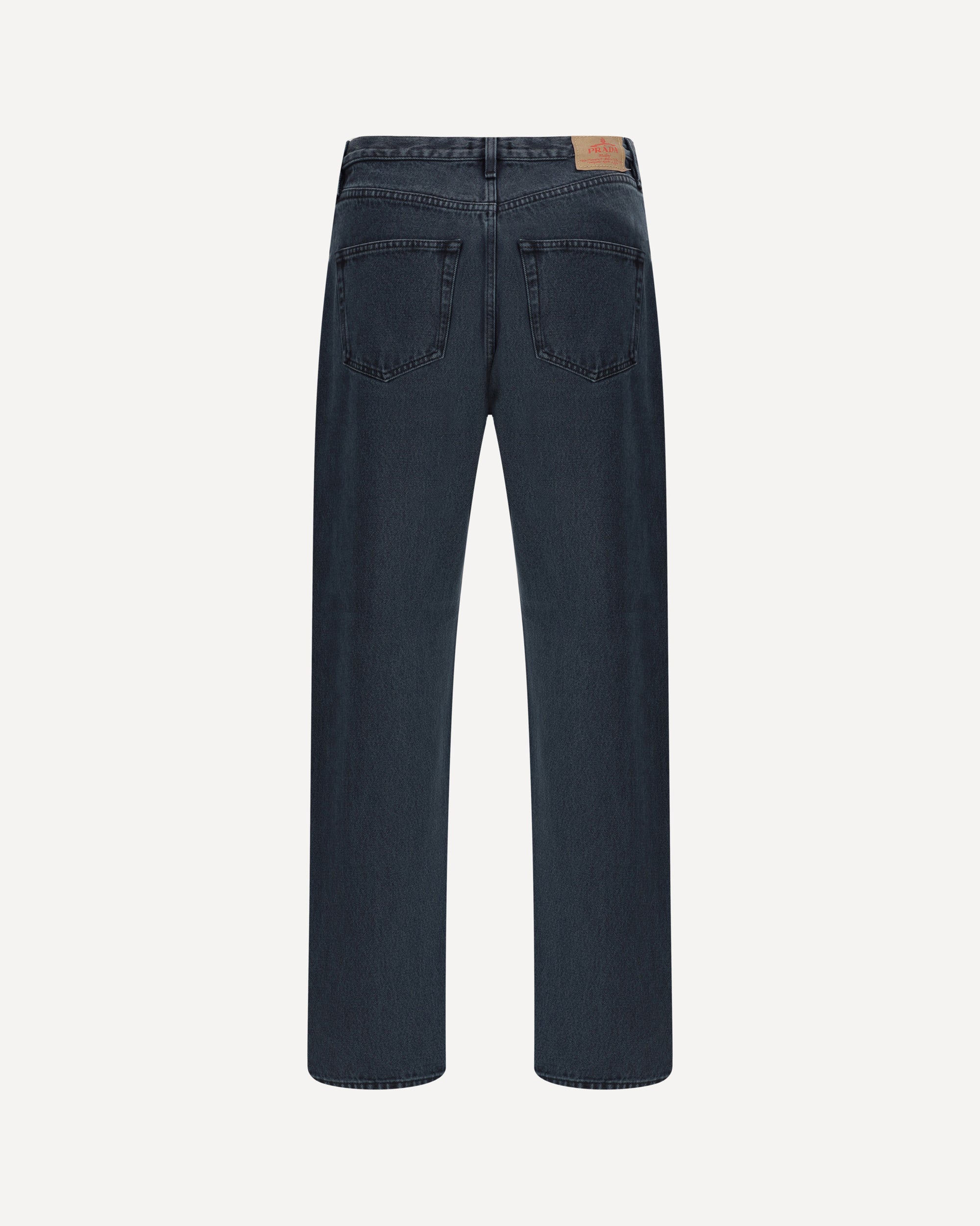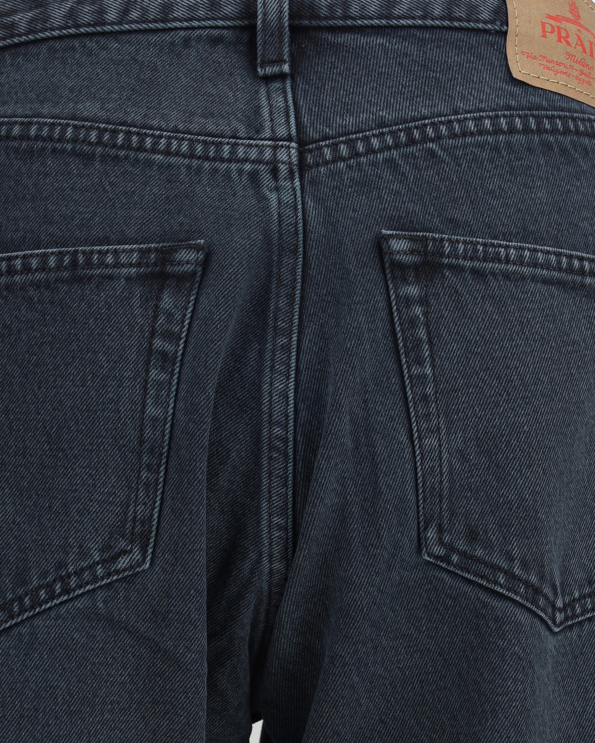 Cotton Jeans by Prada, made in the classic 5-pocket model with front button closure. The essential design is enriched by an applied logo patch on the back, a distinctive detail that recalls the brand's iconic aesthetic.