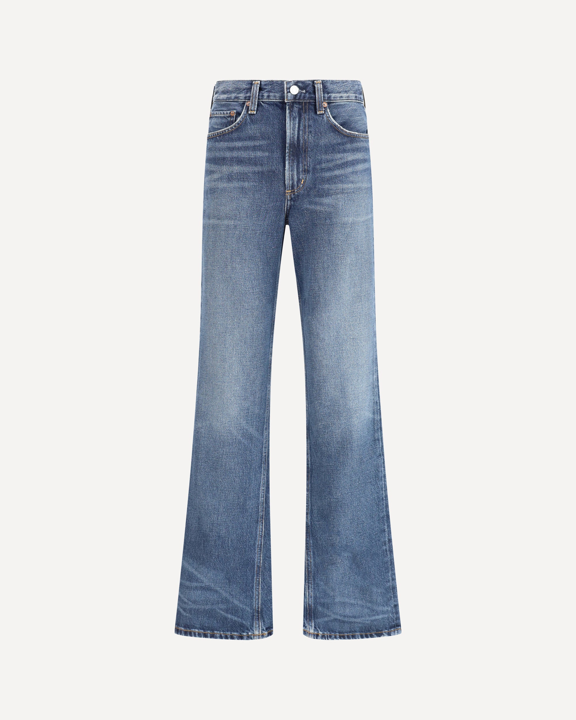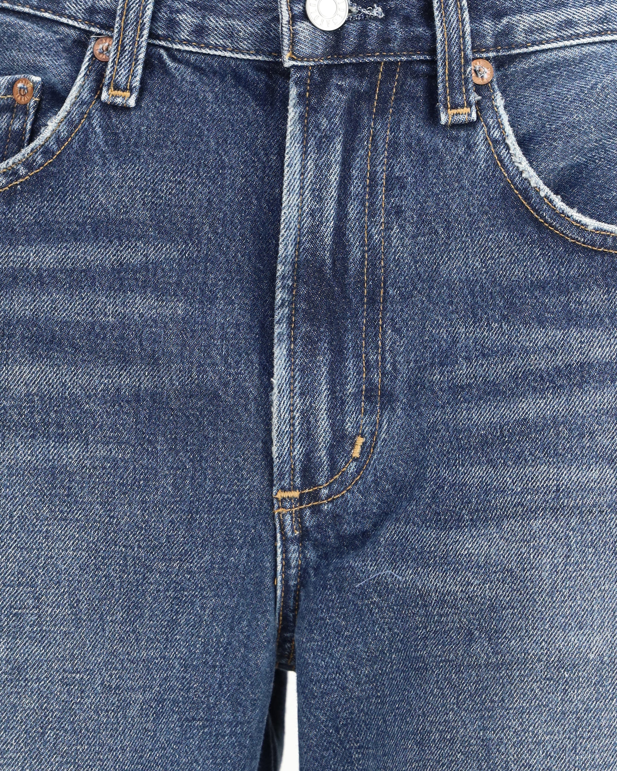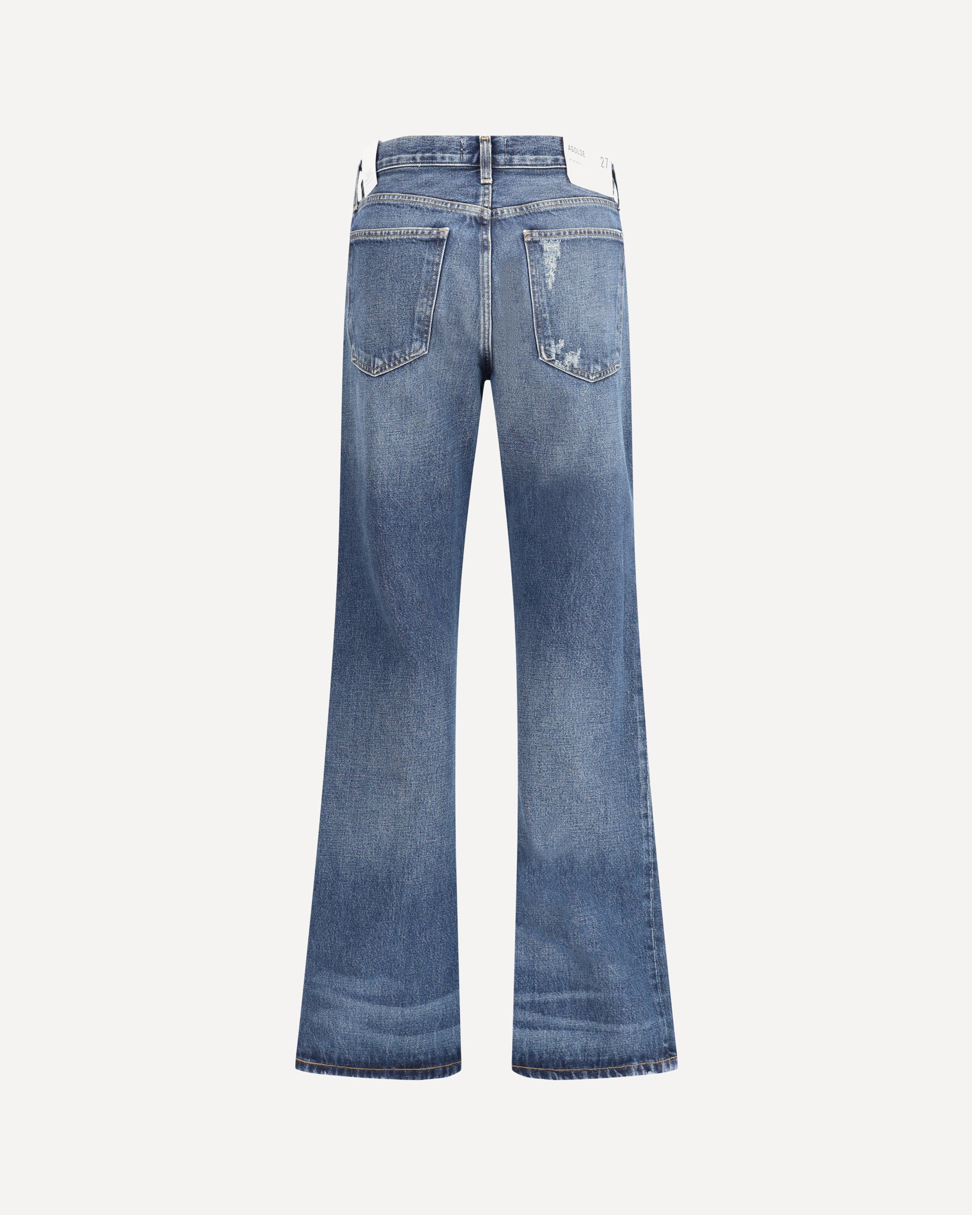 Mid-waist bootcut jeans with a fitted cut at the hips and slight flare at the bottom, made of indigo regenerated denim with a worn effect, whiskering and soft finish for a contemporary and versatile look.