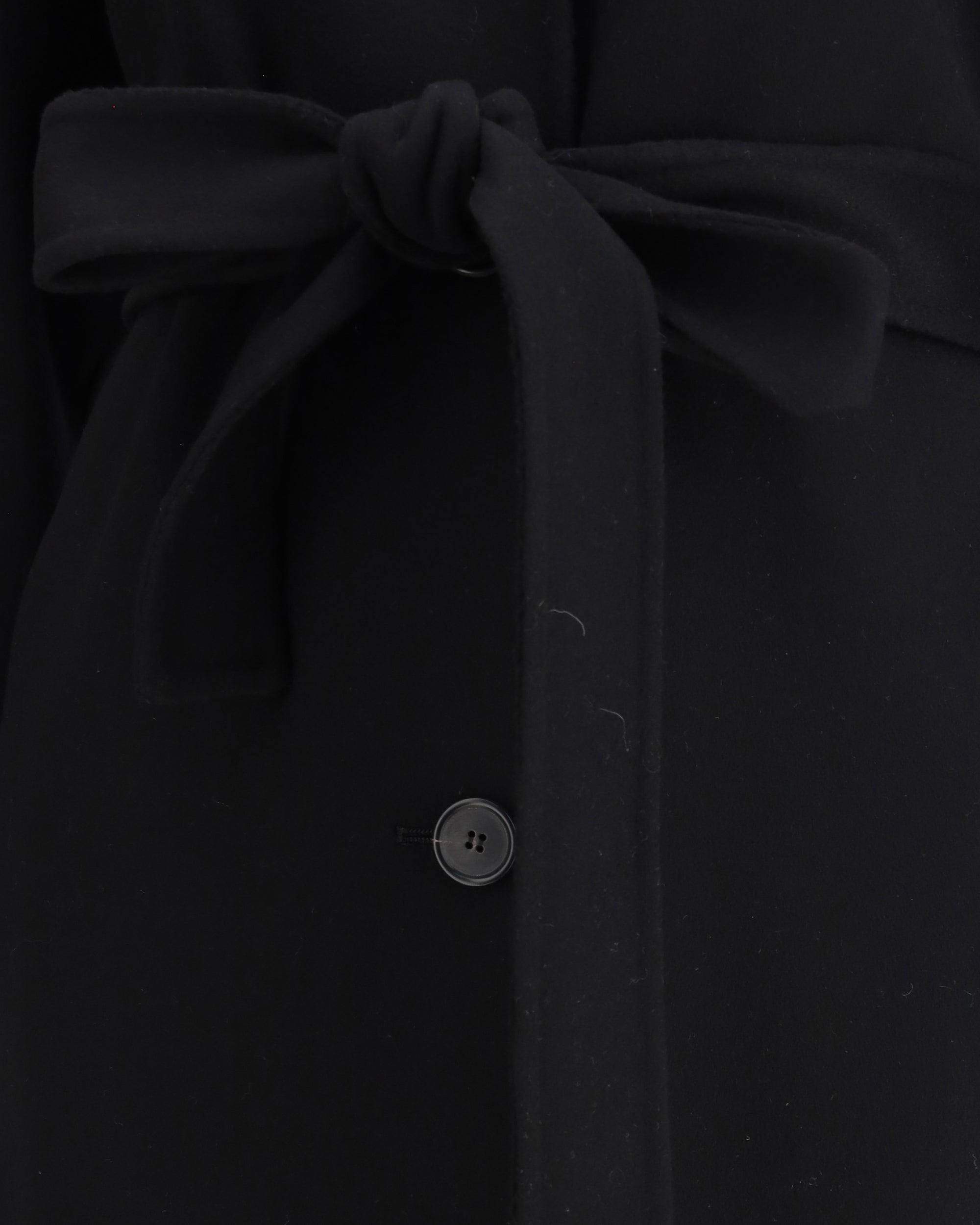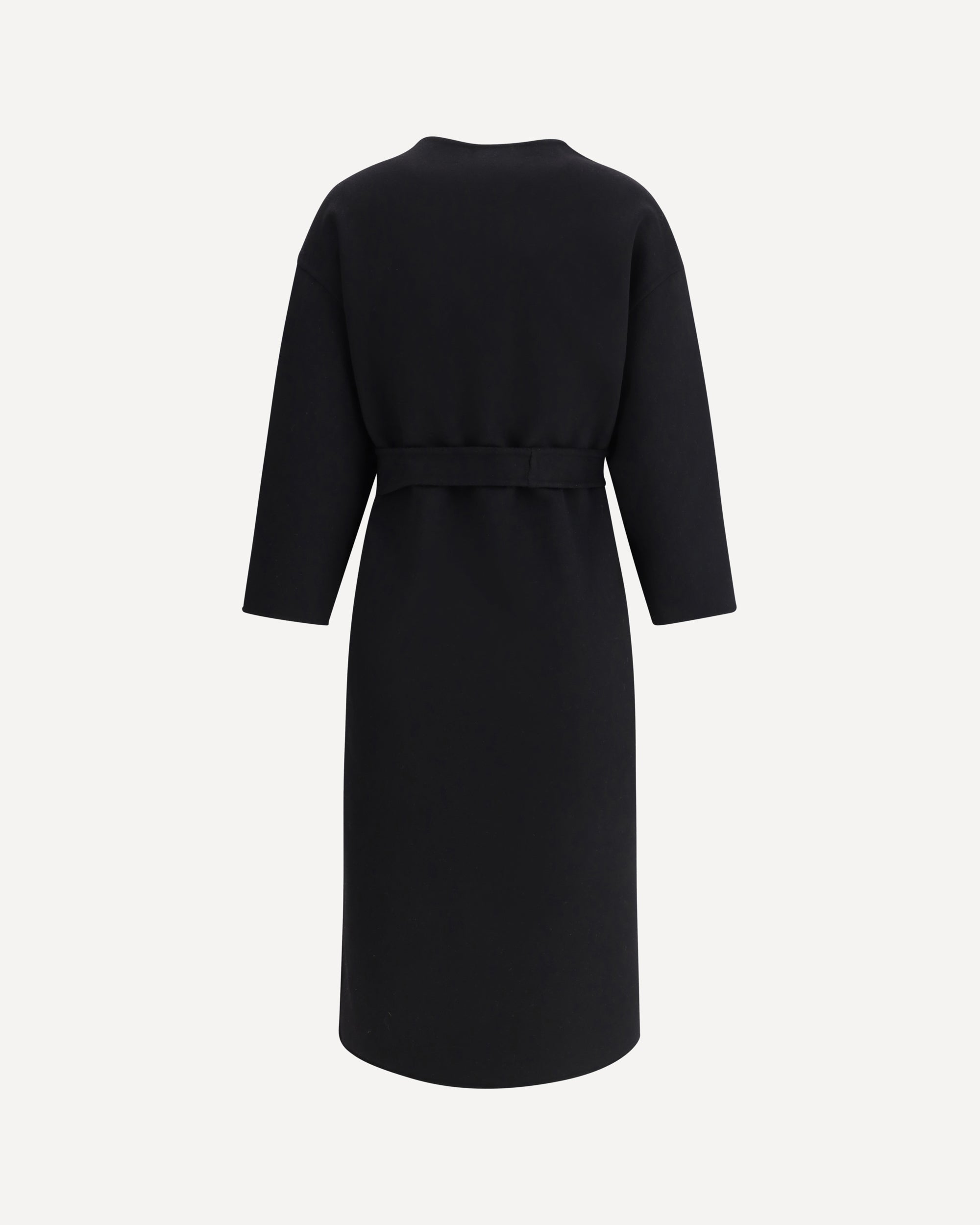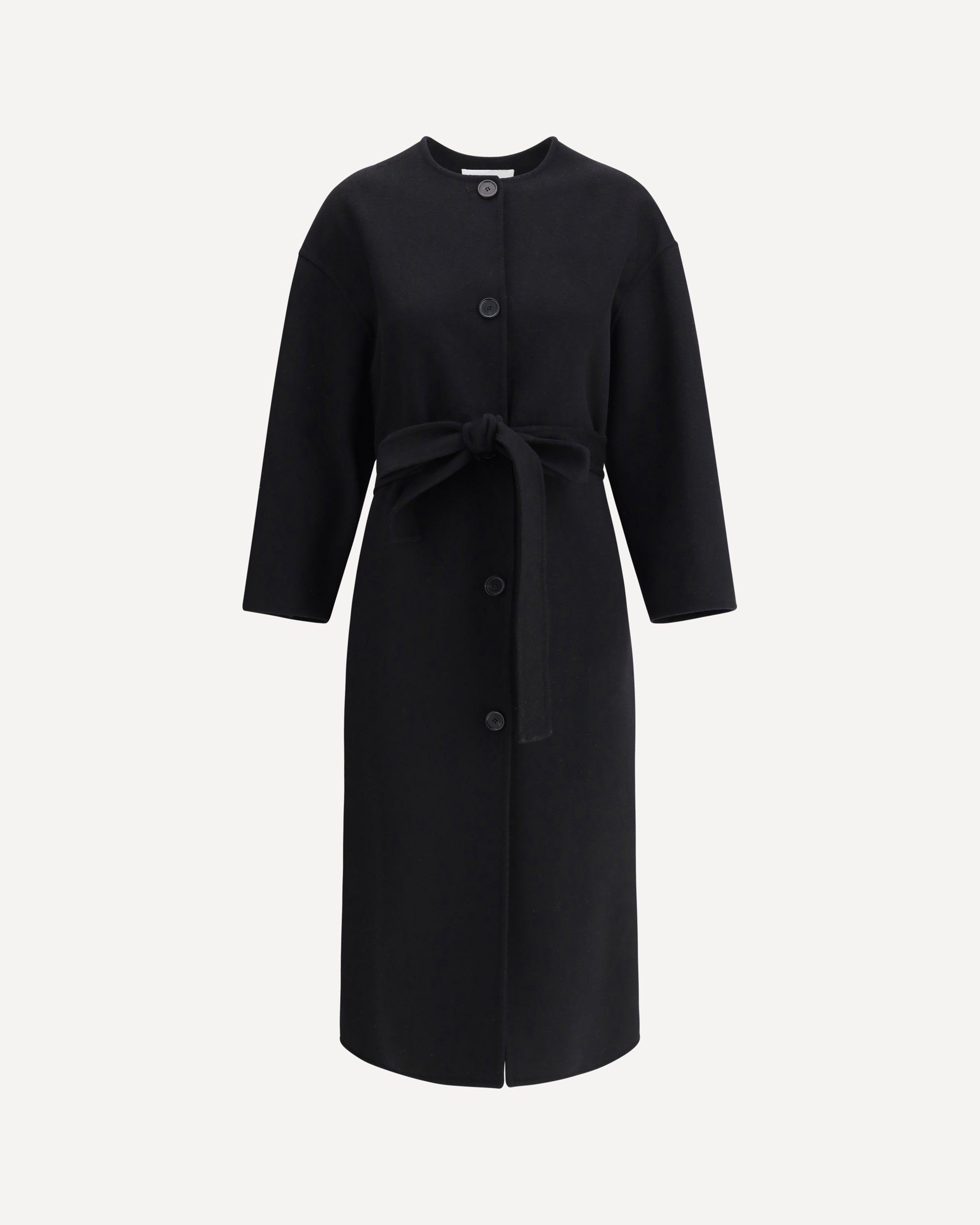 Long Coat by Aftercoat features a classic crew neck that lends an elegant, understated look. The front button closure adds a touch of sophistication, while the matching knotted sash at the waist allows you to customize the fit, creating a defined silhouette. The two side welt pockets add functionality without compromising the clean aesthetic of the design.