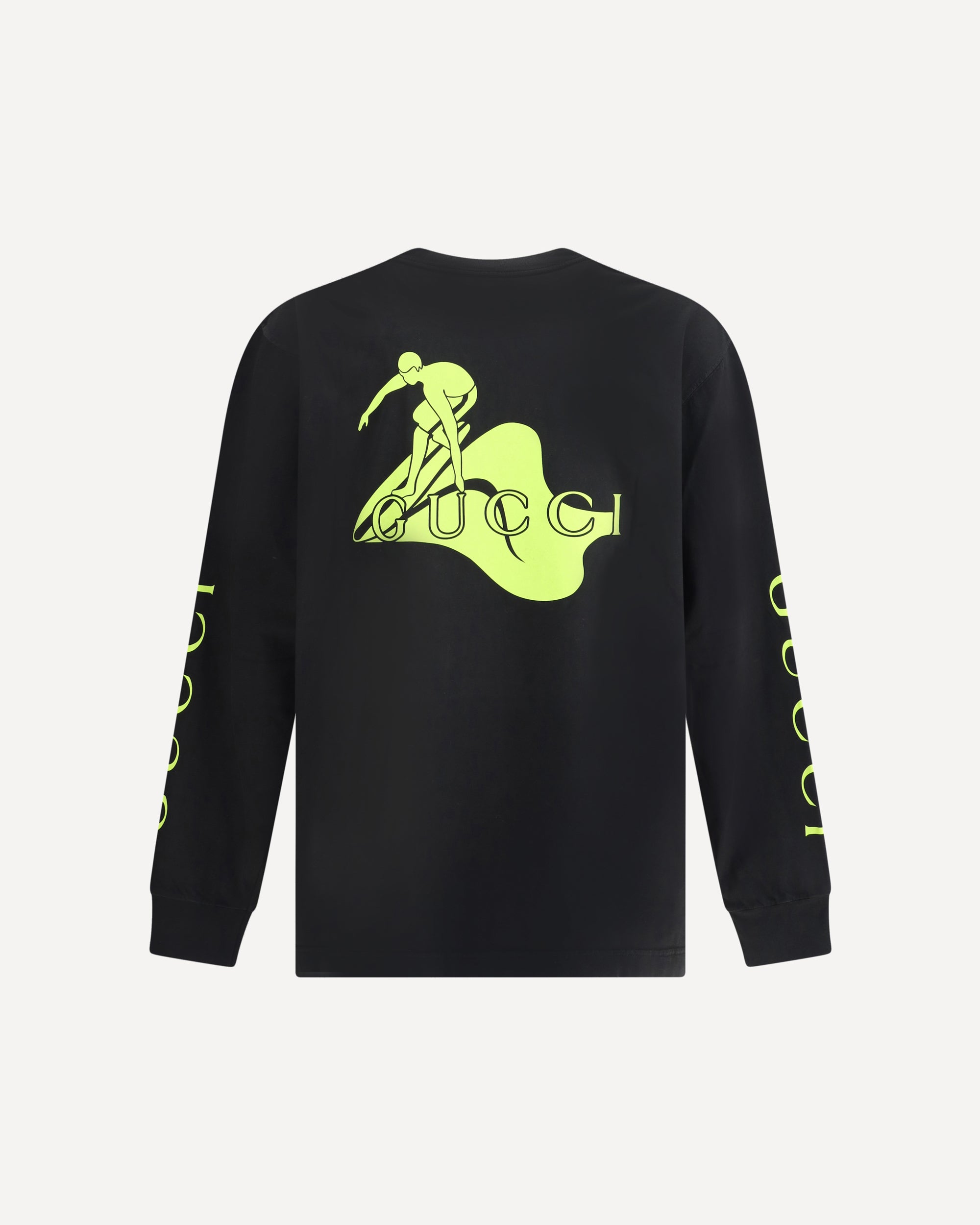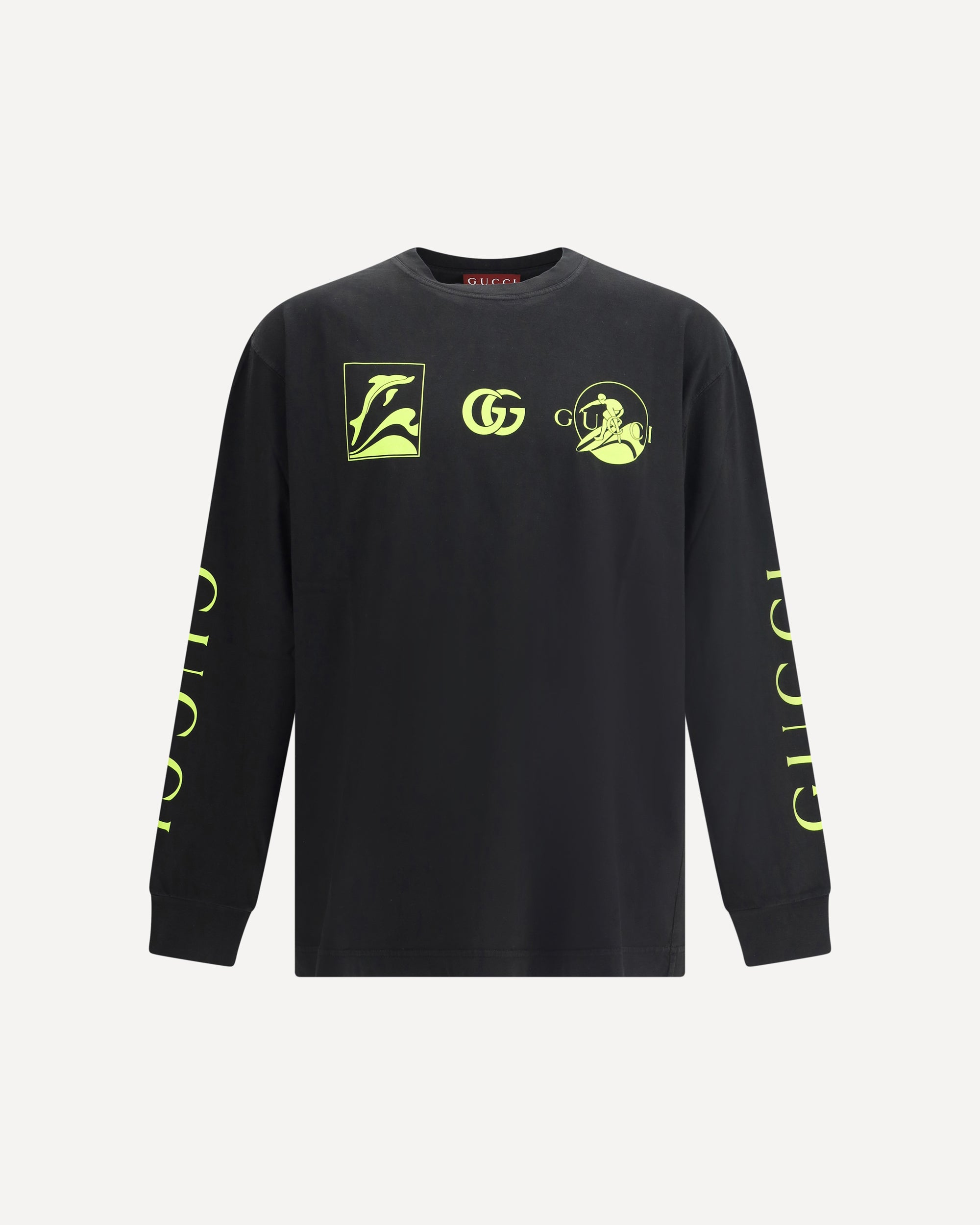 Cotton Long Sleeve Jersey by Gucci, an item with a sophisticated and contemporary design. The ribbed crew neck ensures a comfortable fit, while the ribbed cuffs complete the look with a touch of style. The brand's iconic monogram is featured on the contrasting front, back and sleeves, adding a distinctive and recognizable detail. A versatile and on-trend piece, perfect for a casual yet classy look.