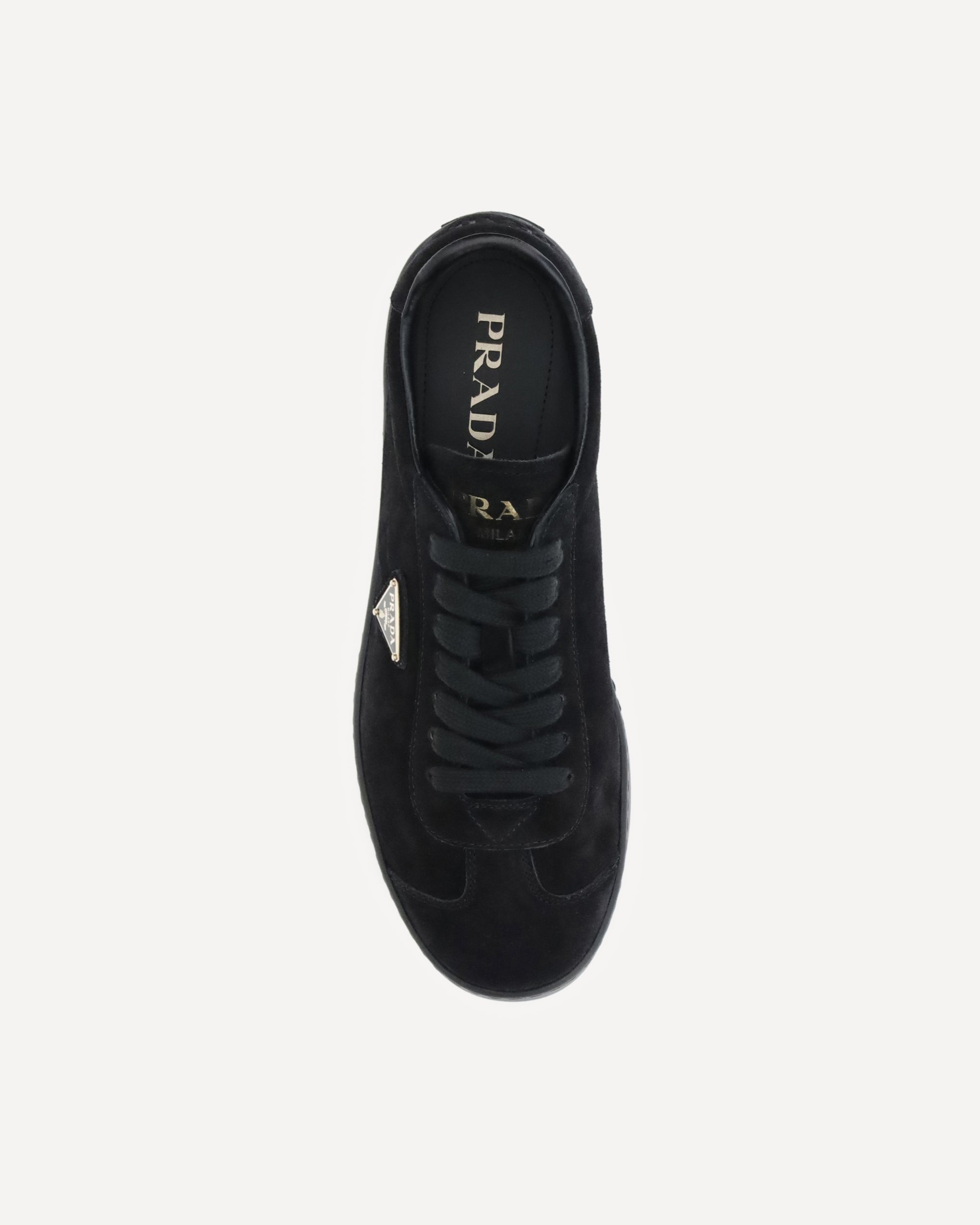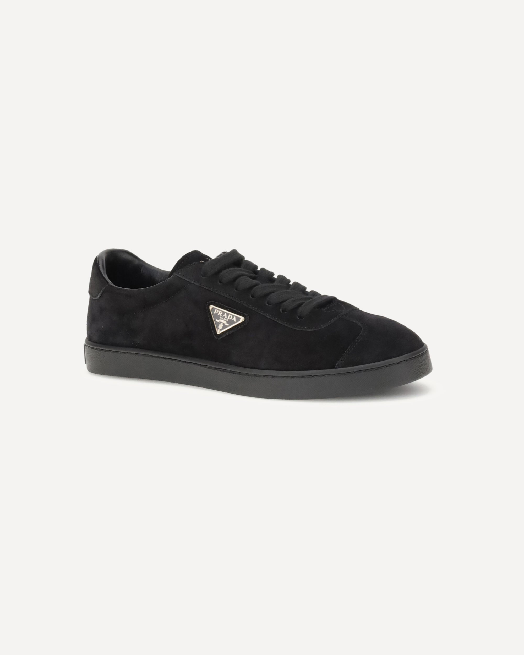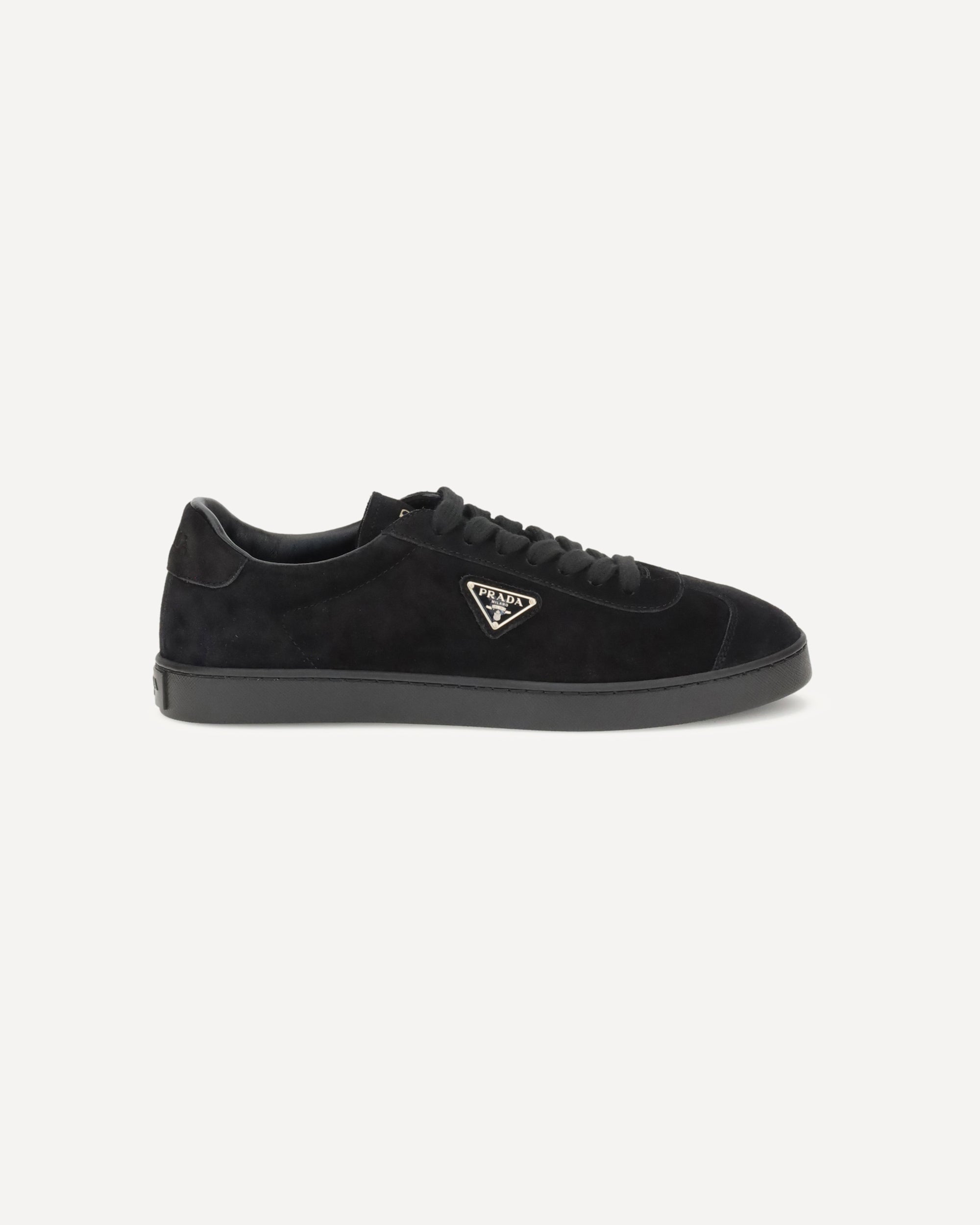 The suede Sneakers by Prada combine contemporary style with everyday comfort. Featuring a flat rubber sole and round toe, they are distinguished by the iconic triangular side-applied plaque and tone-on-tone logo on the back, adding a distinctive and refined touch to the design.