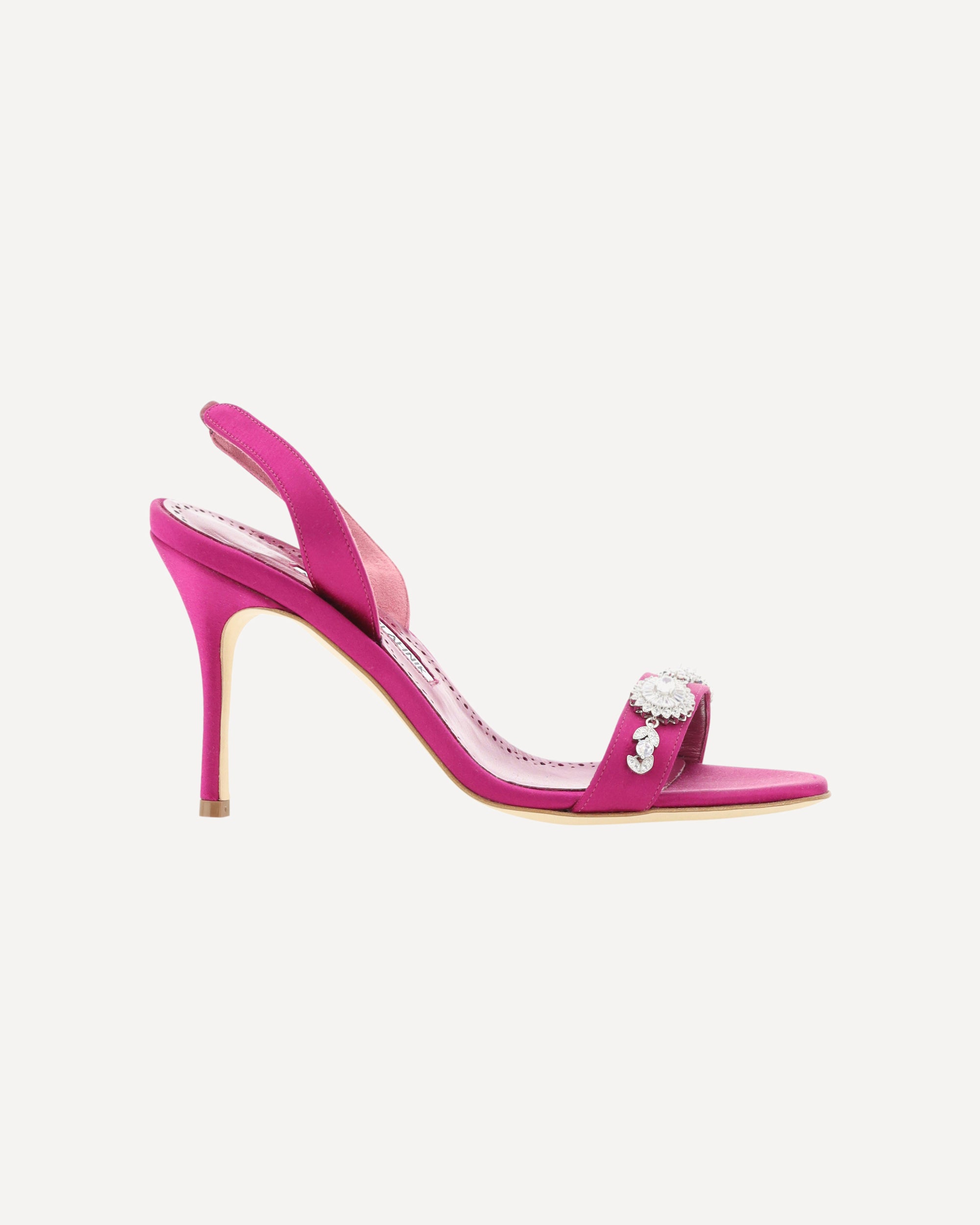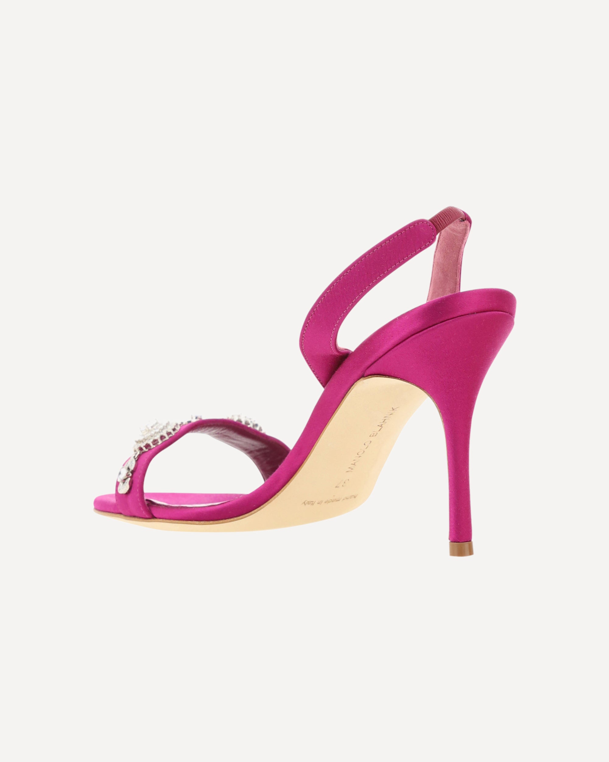 Lamisan Sandals by Manolo Blahnik, silk satin upper, slingback on elastic heel, jewel-covered buckle applied on back, leather stiletto heel.