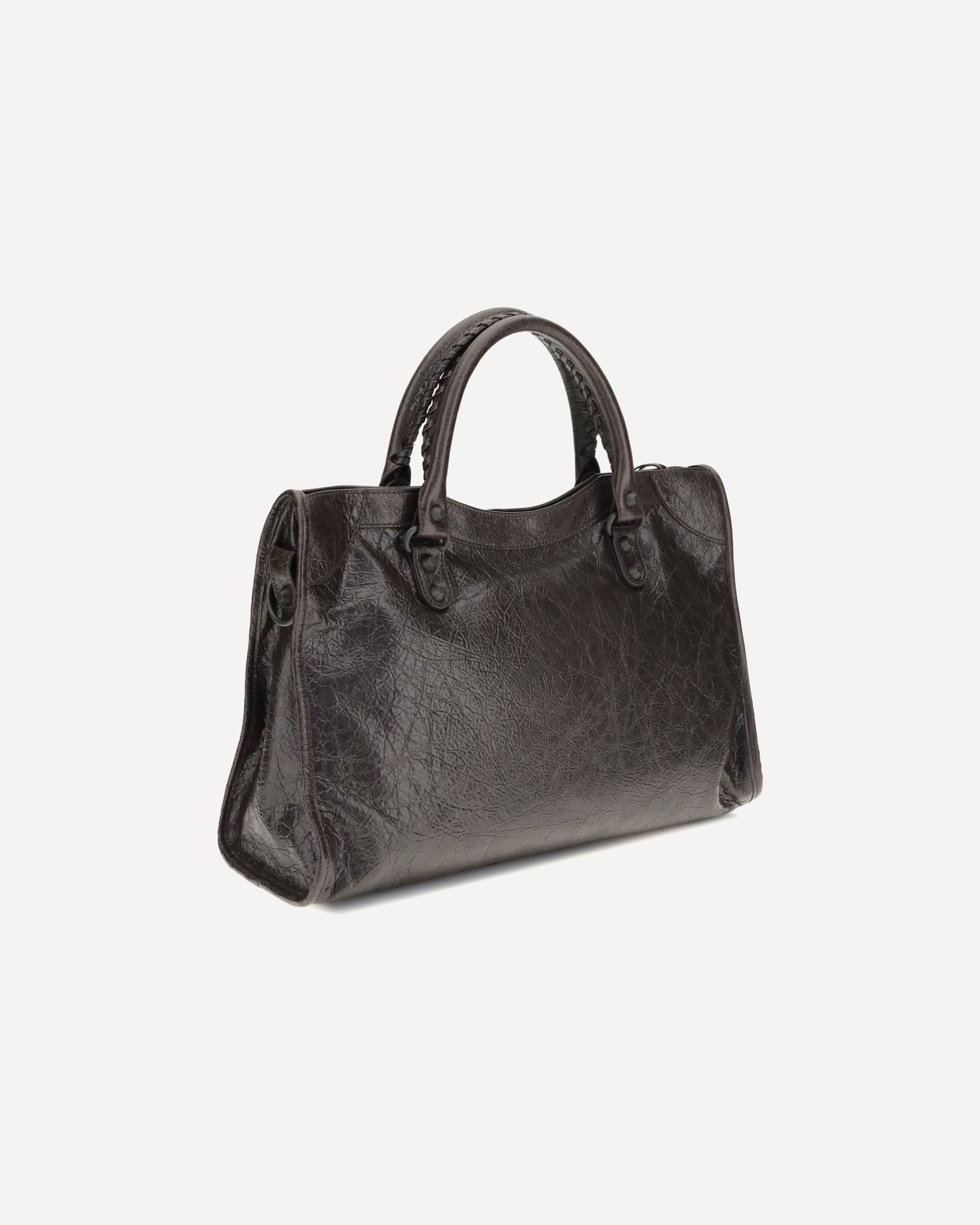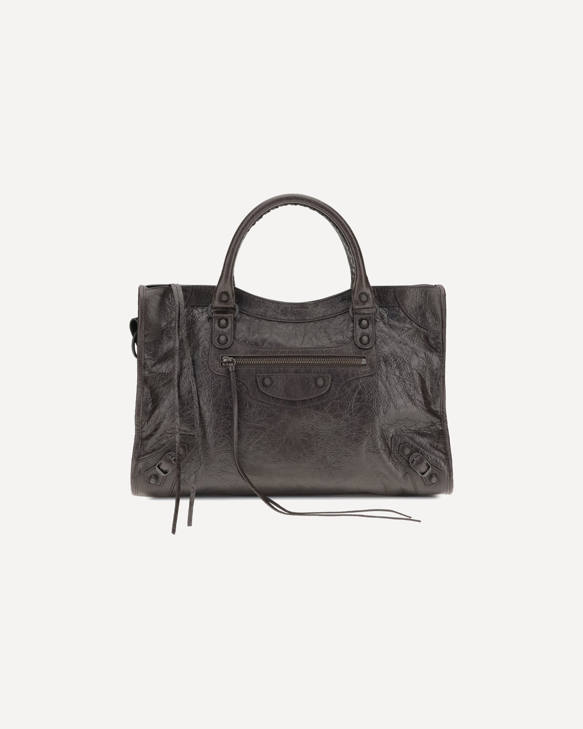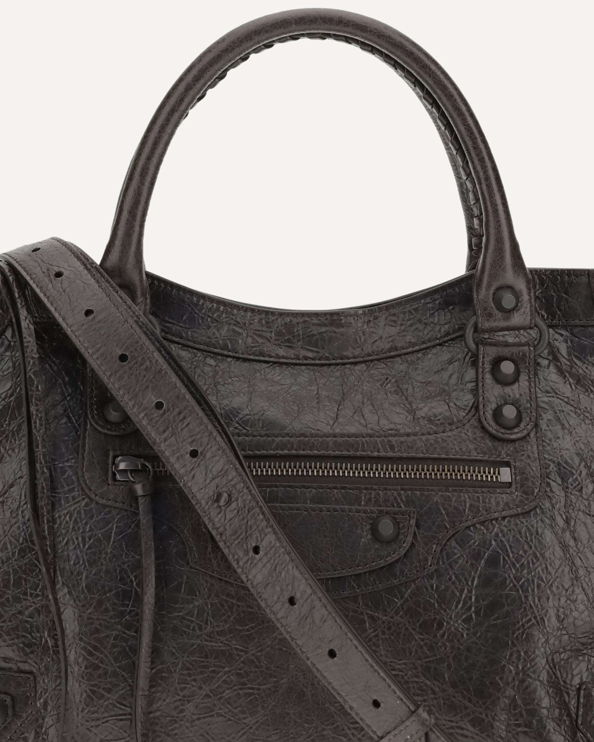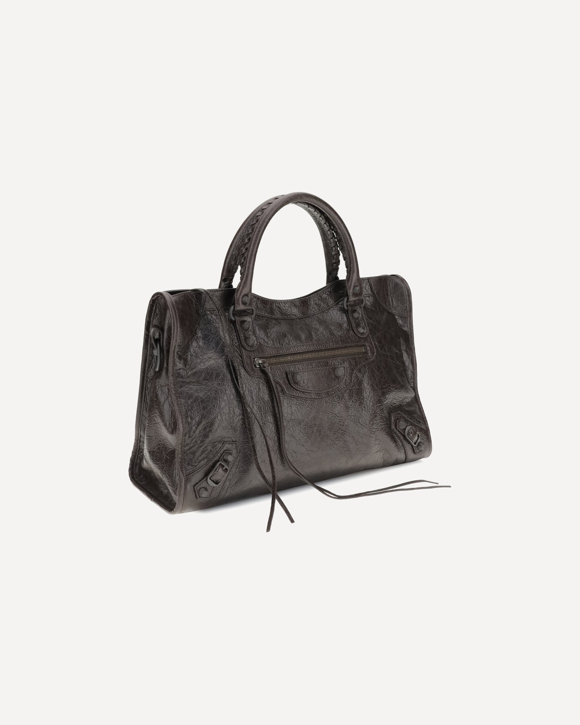 The Le City medium Shoulder Bag by Balenciaga is a high-class item made of fine lambskin leather that combines elegance and functionality. The two hand-woven leather handles lend an artisanal and refined touch, while the adjustable and removable shoulder strap allows it to be worn with versatility, either by hand or on the shoulder. The zippered closure and knotted leather zipper pull add distinctive details, while the front zippered pocket offers convenience for quick access to essentials. Inside, a zippered pocket and cotton canvas lining provide organization and durability. Brass trim completes the look, making this bag a luxurious accessory.