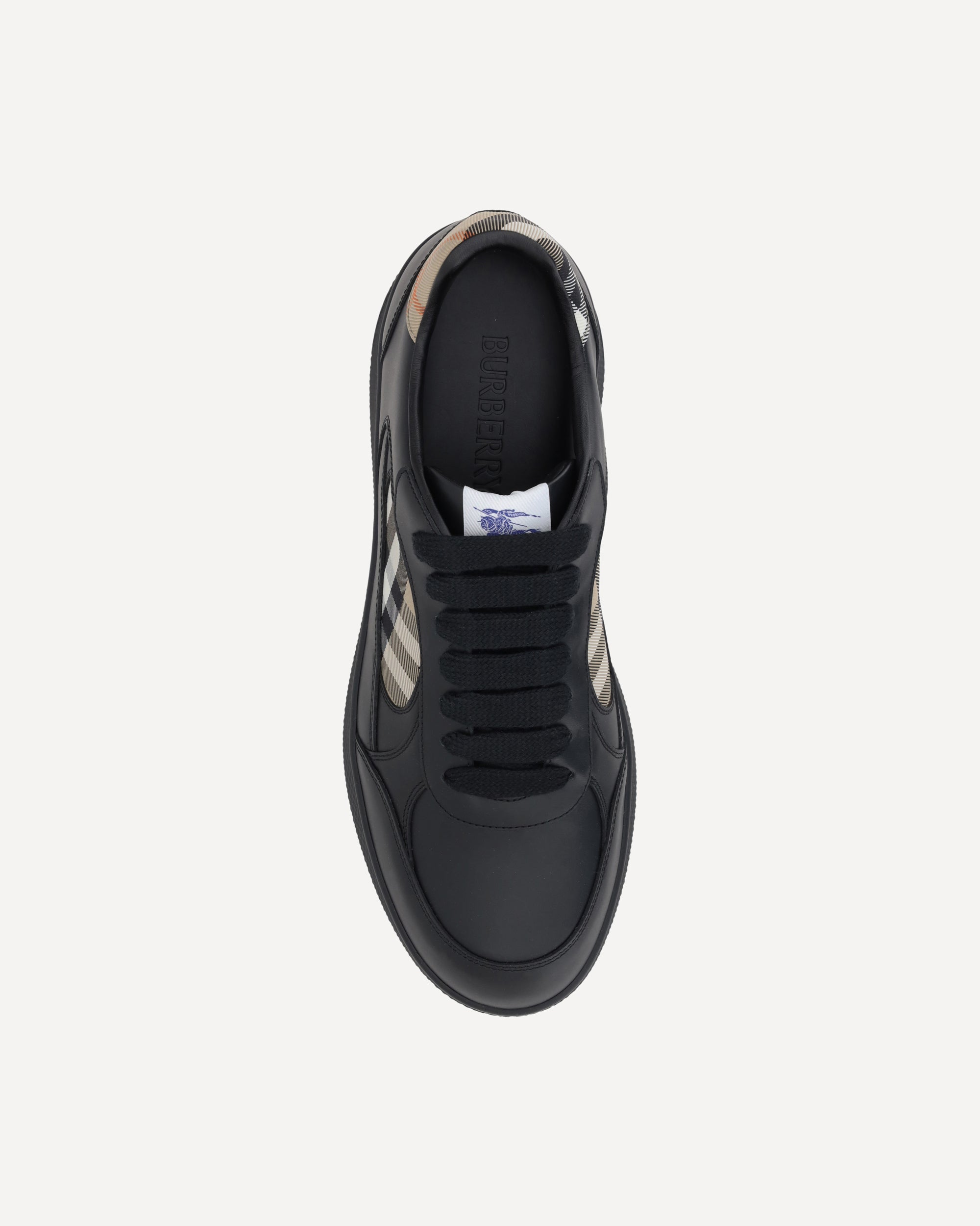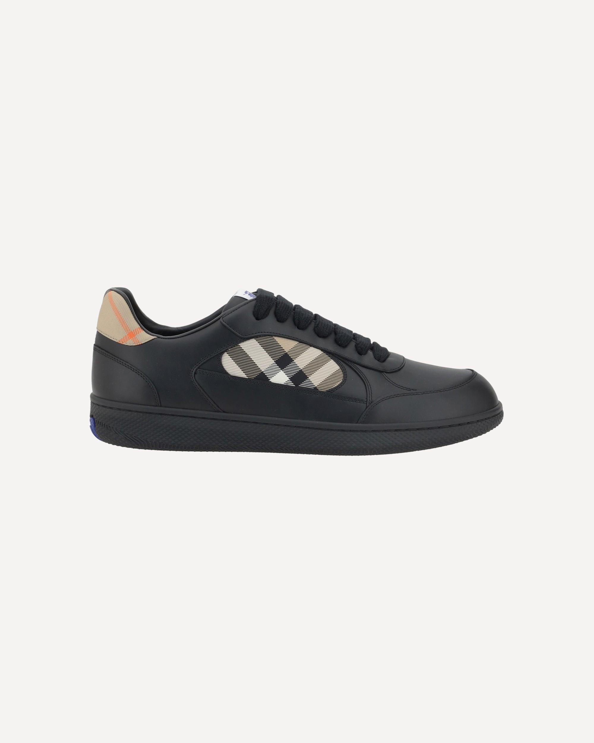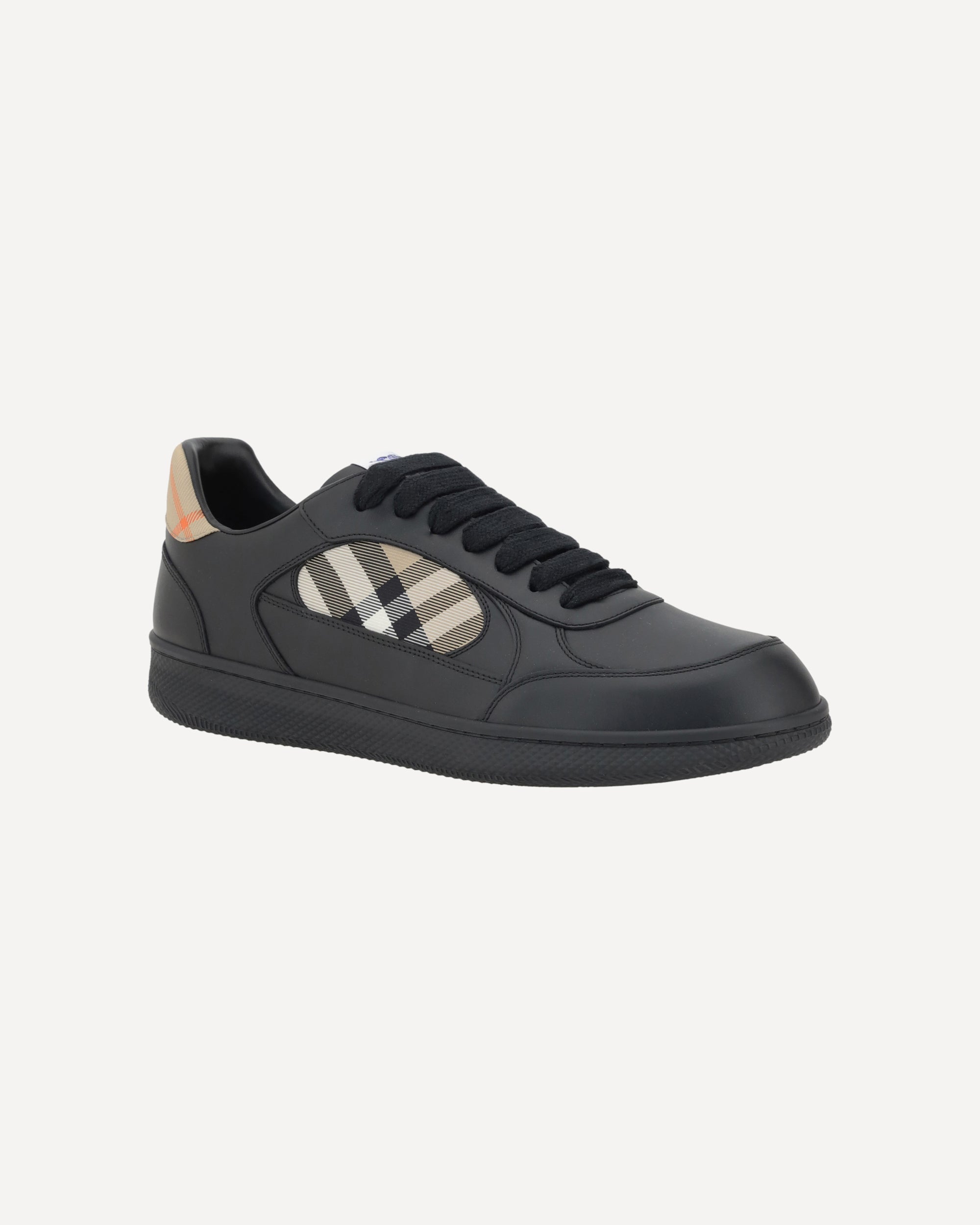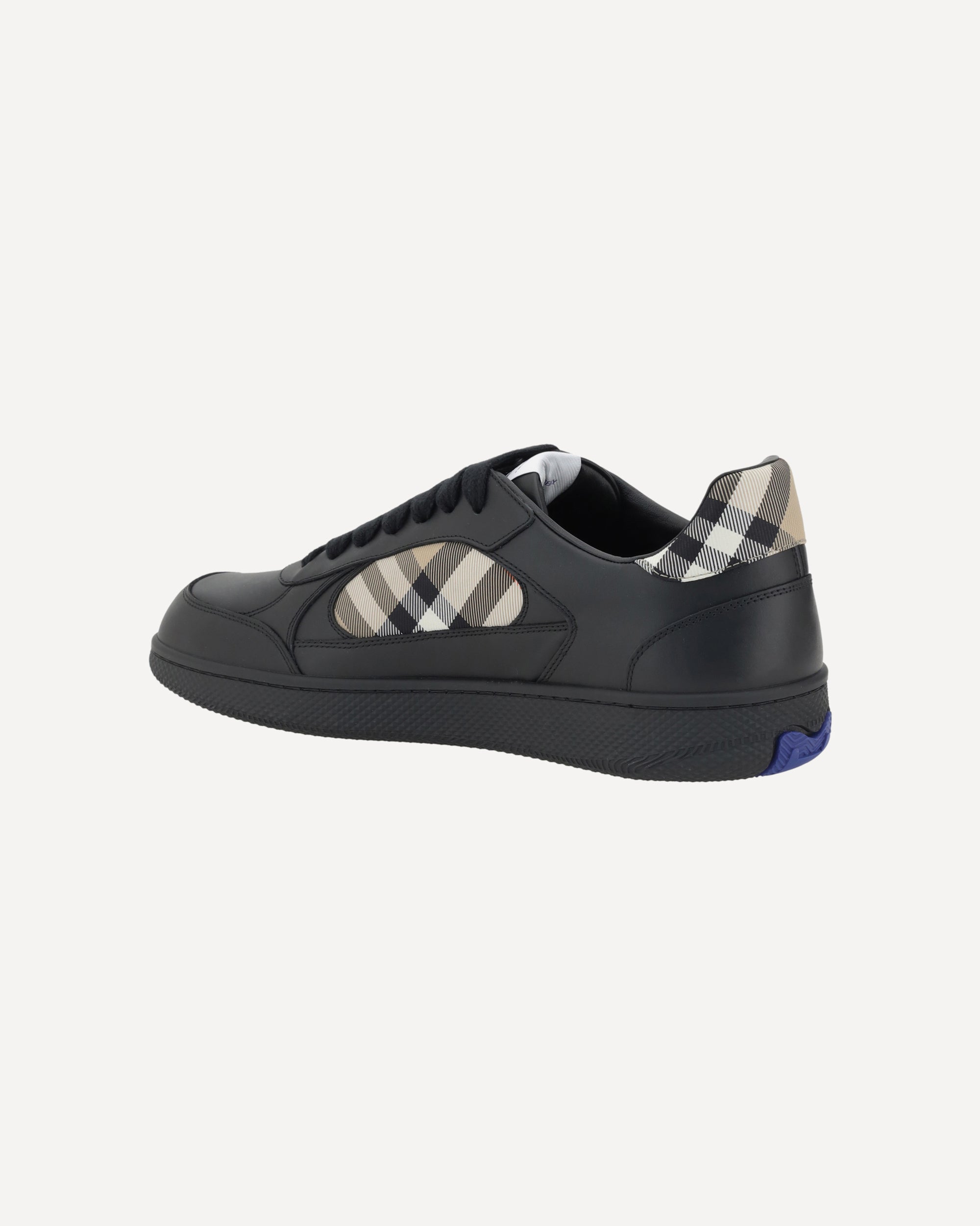 Burberry's Leather Sneakers combine elegance and comfort with a lace-up closure and contrasting side panel with classic Burberry Check. The model is embellished with an Equestrian Knight Design label and contoured soles with archival Burberry lettering, adding a distinctive and iconic touch. Perfect for casual-chic style.