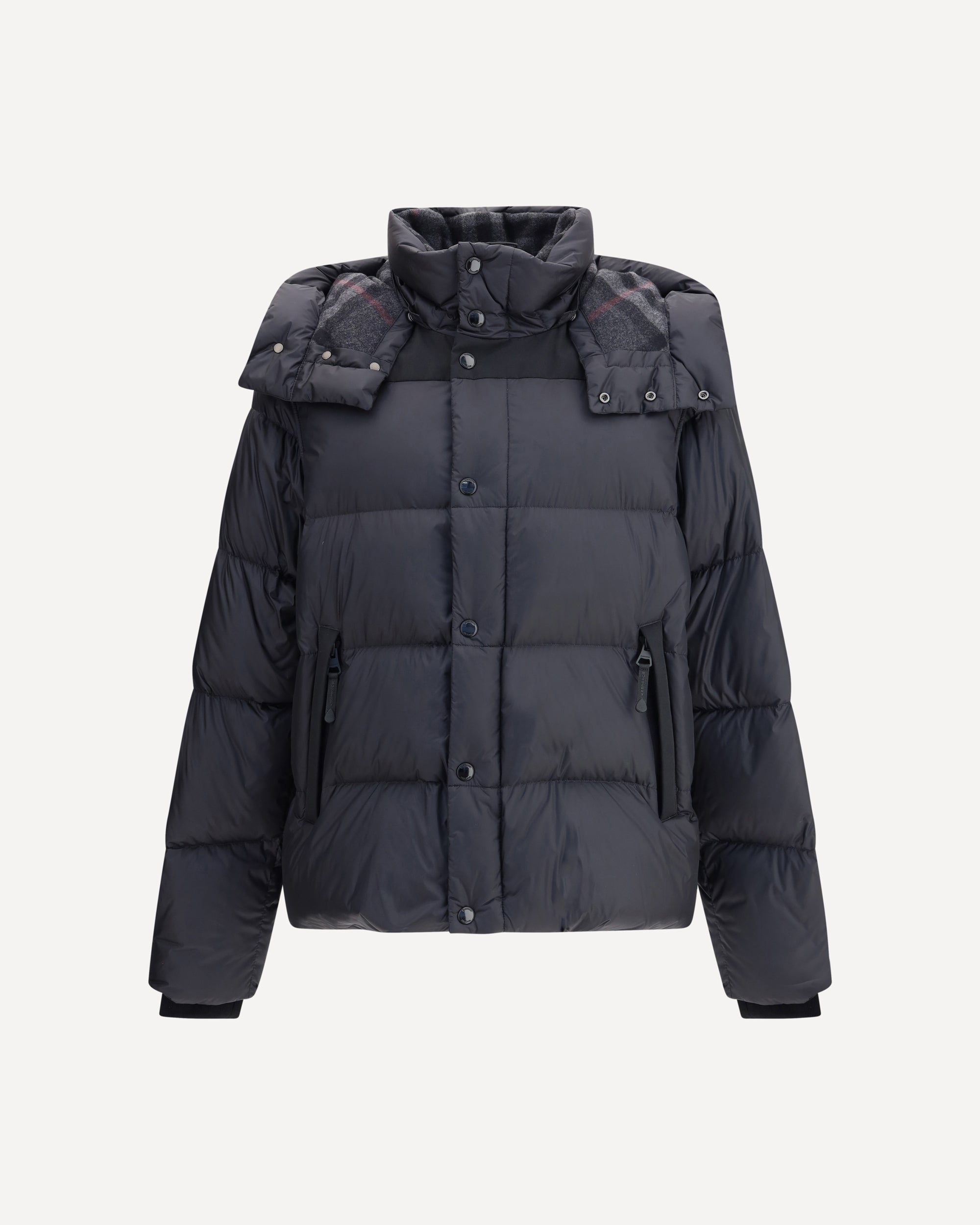 Burberry's Down Jacket is a practical and refined garment with detachable sleeves that turn it into a vest. It has a comfortable fit and iconic details such as the hood and collar lined with Burberry Check wool and cashmere. The closure is zipper and snap buttons, the side pockets are zippered, and the detachable hood has an adjustable drawstring. Completing the look is the silicone label on the sleeve with embossed Burberry logo.