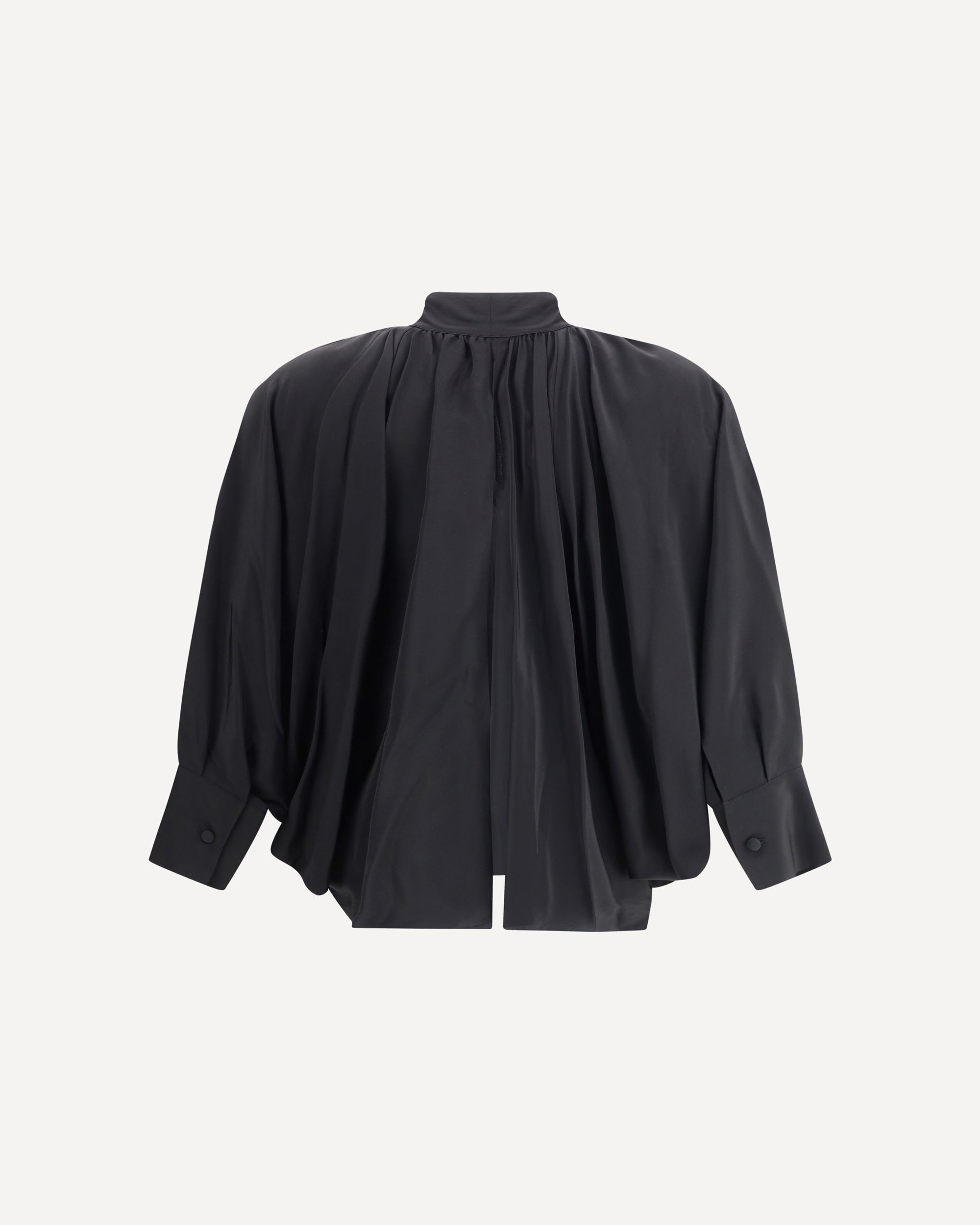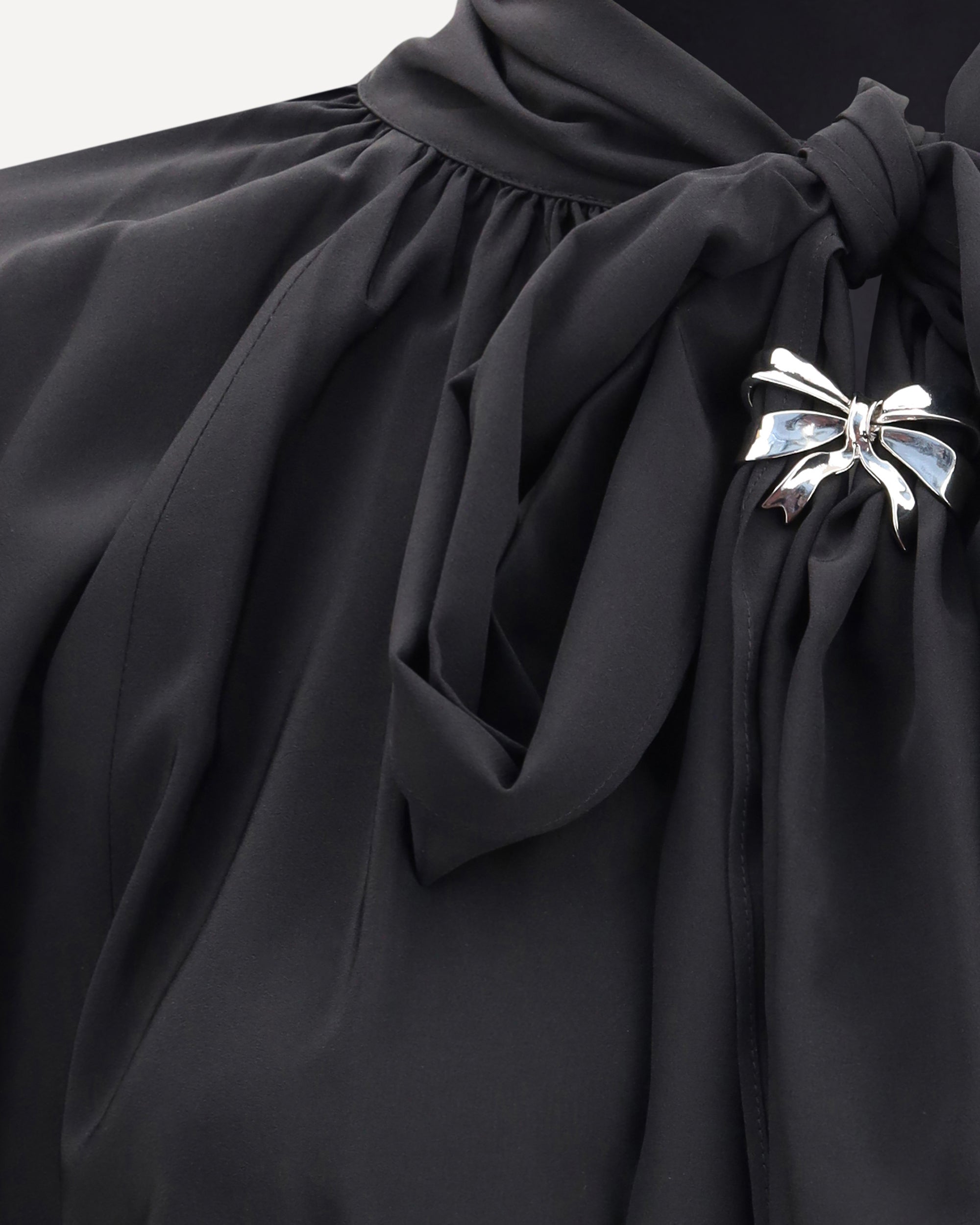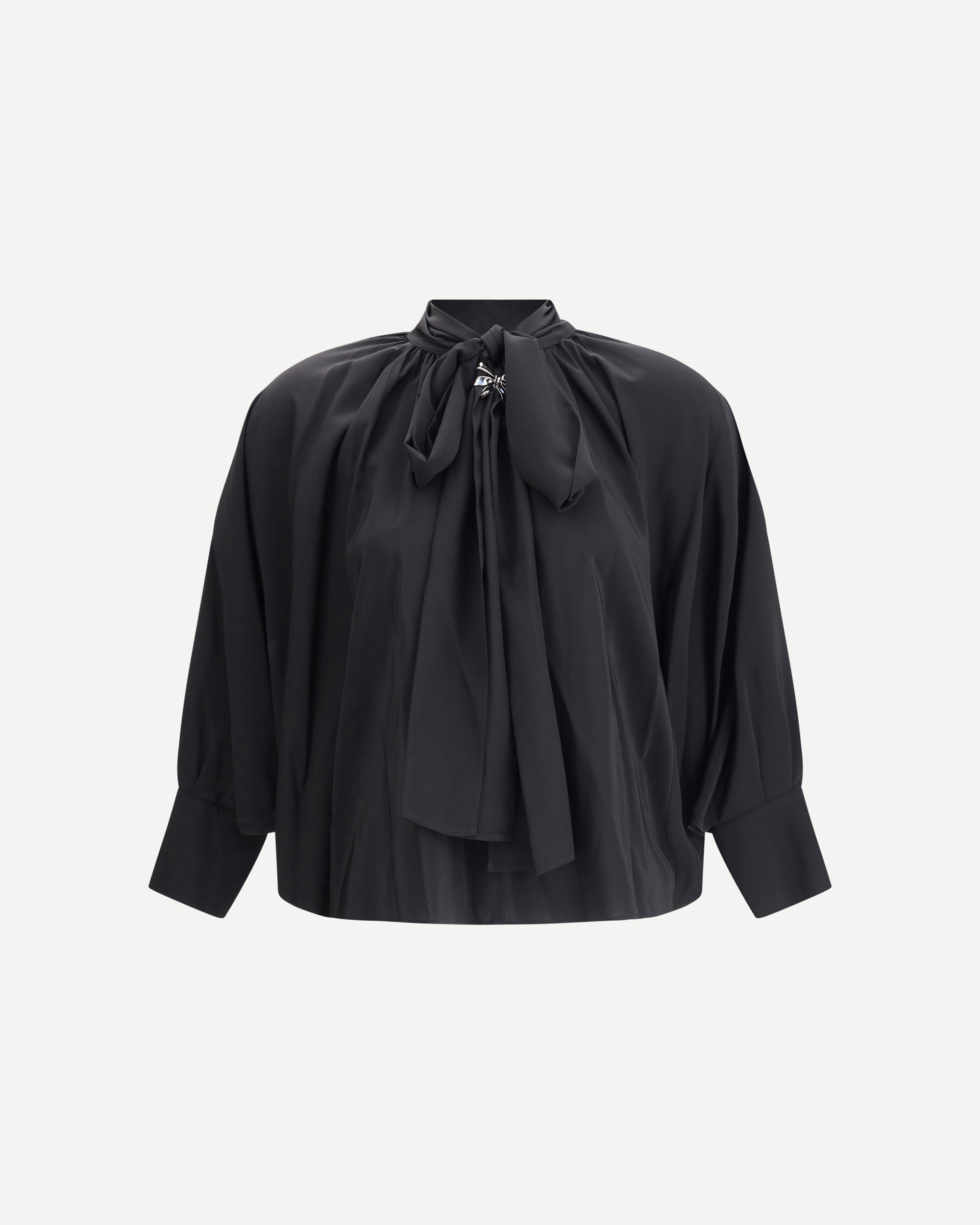 The Leonida silk Blouse features a loose, flowing fit with batwing raglan sleeves that add lightness to the design. The V-neckline is enhanced by a bow-tie scarf collar, while the high cuffs feature an elegant covered side button. At the back, a center-cut pattern and a longer asymmetrical hem complete the garment, which is embellished with a removable metal jewel loop.