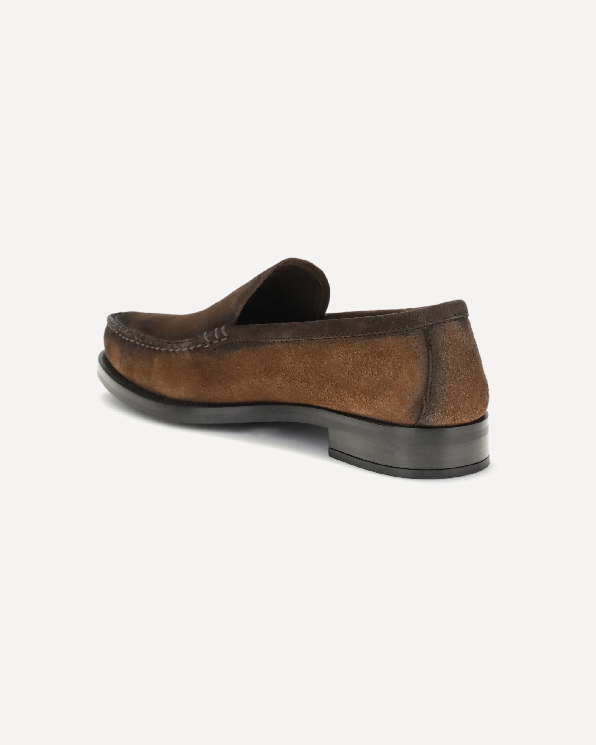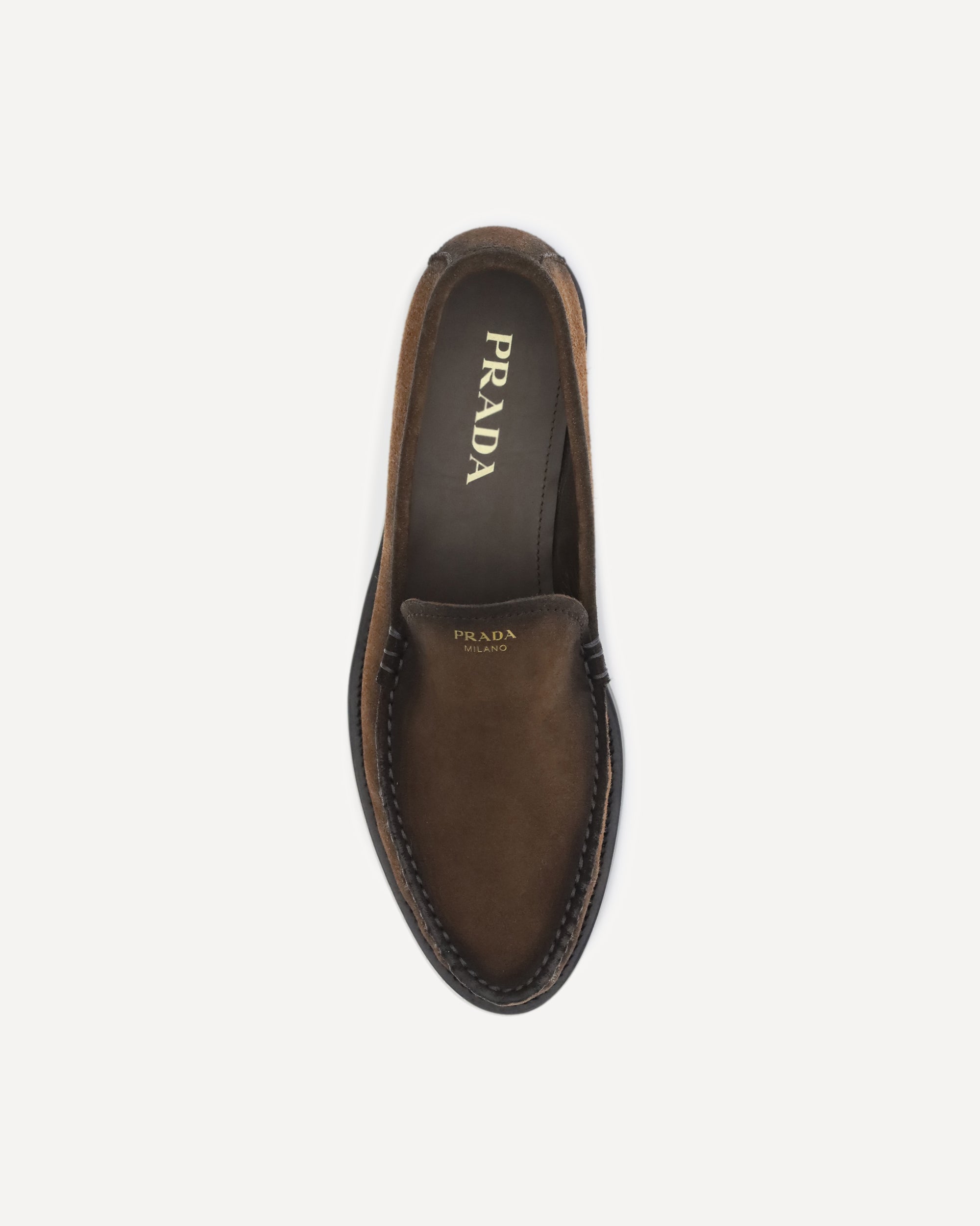 The Loafers by Prada crafted from vintage-effect suede leather, featuring a laminated logo printed on the vamp. Designed with a rounded toe and an internal printed logo, they express a timeless and elegant aesthetic.