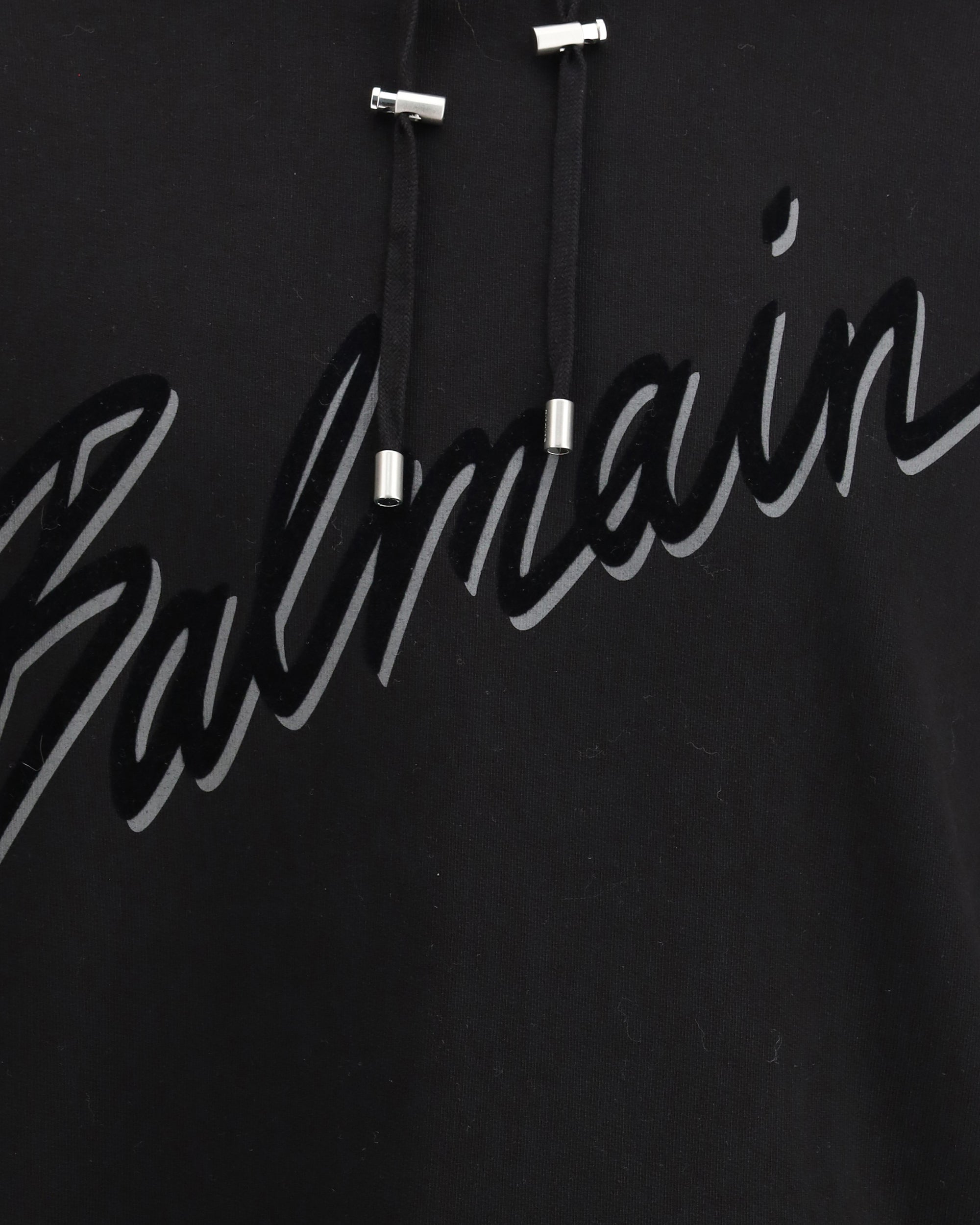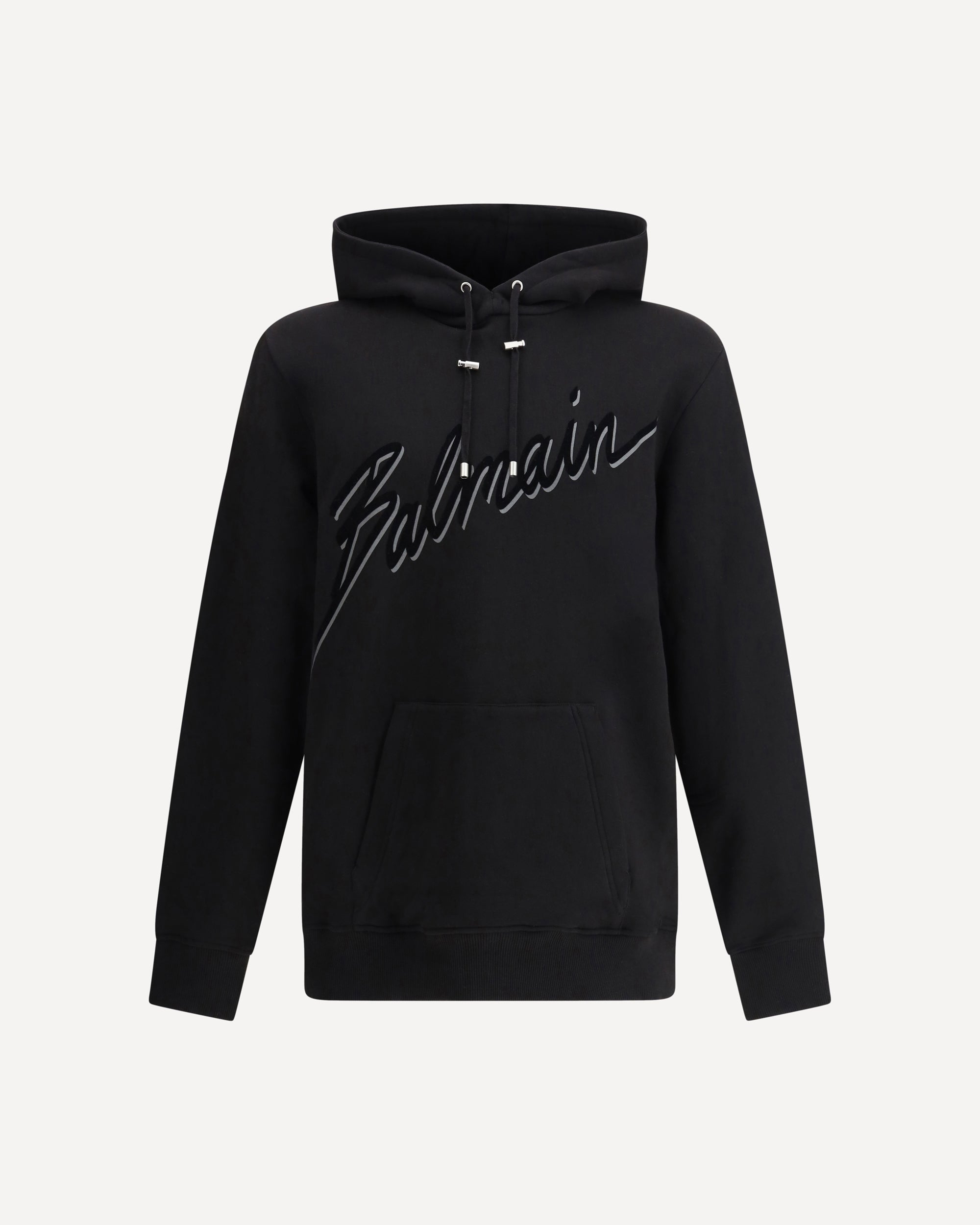Balmain's cotton hoodie is a casual and refined piece of clothing. It features an adjustable drawstring hood and a pouch pocket on the front for practicality. Ribbed hems and cuffs ensure a comfortable fit. The brand's iconic logo, printed on the front, adds a distinctive touch. A versatile garment perfect for a high-class streetwear look.