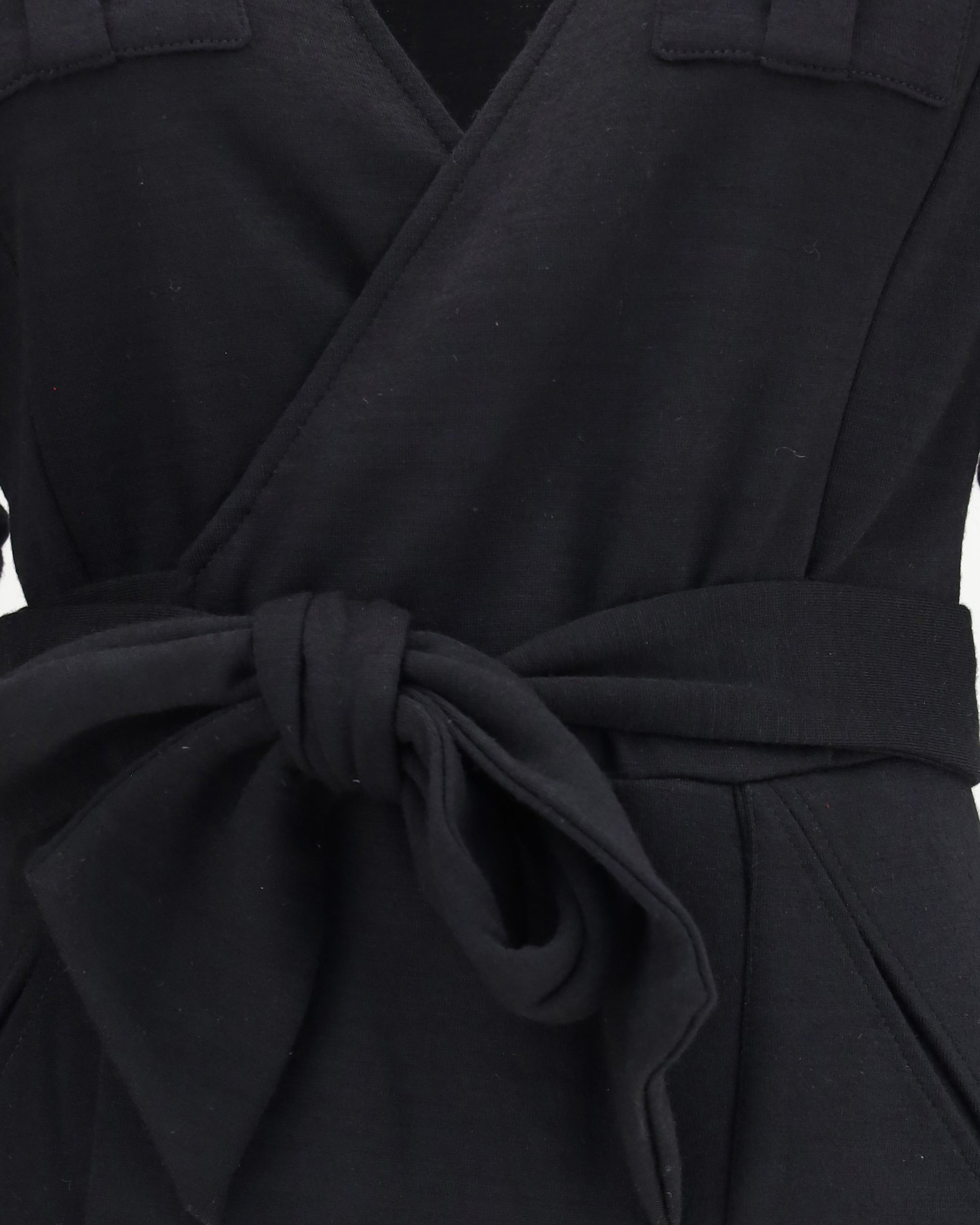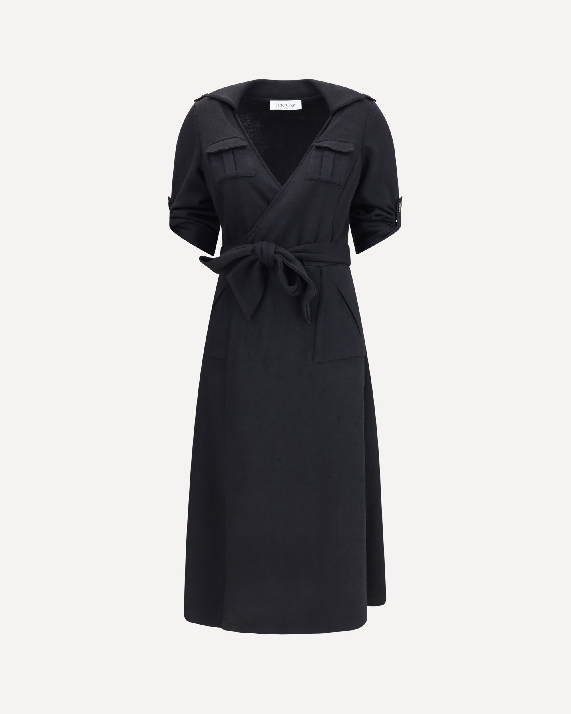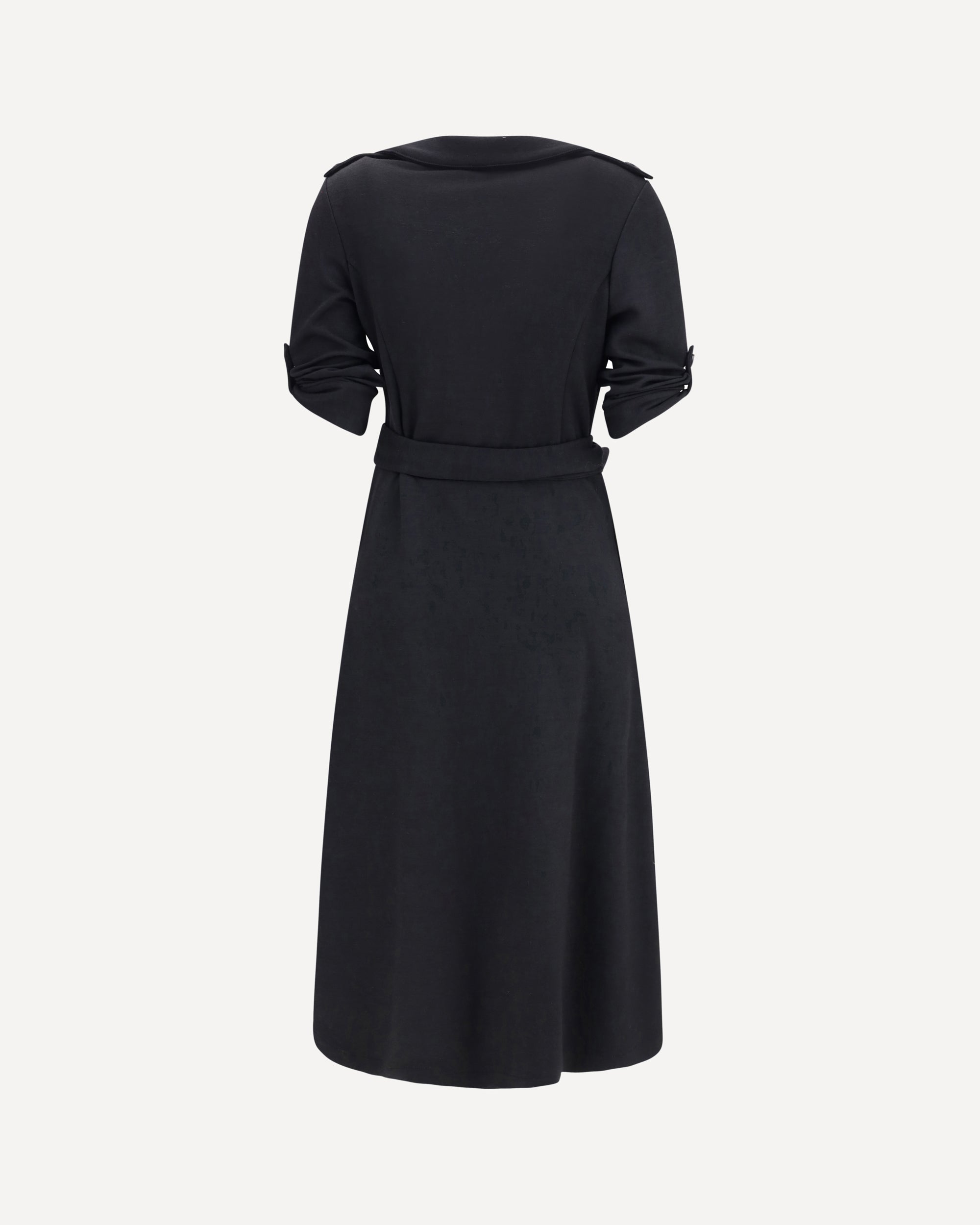This jersey Dress by Aftercoat interprets contemporary elegance with character. The style features four front pockets—two upper and two lower—enhanced by functional buttoned flaps on the shoulders and sleeves. The classic collar and matching fabric band closure complete the design, highlighting the tailoring quality and refined details.