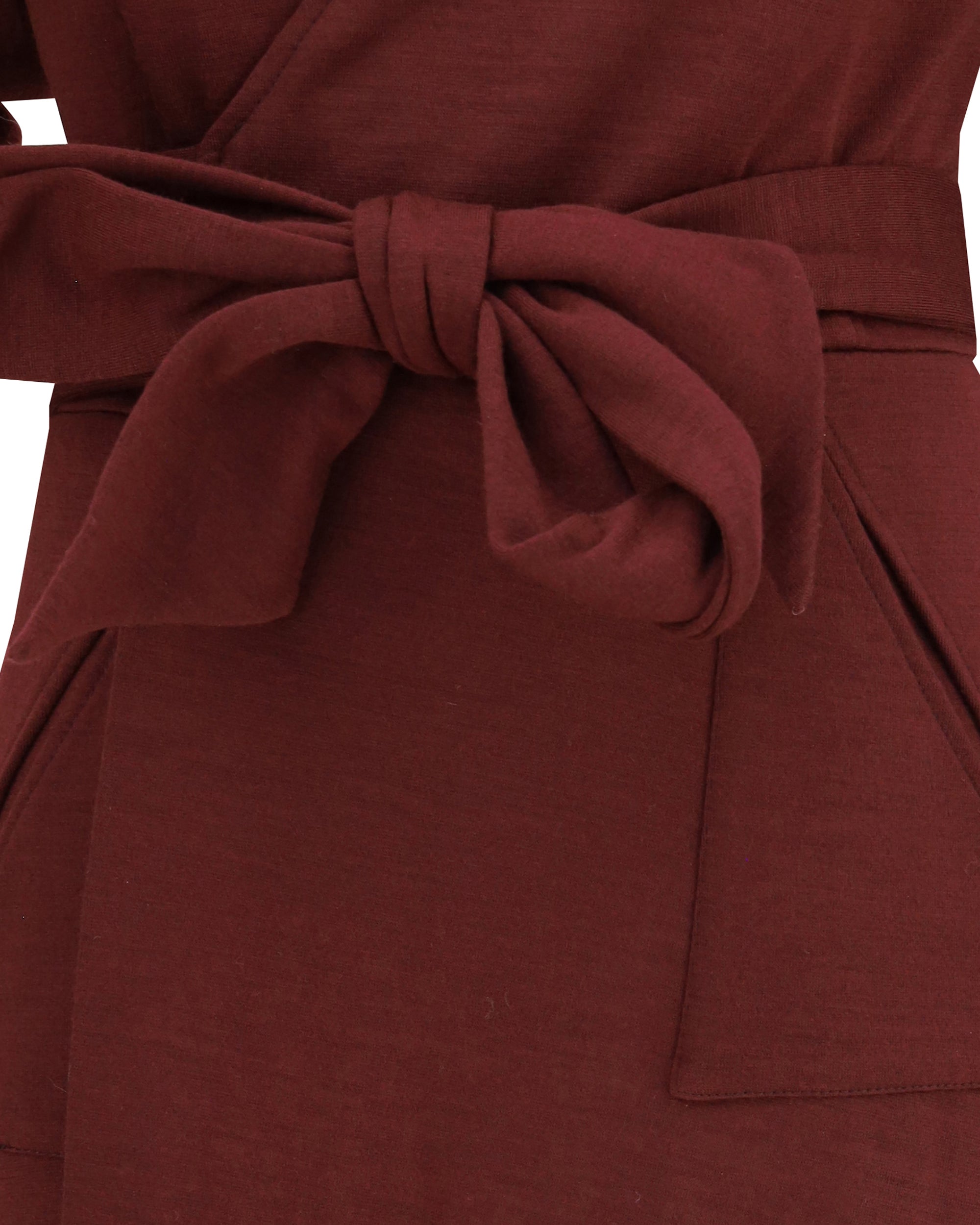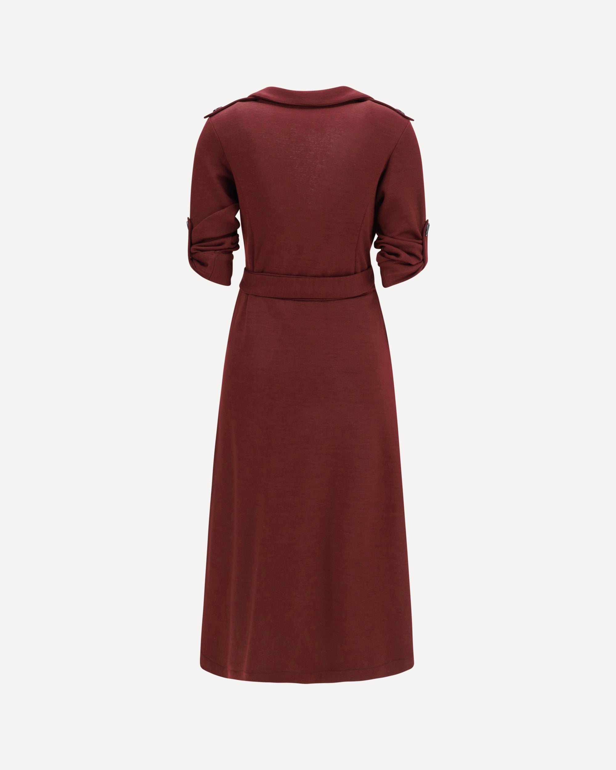 This jersey Dress by Aftercoat interprets contemporary elegance with character. The style features four front pockets—two upper and two lower—enhanced by functional buttoned flaps on the shoulders and sleeves. The classic collar and matching fabric band closure complete the design, highlighting the tailoring quality and refined details.