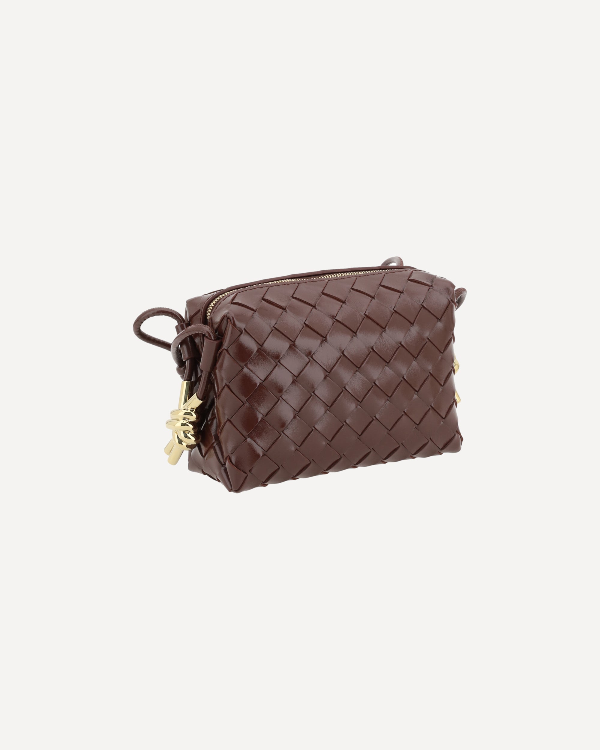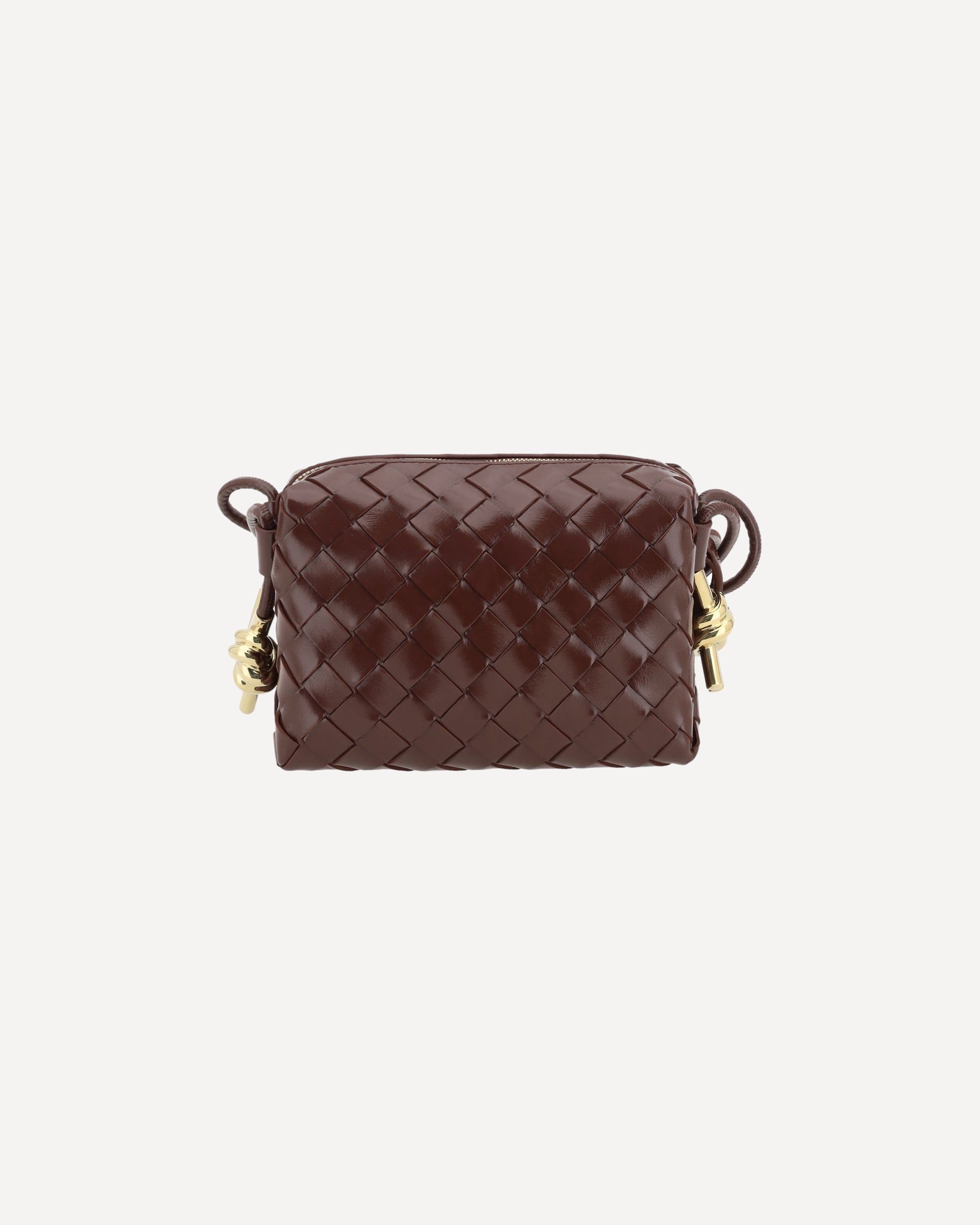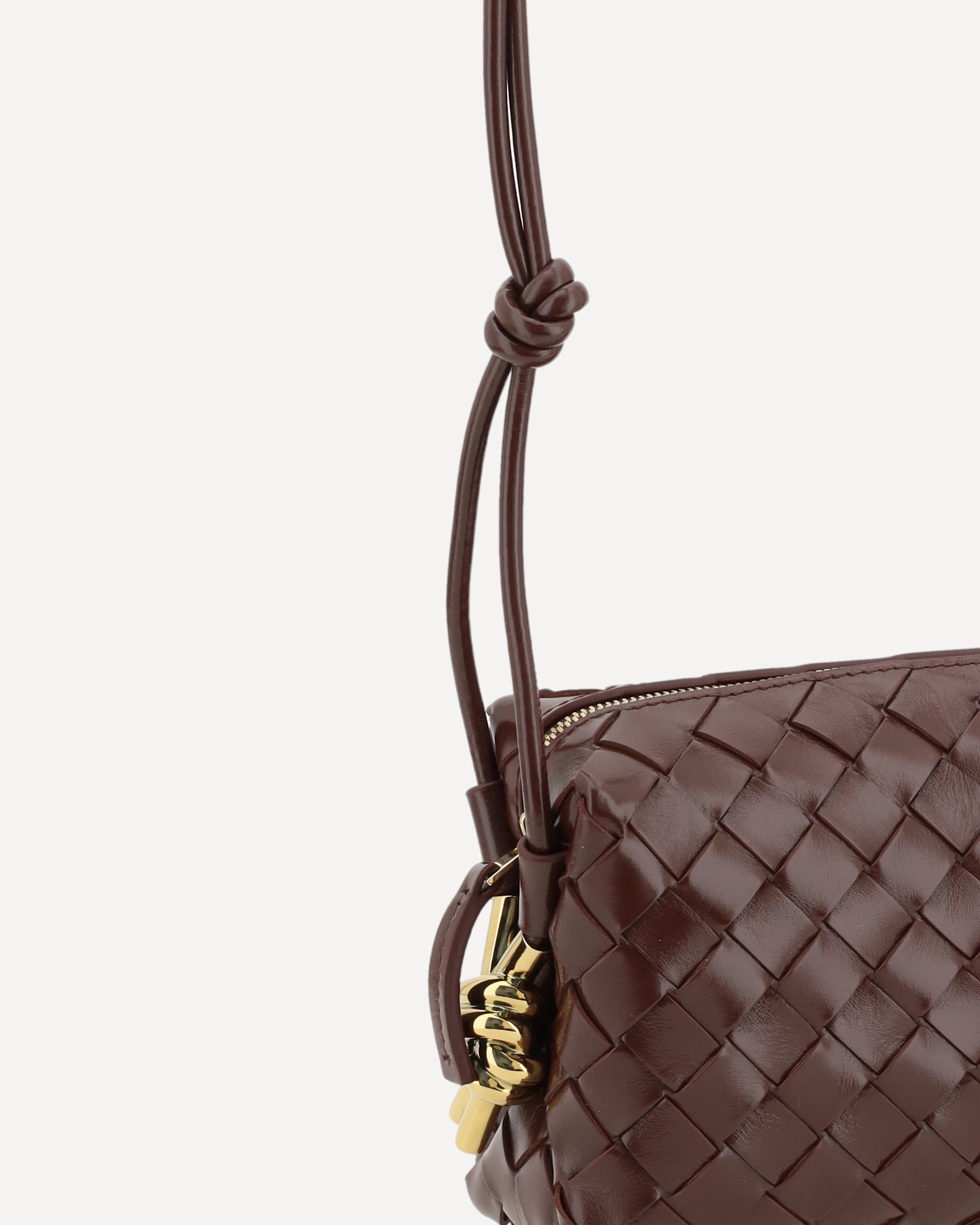 Calfskin Loop Shoulder Bag by Bottega Veneta, top zipper closure, brand's iconic woven design repeated all-over, slim leather shoulder strap with knotted detail at the base of the shoulder strap, precious antique brass knotted detail applied to the side panels.