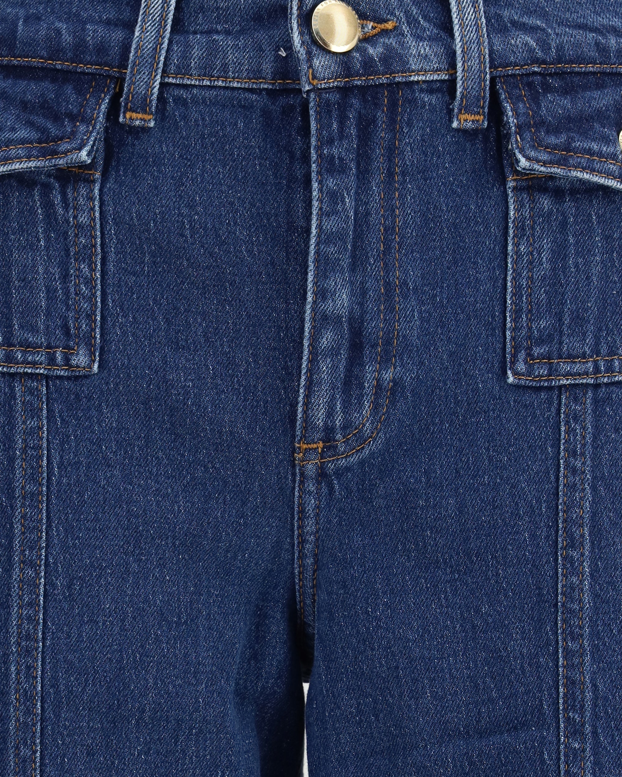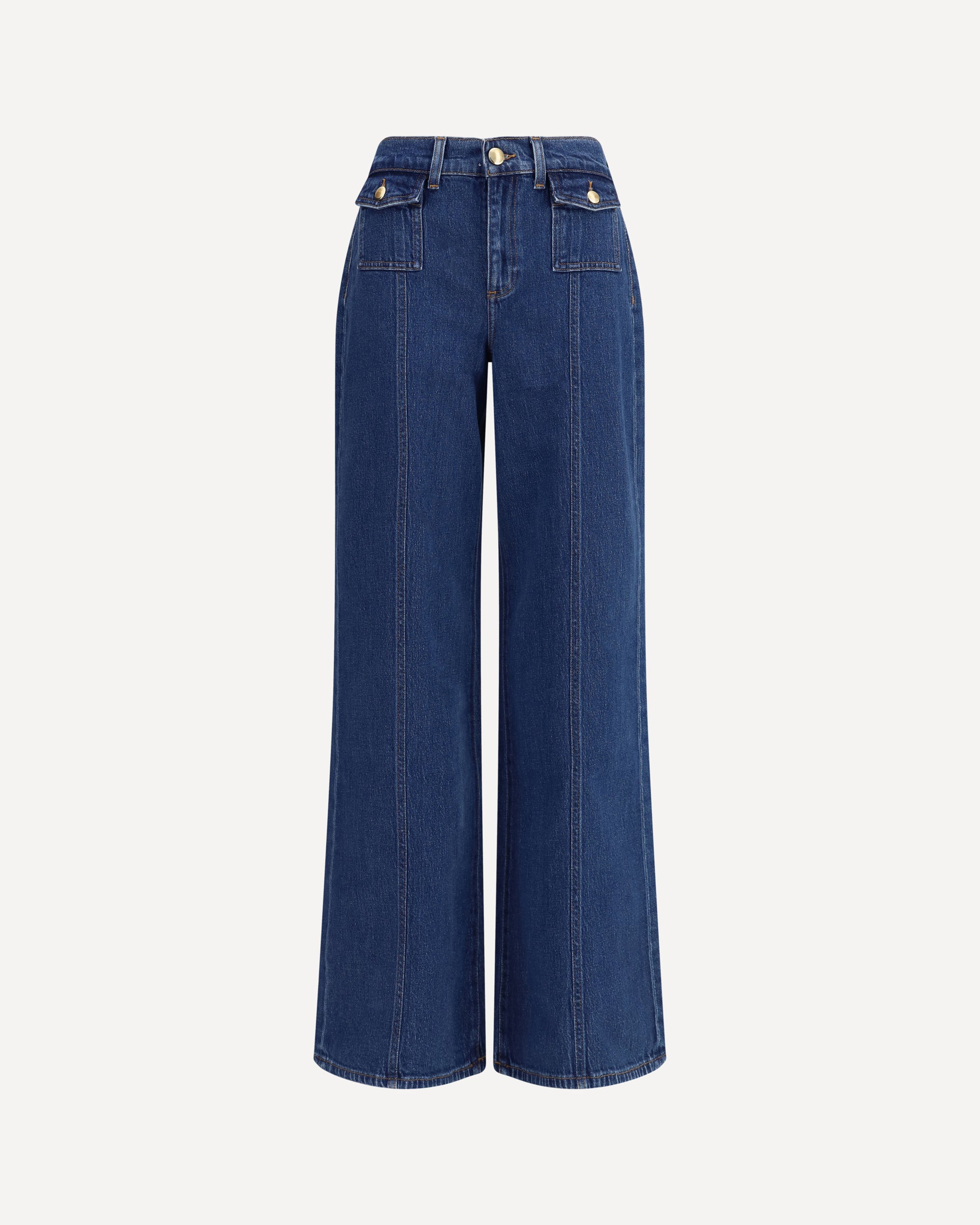 The Lotta High-Waisted Jeans by 7FOR All Mankind combine classic lines with refined details. The medium wash and vertical front seam elongate the silhouette, while the decorative flap pockets with gold finishes add a sophisticated touch. The zip and button closure ensure everyday practicality, complemented by a clean back pocket. The wide, full-length leg flows from the fitted waist and hips, offering natural elegance.