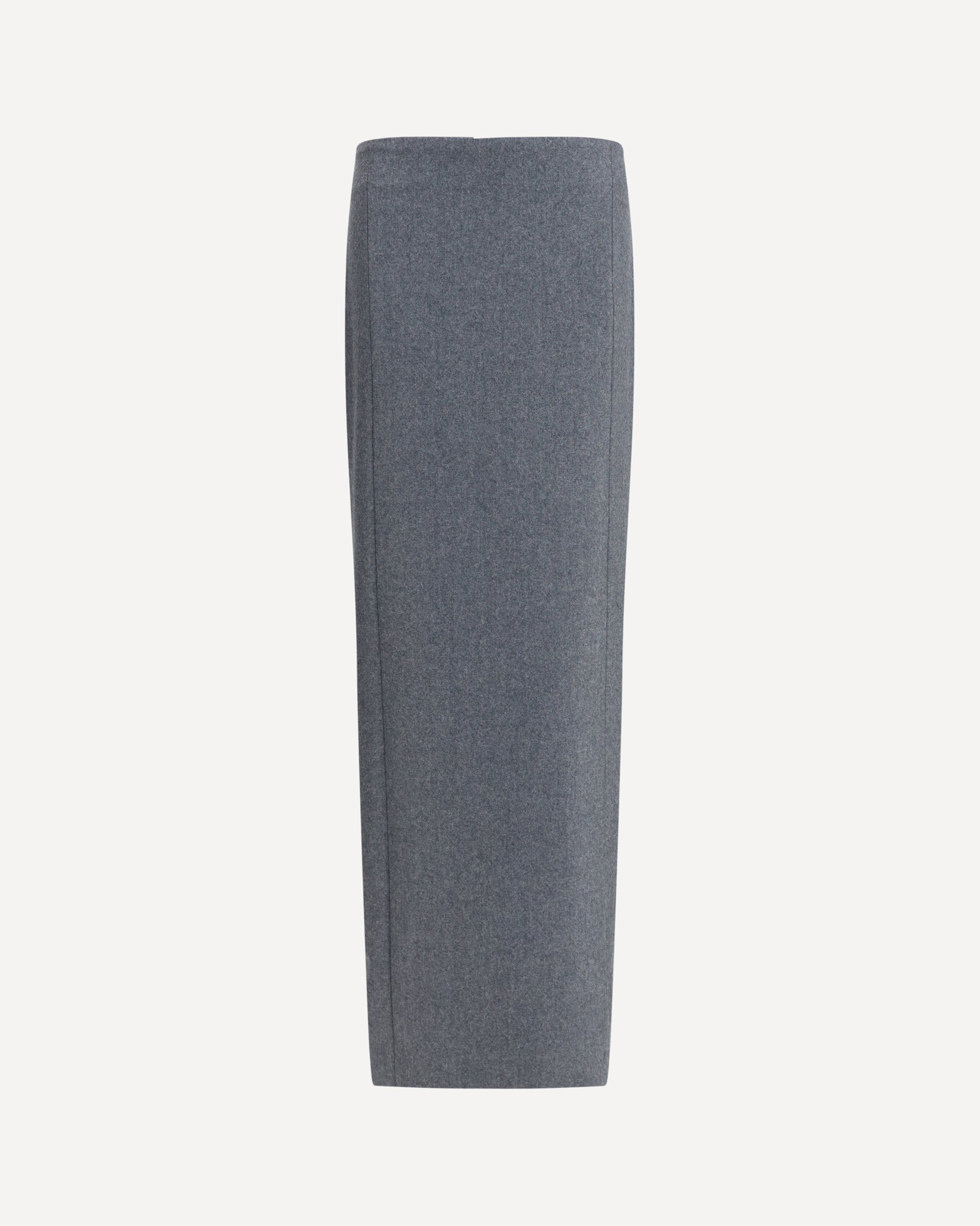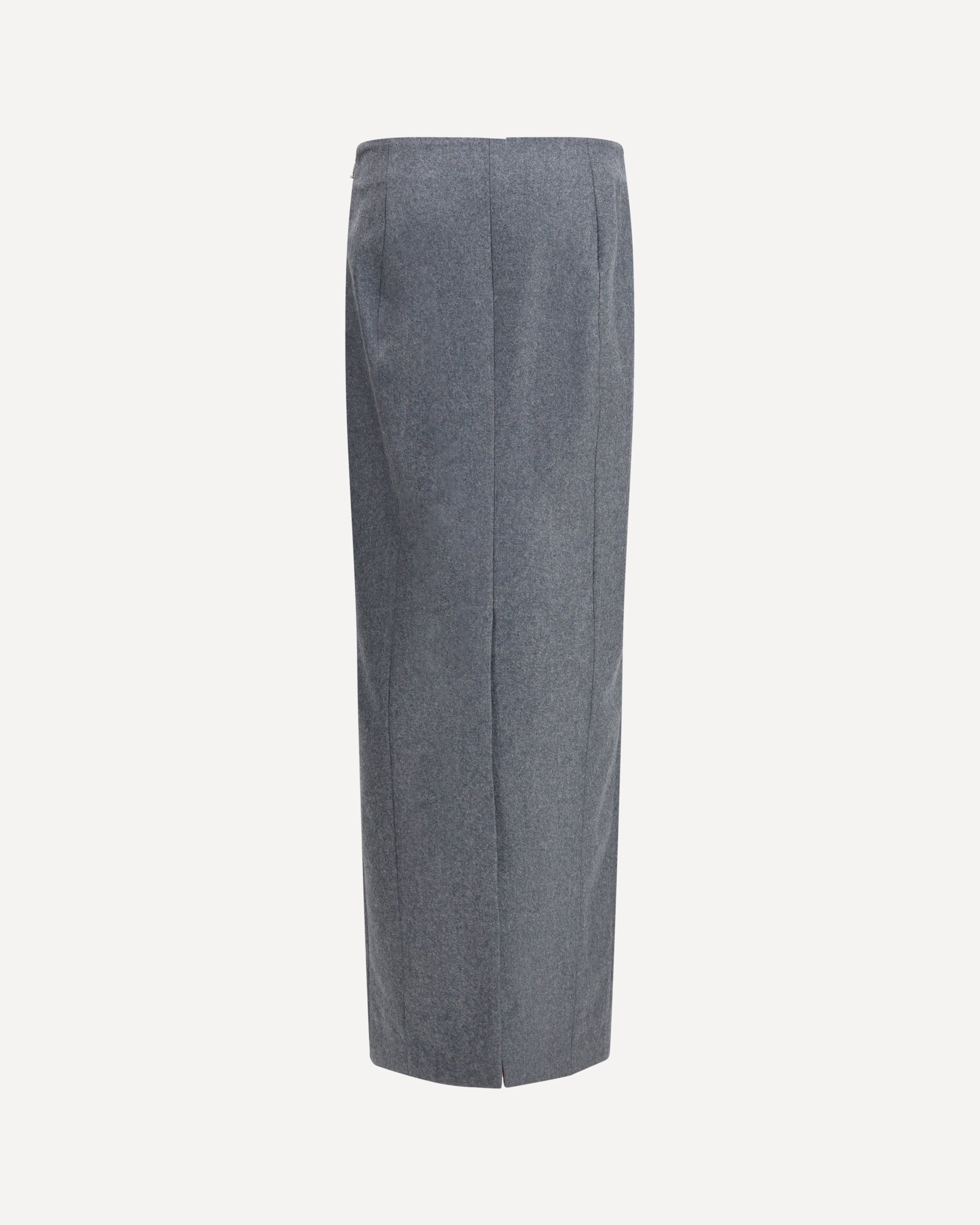 The high-waist pencil Skirt by Thom Browne reimagines a wardrobe classic with a striking twist. Cut to an ankle length with a sleek, elongated silhouette, it features a distinctive back opening — less a traditional slit, more an architectural cut-out — that adds structured refinement. A piece that marries tailored precision with modern sensibility, designed to enhance the figure through understated elegance.