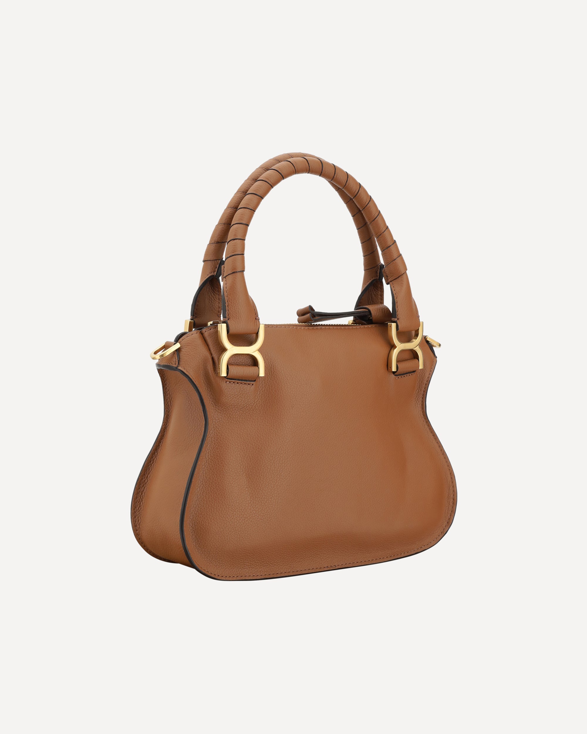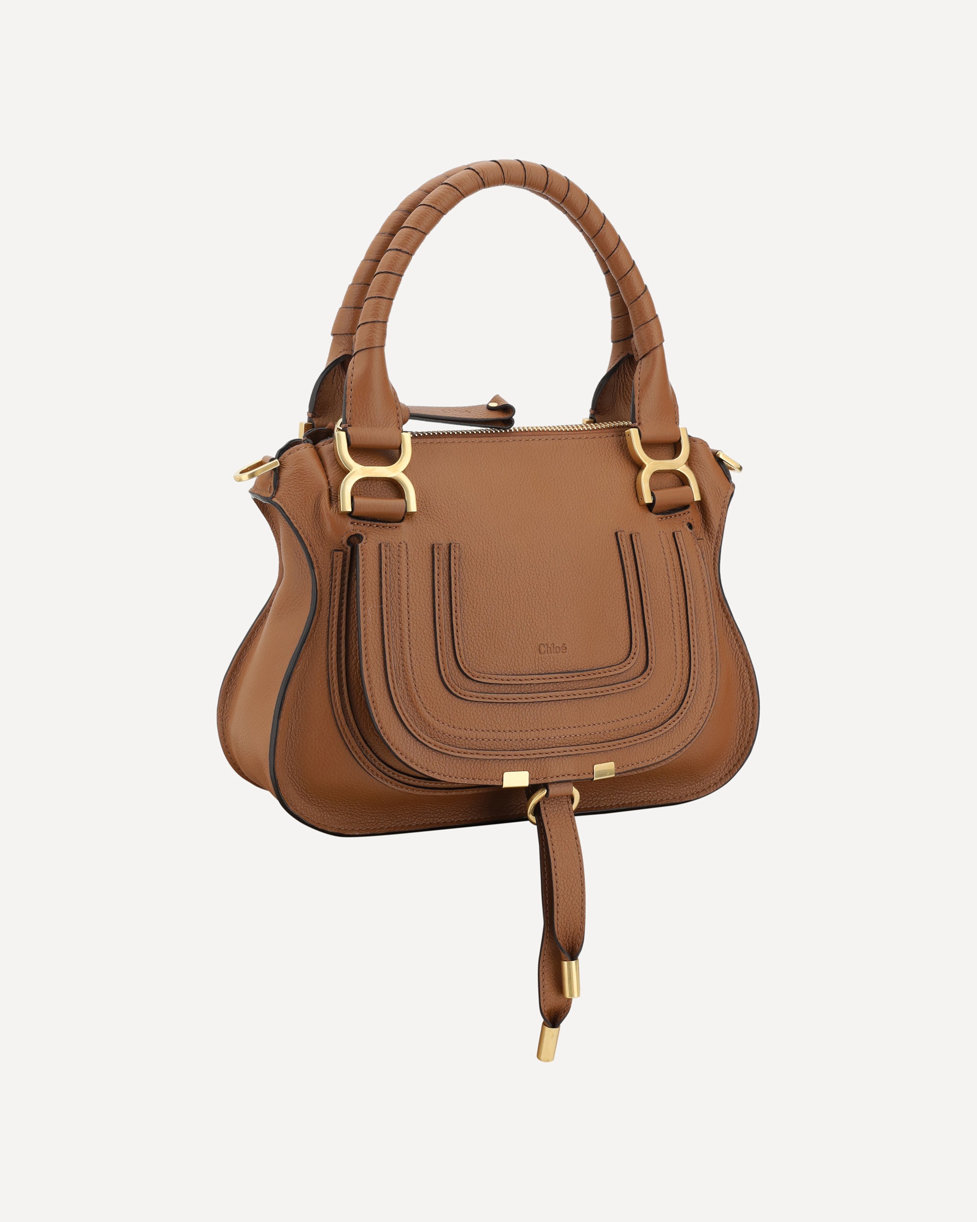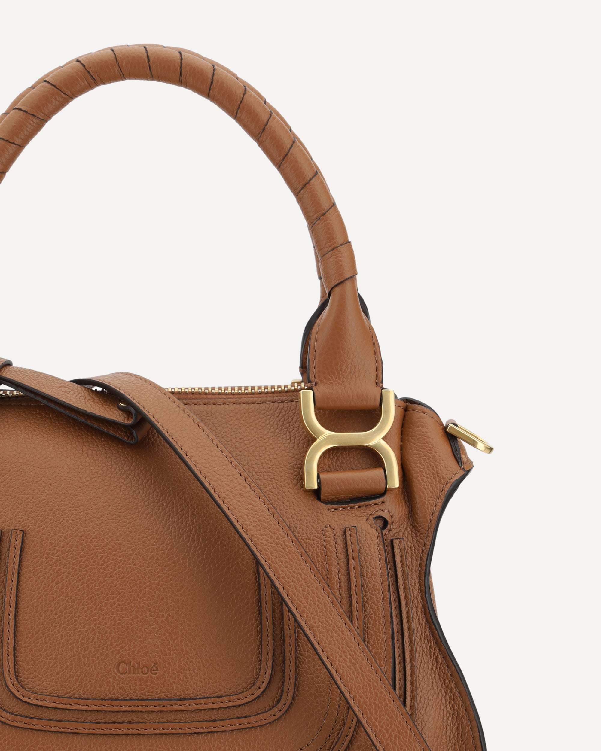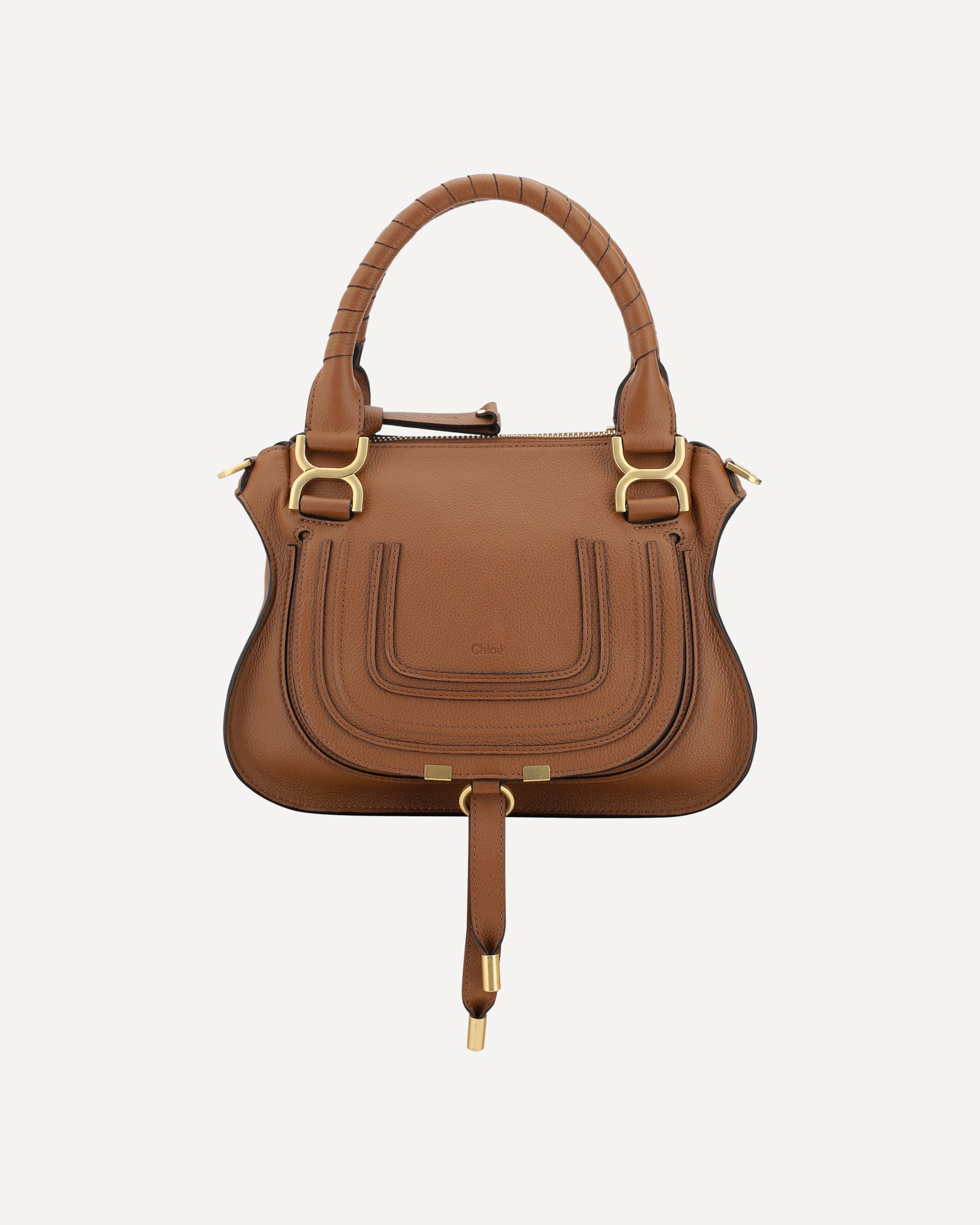 Calfskin Marcie Handbag by Chloé, double rigid leather top handle, removable and adjustable leather shoulder strap, top zipper closure, front flap with iconic leather tassel detail, iconic brand monogram press-stamped on front, open front pocket hidden by flap, single interior compartment.