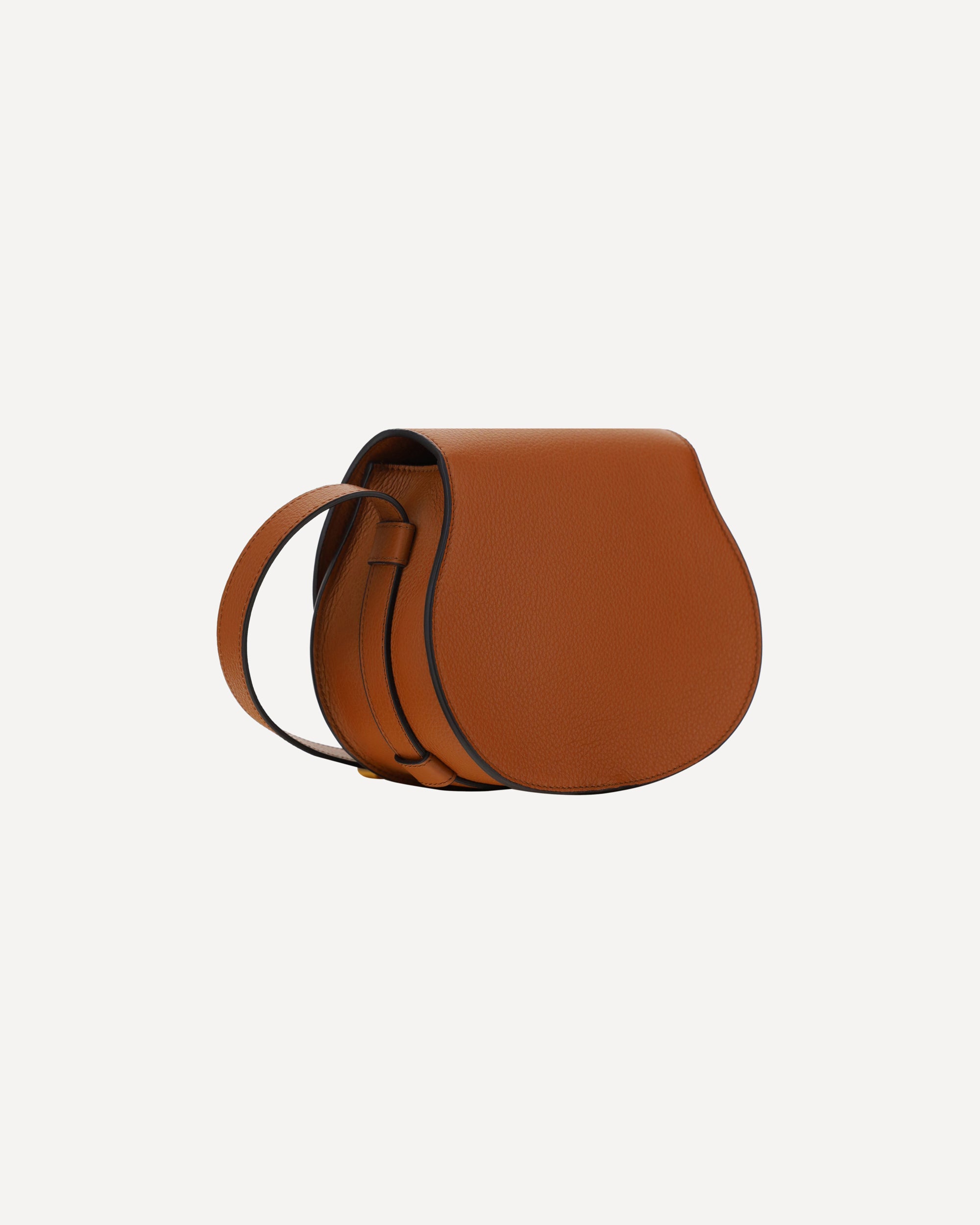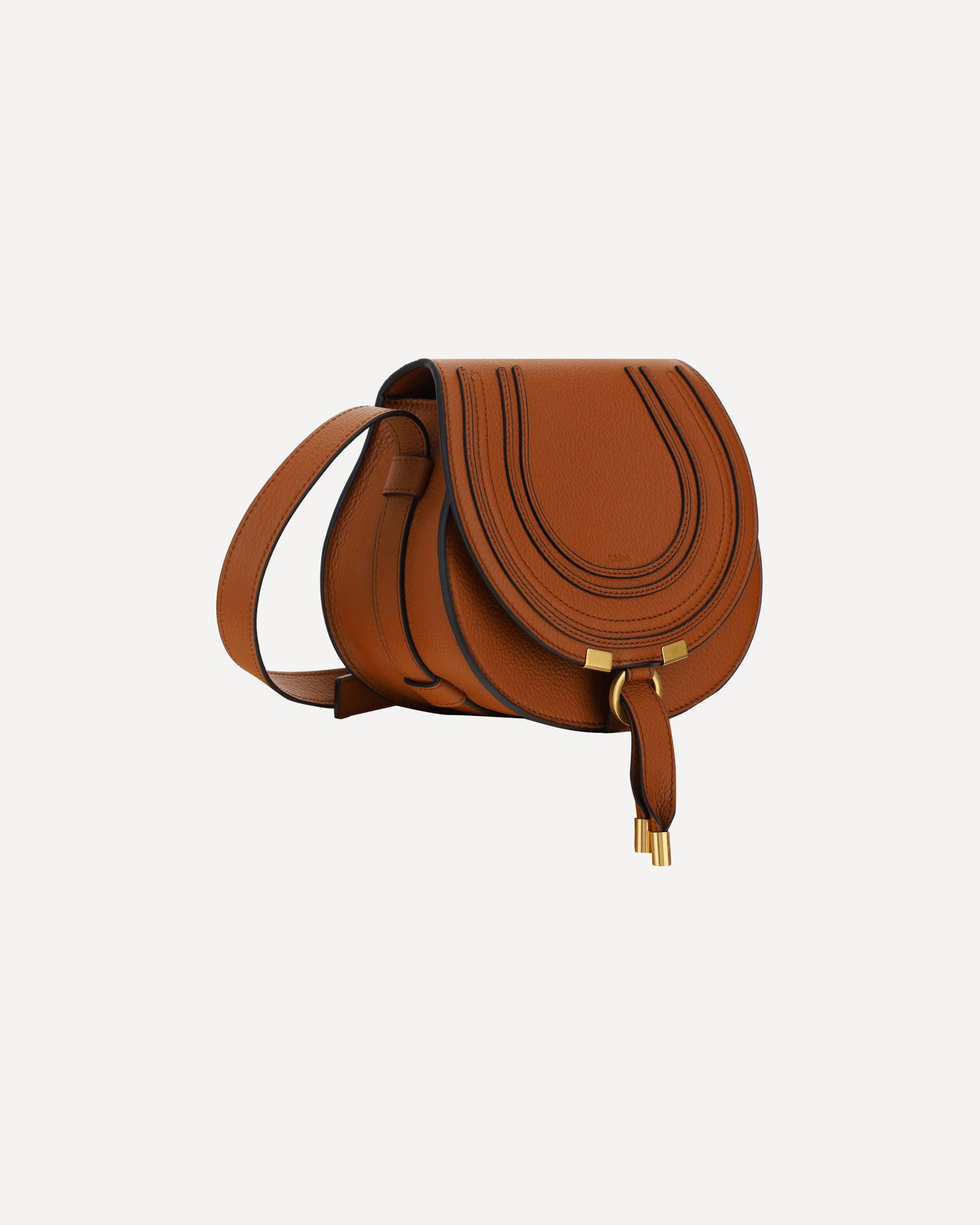 Calfskin Marcie Shoulder Bag by Chloé, iconic brand monogram press-stamped on front, adjustable flat shoulder strap, front flap closure with magnetic button, iconic leather tassel with antiqued brass charm embellishes closure, fabric-lined interior, interior compartment with welt pocket.