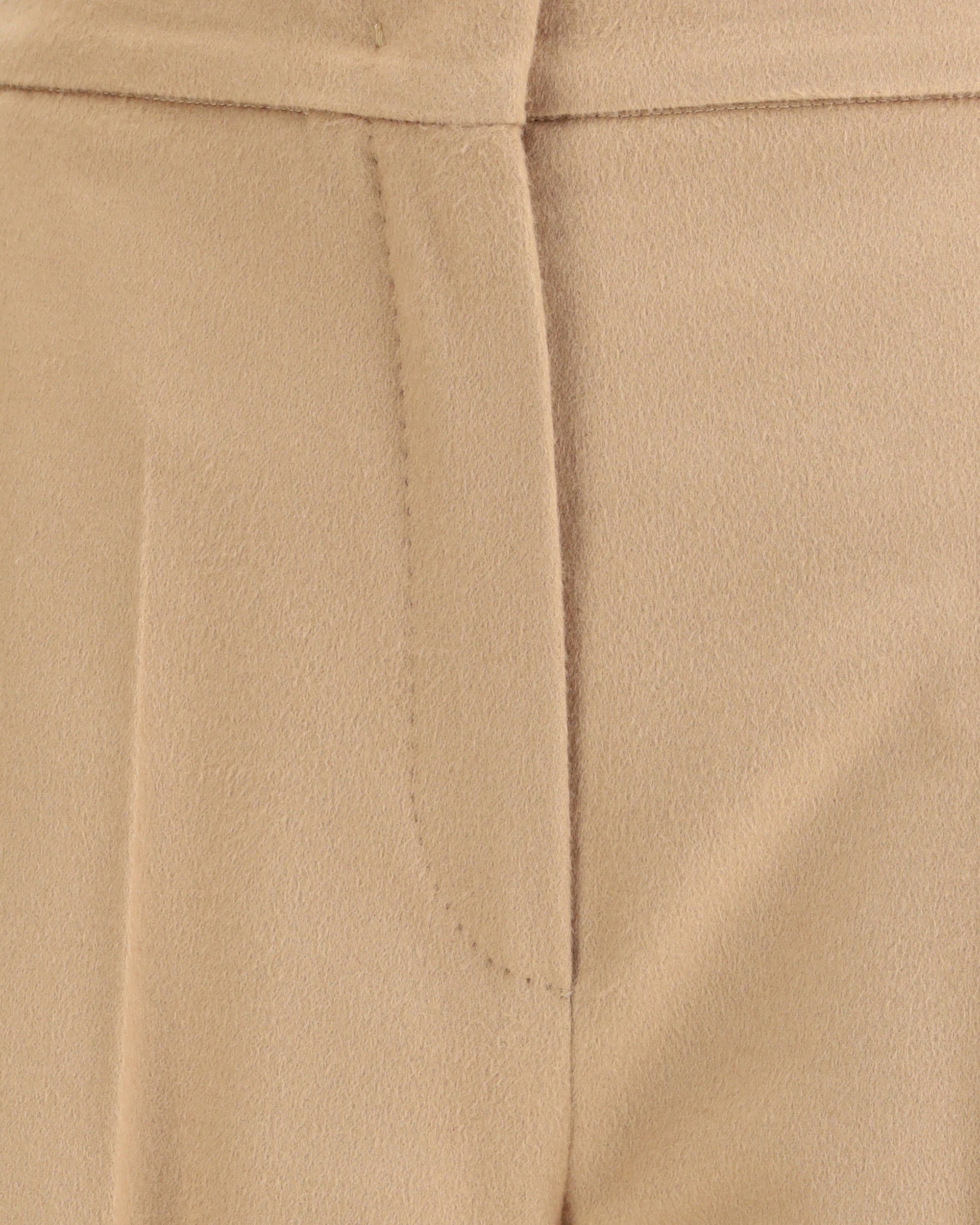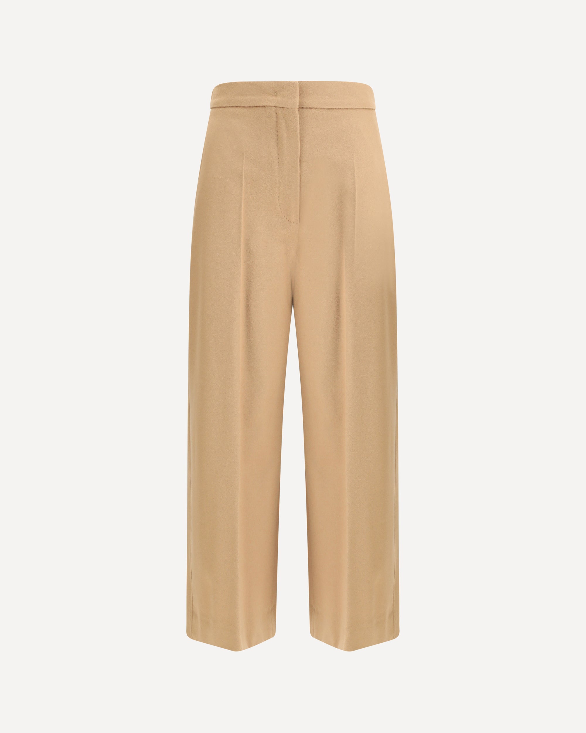 The Marengo Trousers by Max Mara Studio express contemporary elegance through clean lines and a fluid silhouette. Crafted from lightweight pure wool drap, they feature a wide leg and a relaxed fit that moves gracefully with the body. The high waistband with concealed zip and hook closure highlights the refined tailoring, while the slanted side pockets add a touch of understated practicality. A pressed crease and stitched back pleats define the shape, enhancing the trousers’ balance and structure. Versatile and polished, they are ideal for creating modern, sophisticated looks that transition effortlessly from day to evening.