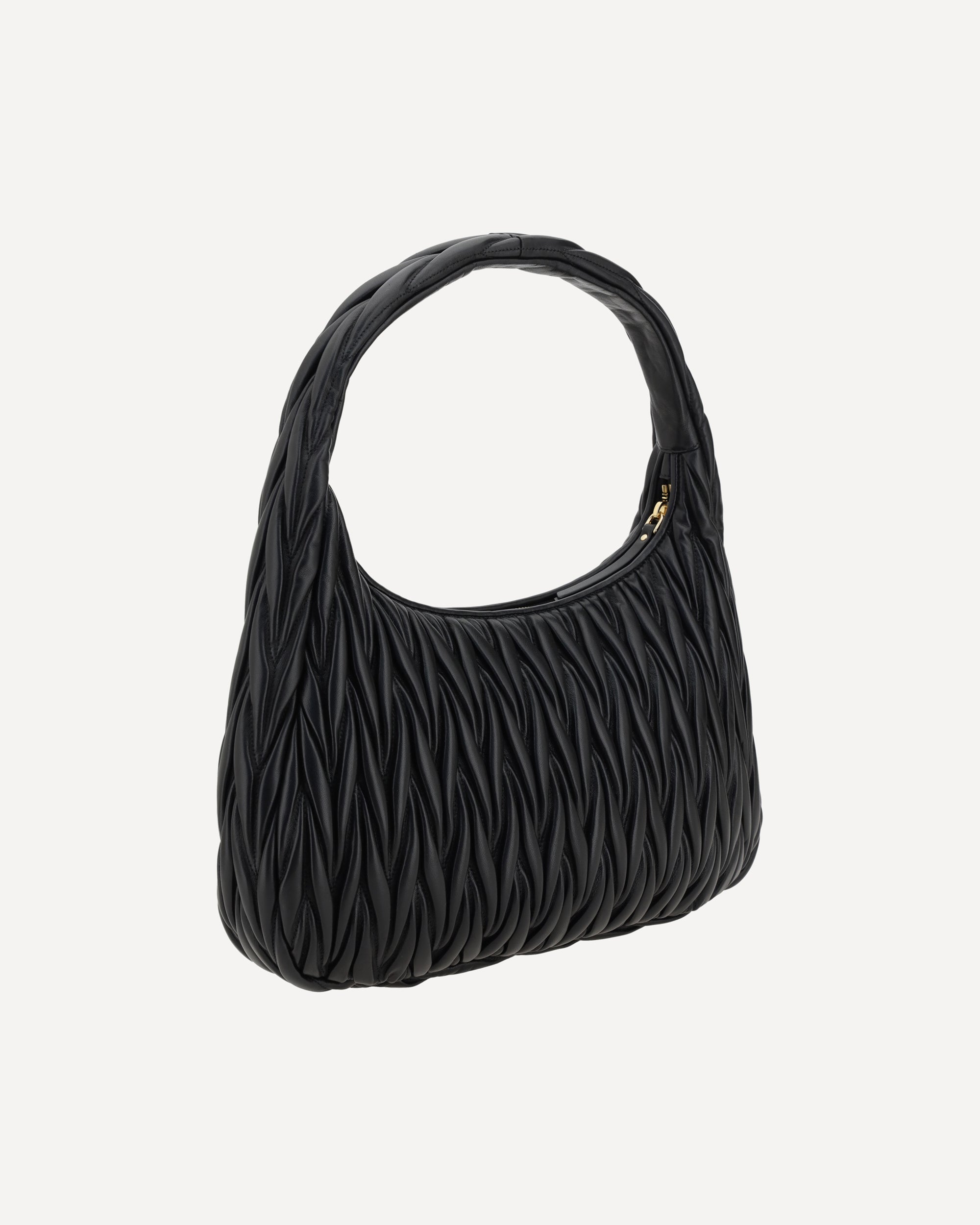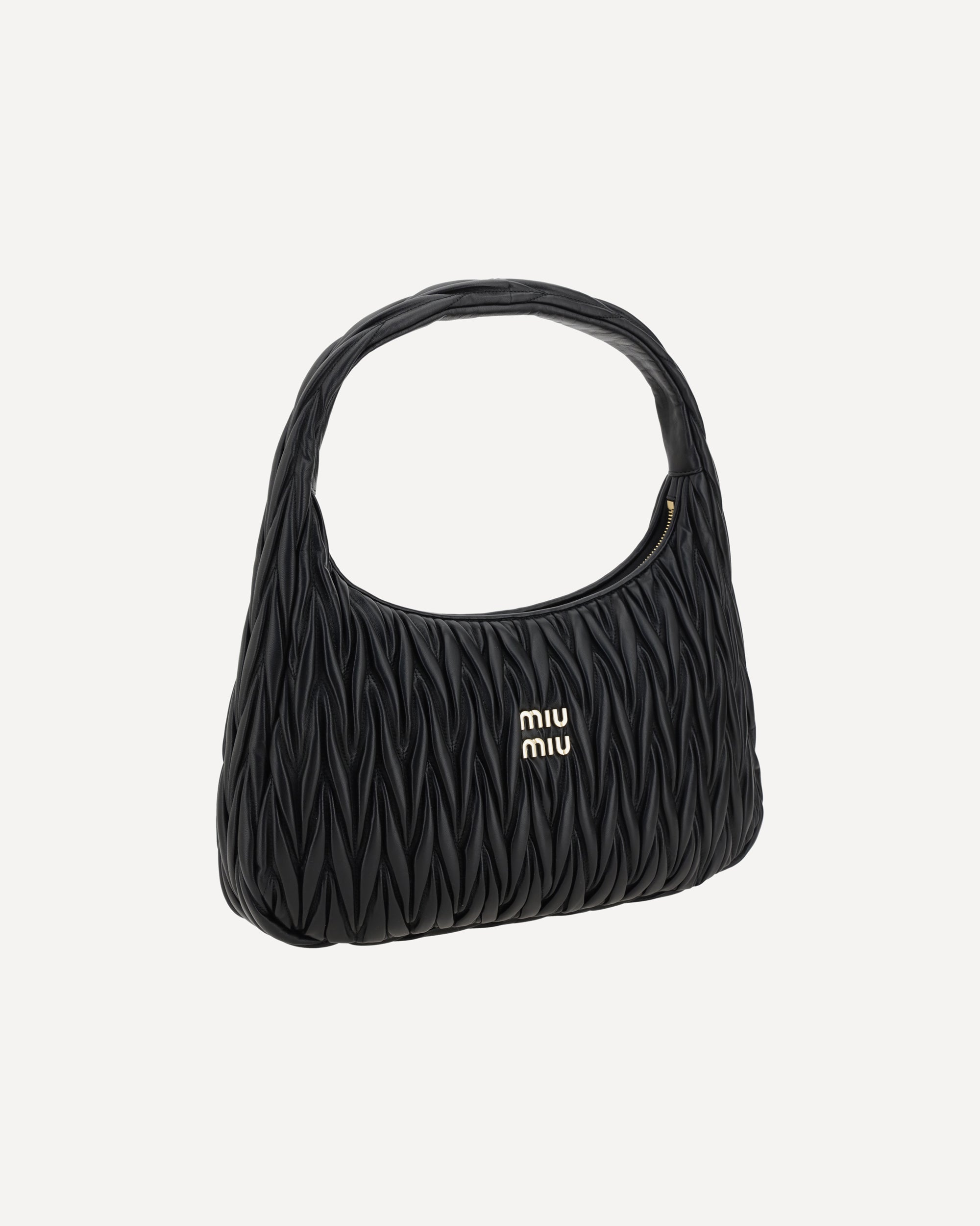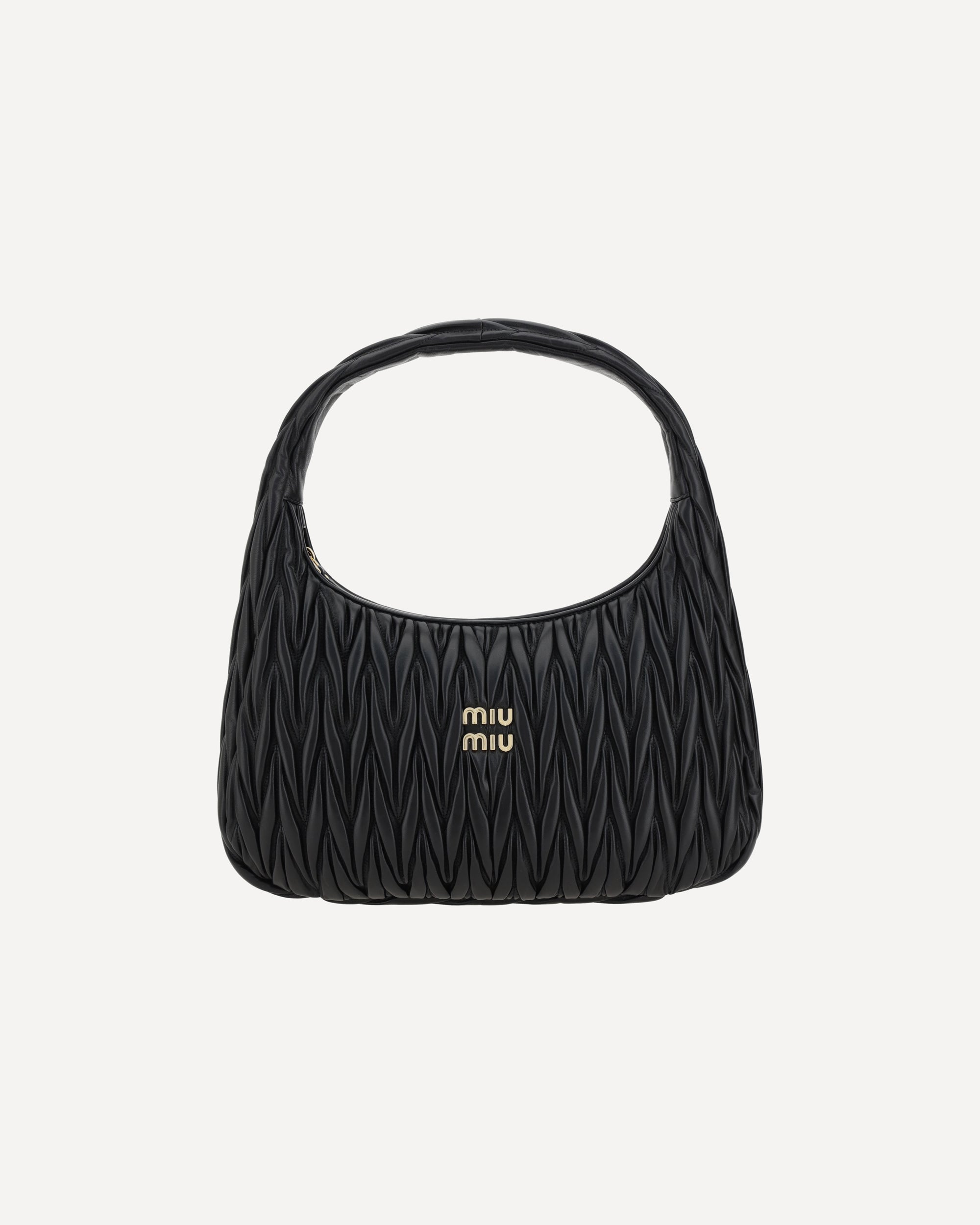 Miu Miu's leather Shoulder Bag features refined matelassé workmanship that creates a sophisticated, three-dimensional effect. Featuring a top handle and zipper closure, it offers a single practical and roomy interior compartment. The brand's iconic logo is applied on the front, adding a touch of recognition and luxury. An elegant and modern accessory, perfect to complete a refined look.
