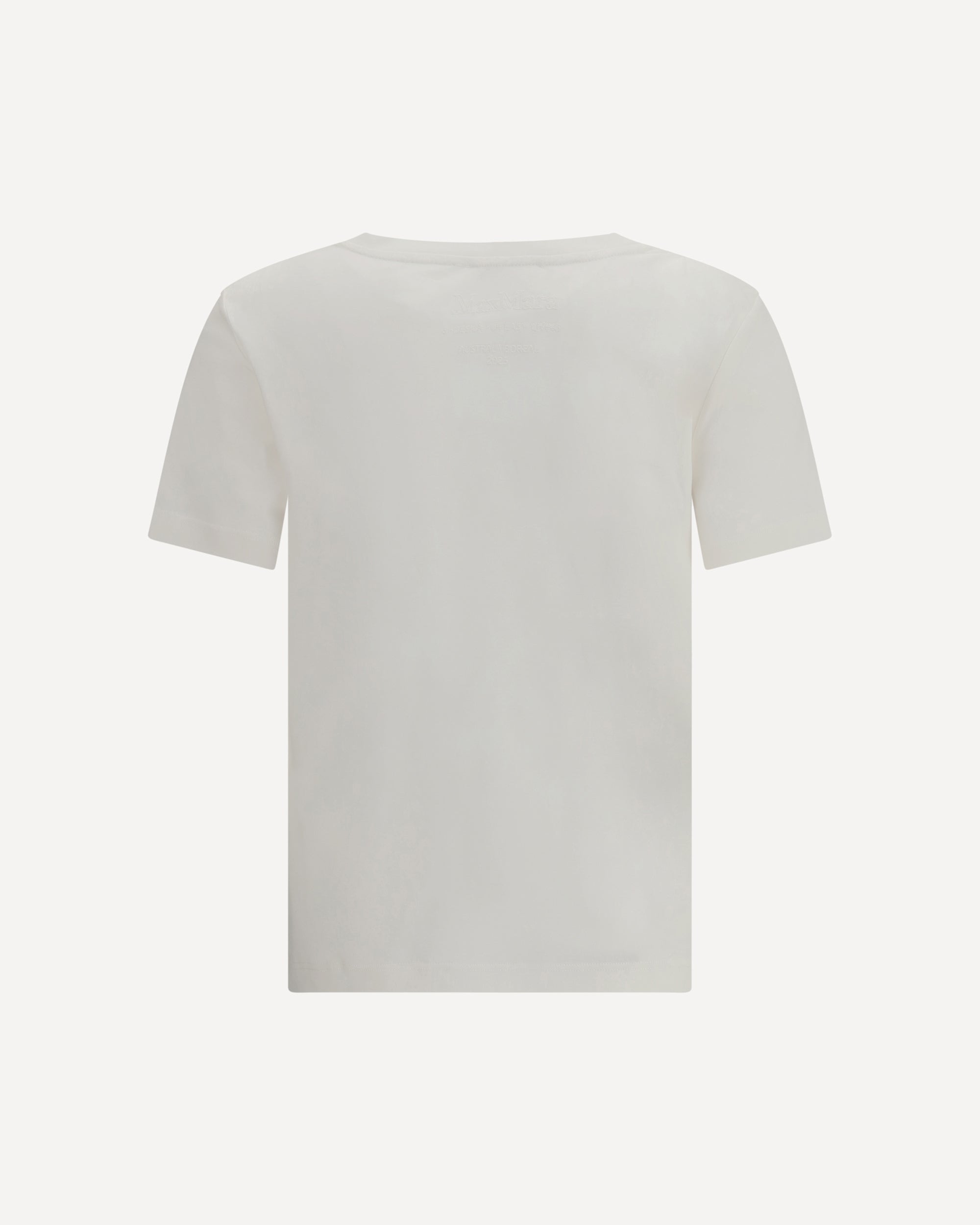 The Maya T-shirt by Max Mara Studio crafted from white cotton and modal jersey. Featuring a ribbed crewneck, short sleeves, and a straight hem, the design is enriched on the back with a subtle tone-on-tone embroidered logo lettering. With its regular fit, this piece is a timeless and versatile essential for everyday wear.