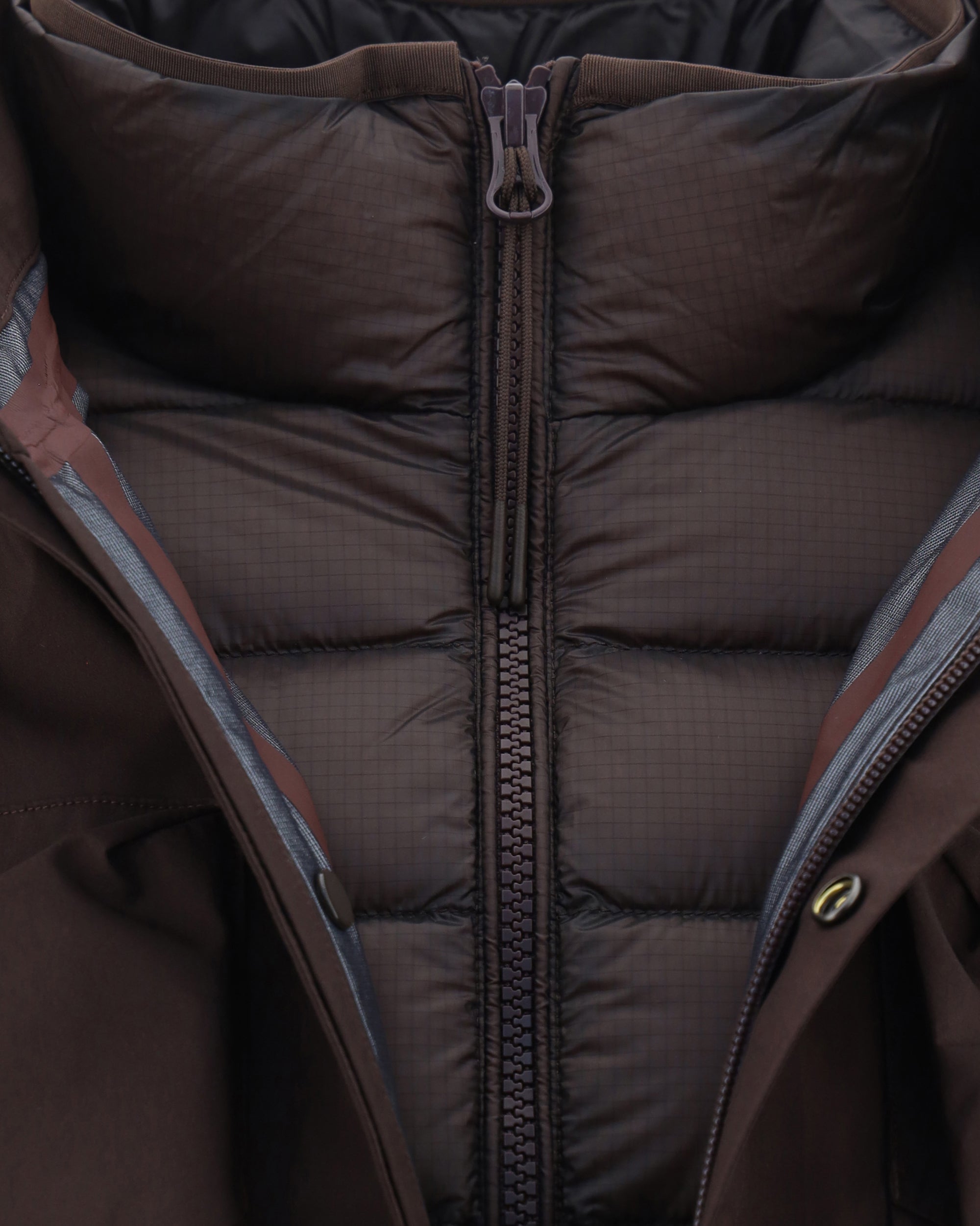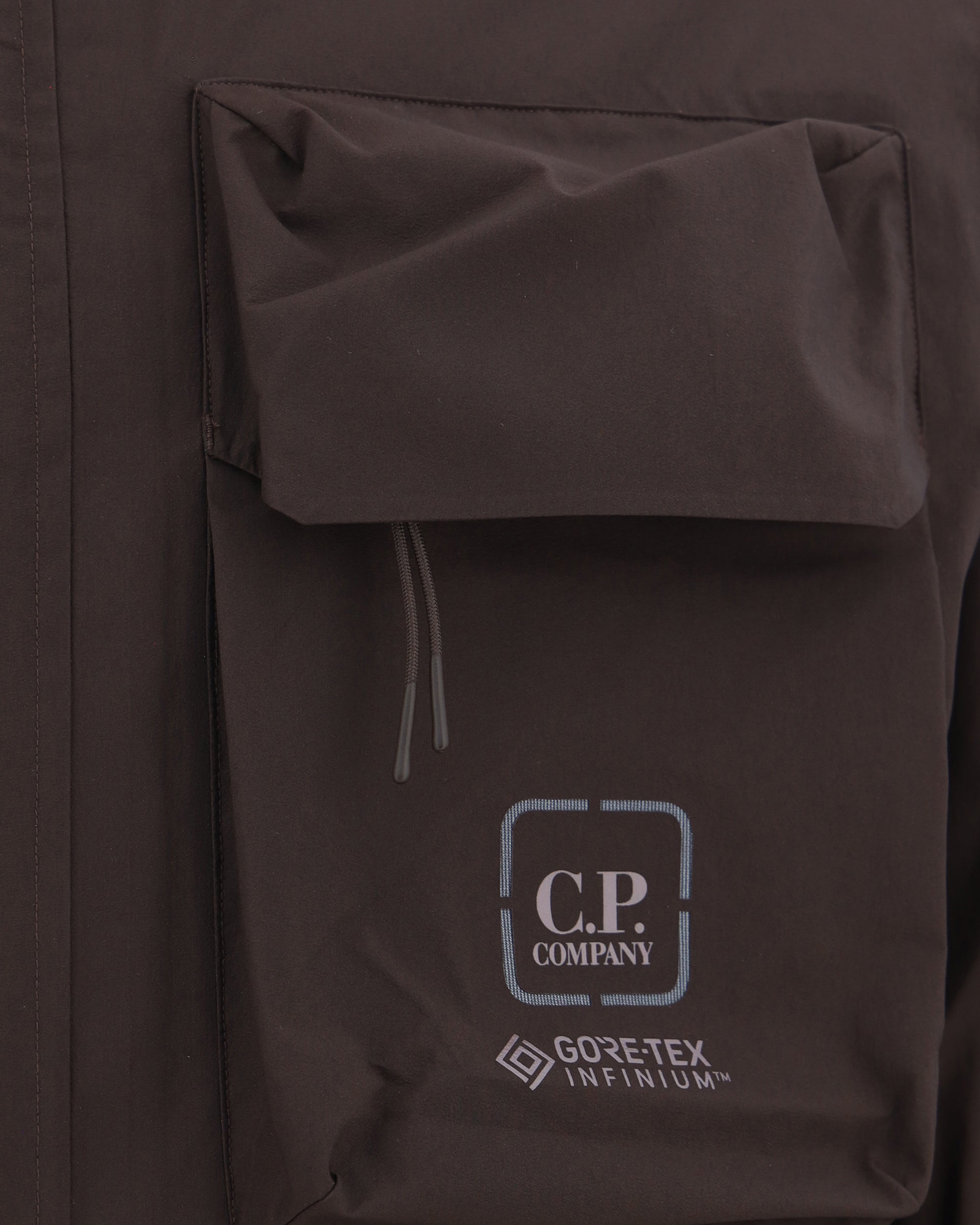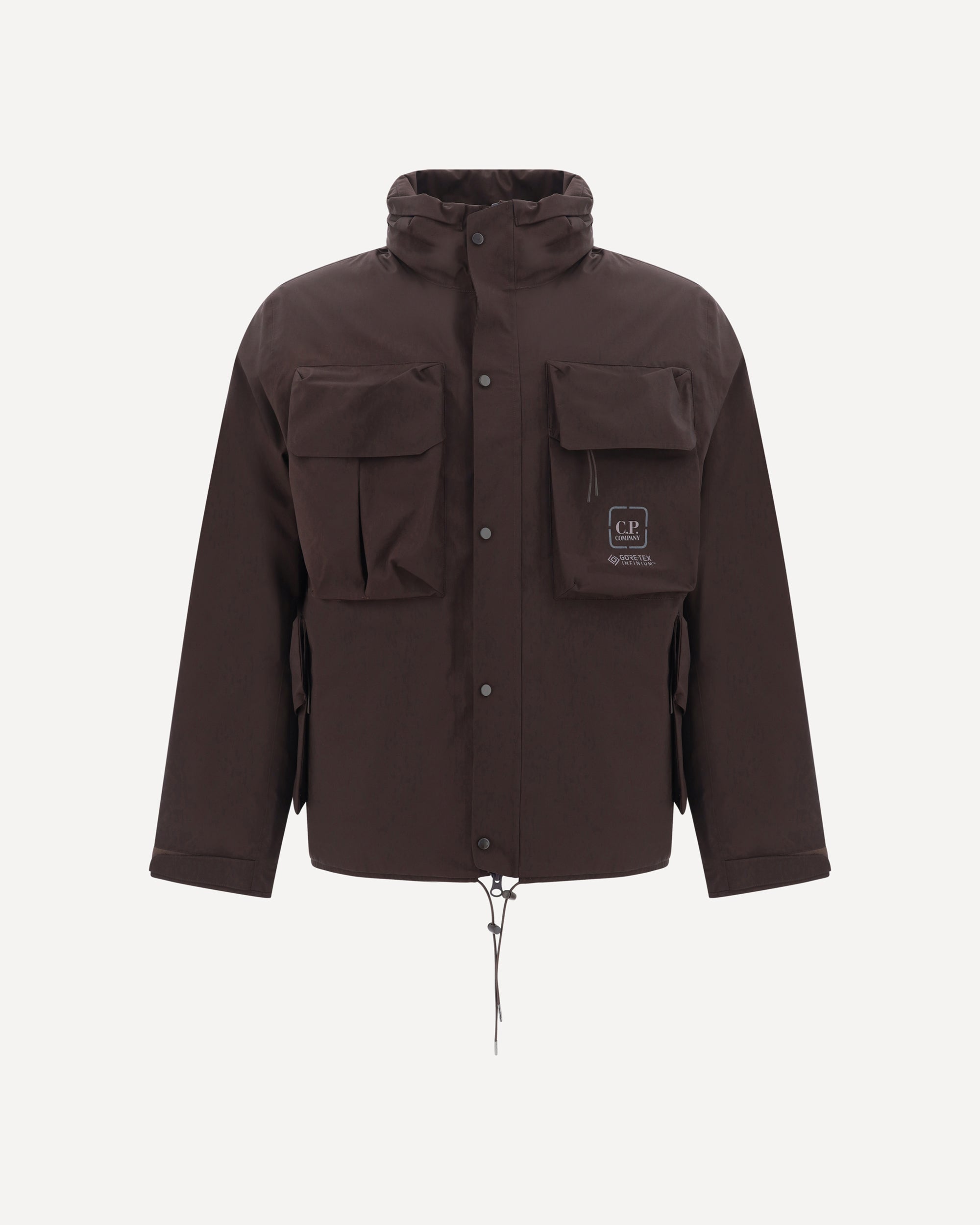 Metropolis Jacket by C.P.Company, hood with adjustable drawstring to store in a patch pocket on the neckline, two large patch pockets on the front with Velcro patch for closure, adjustable cuffs, contrasting iconic brand logo on the front, all-over padding, front closure by snap buttons, regular fit.