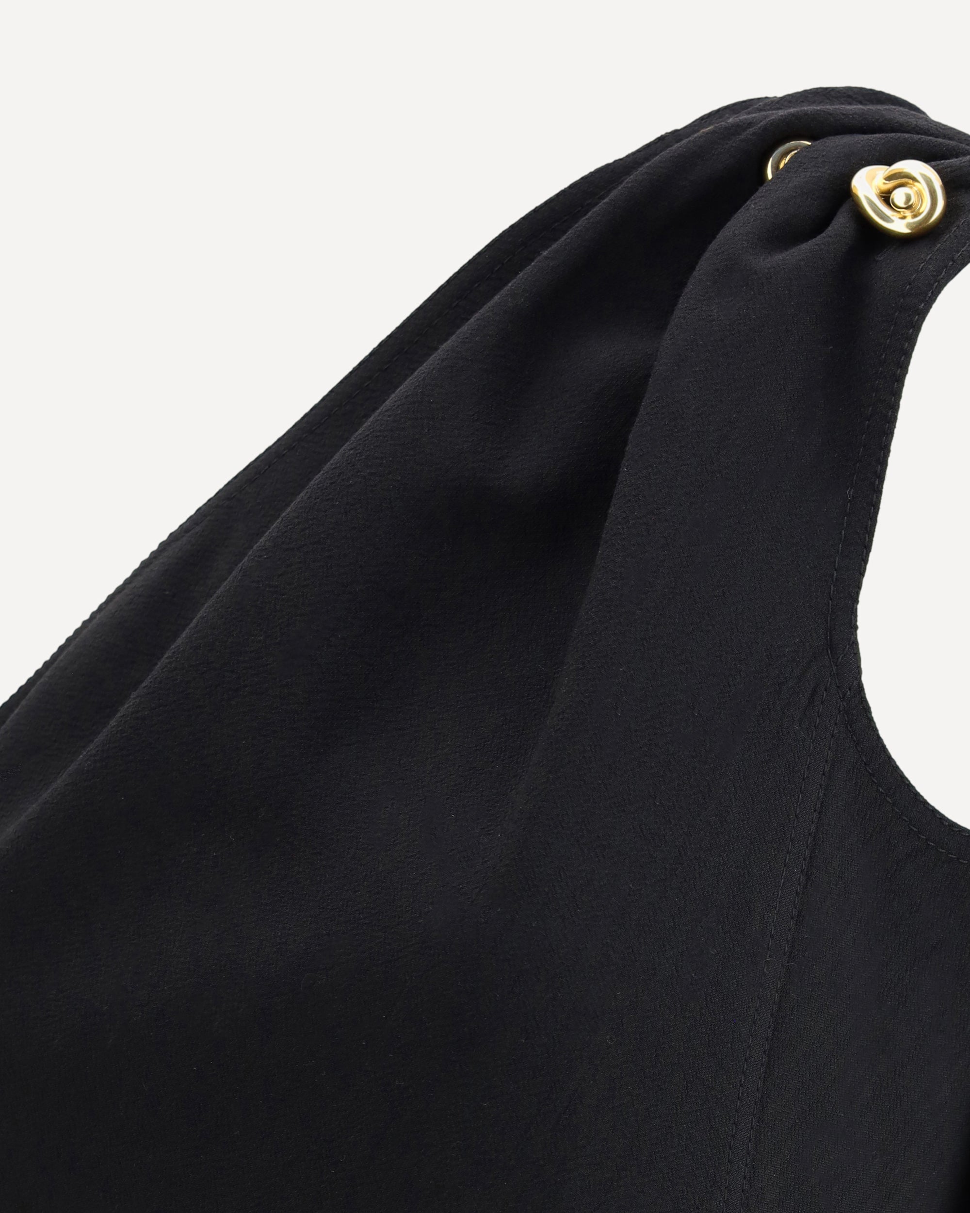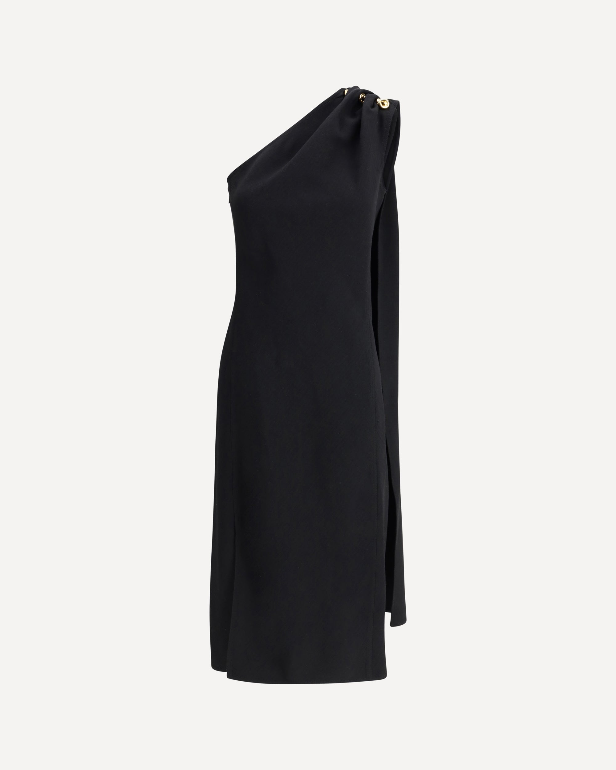 The Bottega Veneta midi dress is a masterpiece of minimalist elegance and sophistication. The one-shoulder design, which can be closed at the side with a zip, offers a refined and flexible silhouette. The small slit on the front adds a touch of discreet sensuality, while the shawl detail incorporated into the sleeve creates a draped effect that enhances the design. The iconic knot details on the shoulder are a distinctive sign of the brand, giving the dress a note of originality and class.