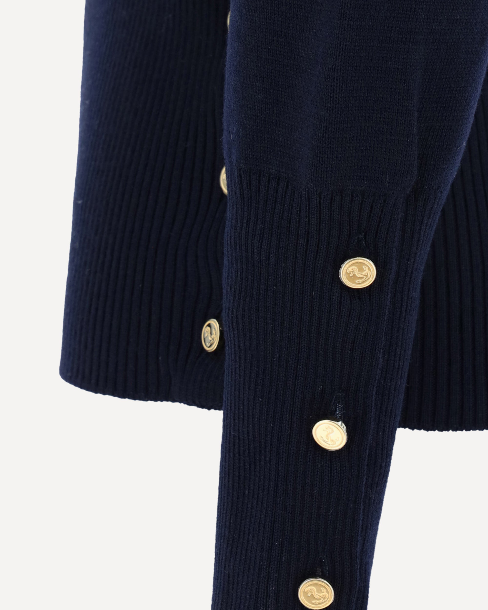 Thom Browne's virgin wool Sweater is an iconic piece with a clean yet richly tailored design. A classic crew neck combines with a ribbed high hem, featuring practical side buttons that allow you to adjust the slits with discretion and functionality. The cuffs, also ribbed and button-fastened, add a touch of structured elegance. Distinguishing the sweater are the brand's iconic horizontal bands, positioned on the left arm, which lend instant recognition and a graphic accent typical of the Thom Browne style.