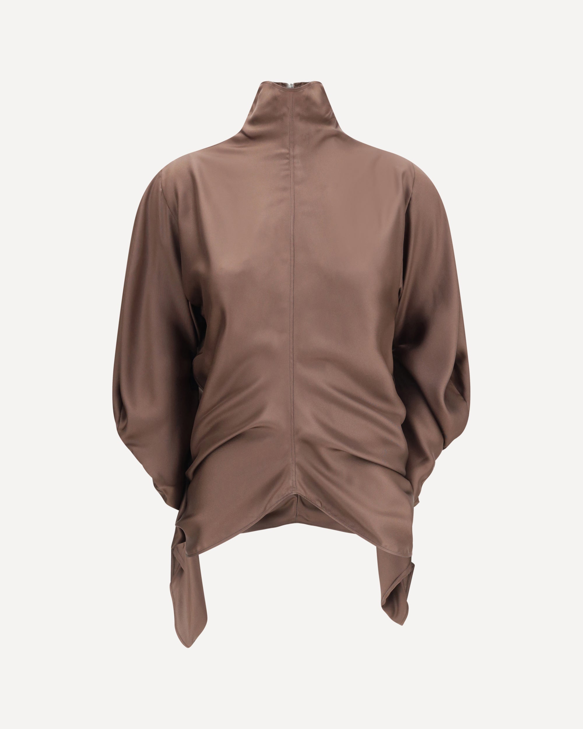 The draped Miles Silk Blouse by The Row embodies essential and sophisticated elegance. The high neck is paired with a back zip fastening, while the long sleeves and asymmetrical hem give the piece a fluid and refined character, true to the brand’s minimalist vision.