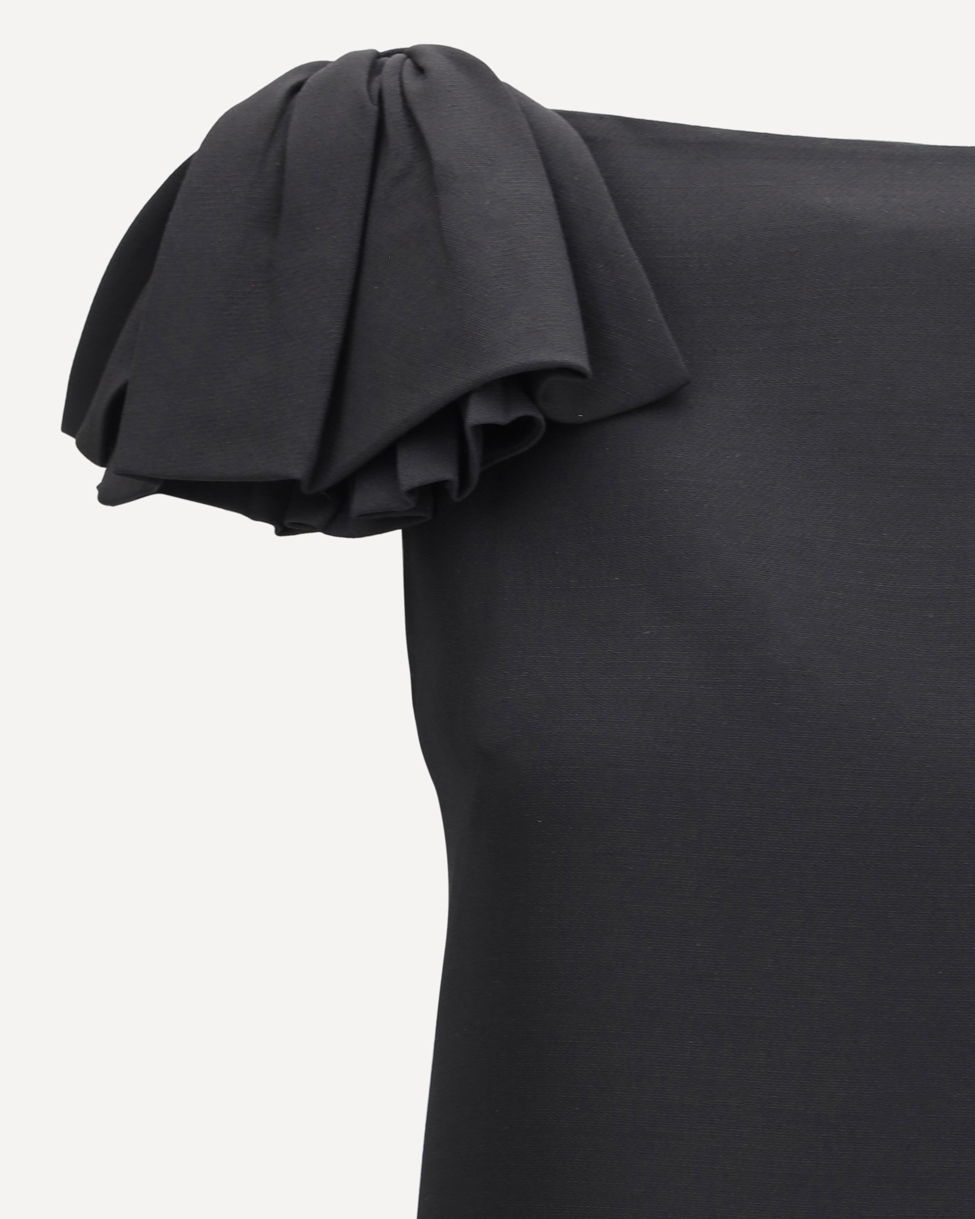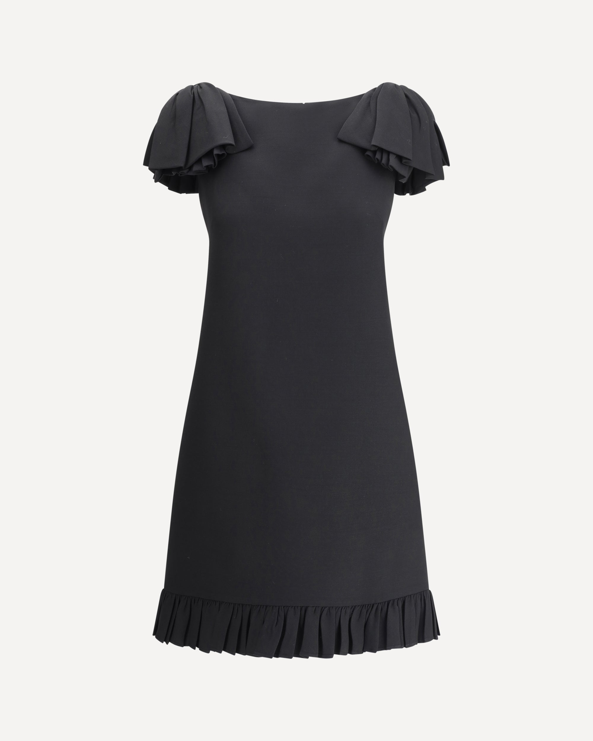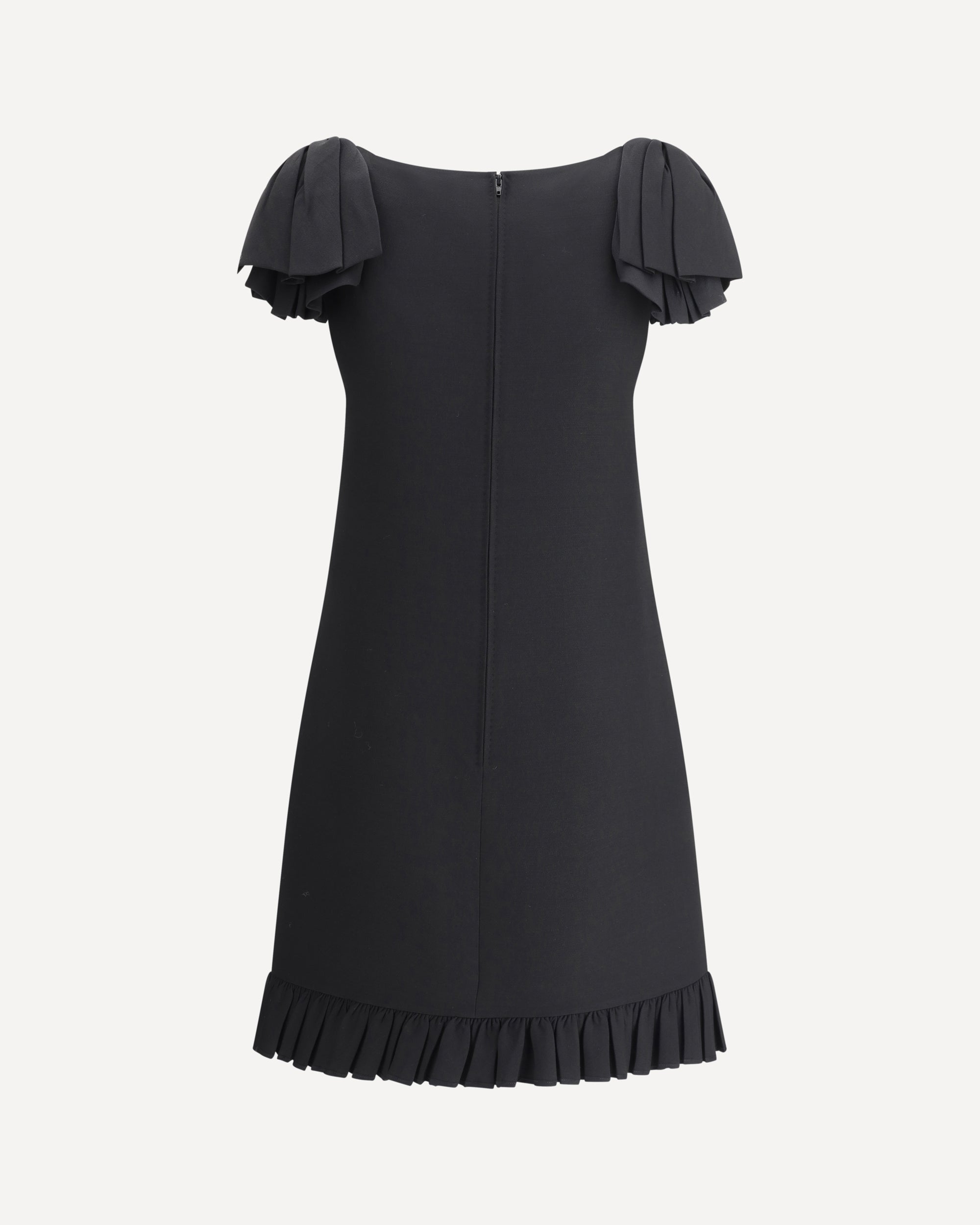 Valentino's mini Dress with bows features a semi-fitted silhouette that flatters the figure with elegance. The sleeveless design and boat neckline give a sophisticated touch, while the decorative bows on the shoulders add a feminine and romantic accent. The small ruffle at the bottom gives delicate movement to the dress. Pockets on the hips offer practicality, while the back zipper closure ensures a perfect fit. A versatile garment, ideal for formal or informal occasions, with a refined mix of classic style and modern details.