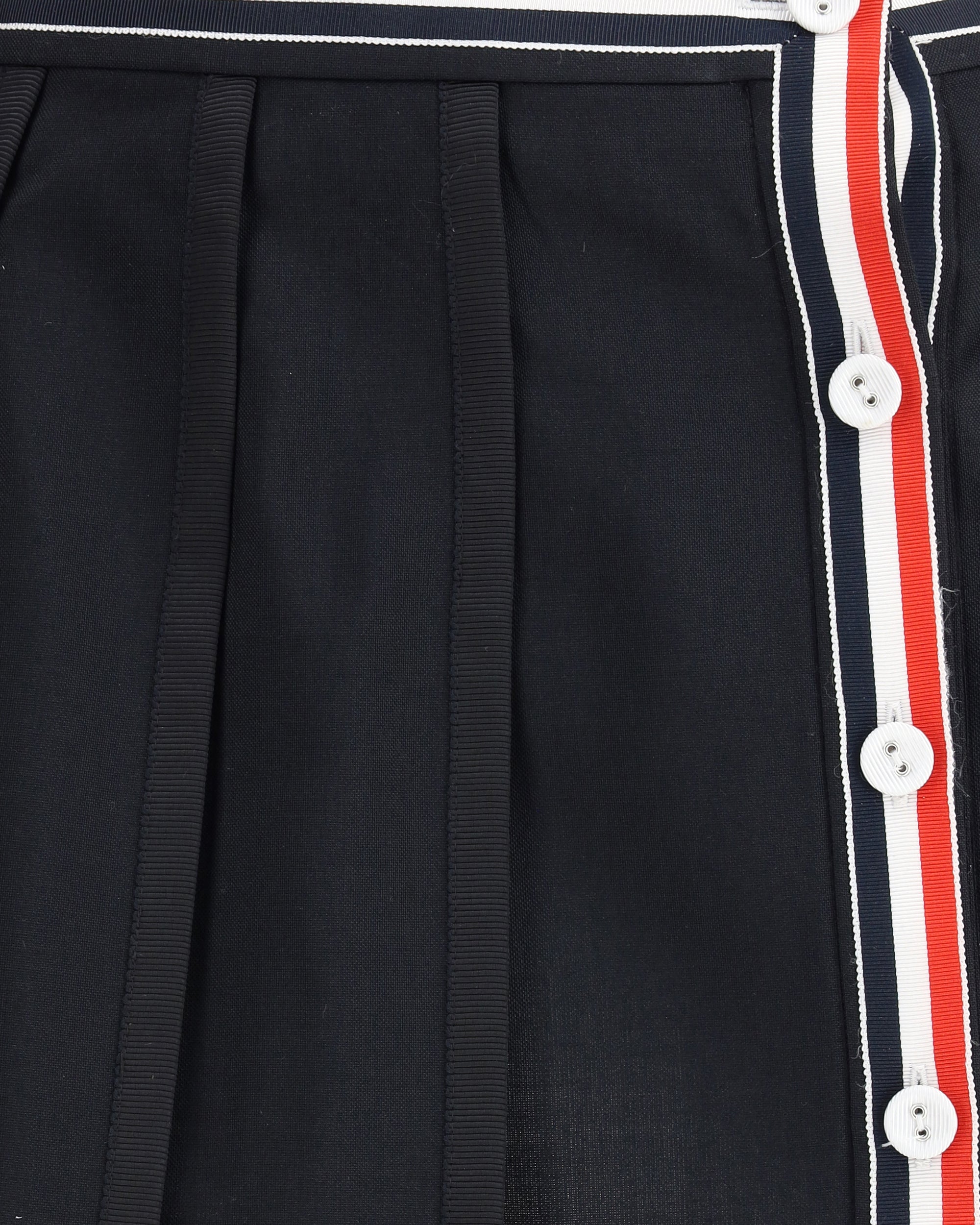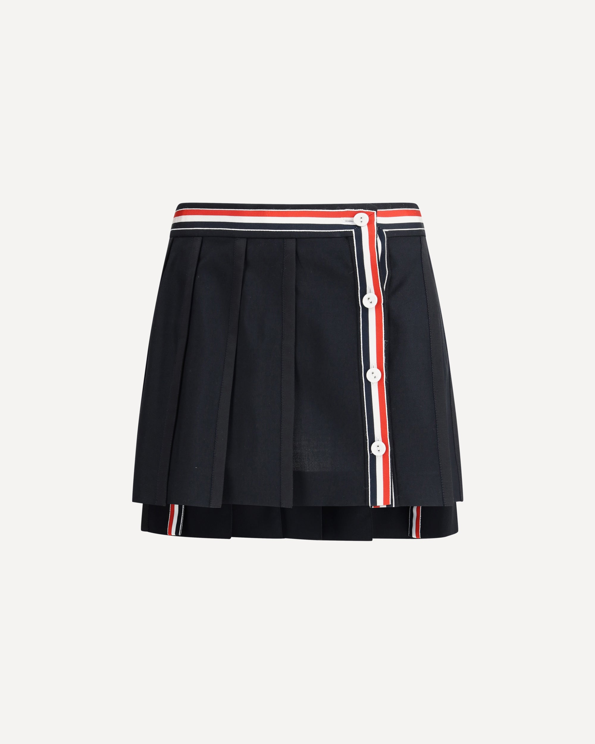 Thom Browne Mini Skirt made from high-quality wool, featuring a pleated design that adds movement and character to the garment. It features a front button closure and the brand's signature iconic contrasting bands on the front and waistband. Side slits and an asymmetric hemline with a longer back panel complete the design for a modern and original touch. A versatile and sophisticated mini skirt, perfect for a contemporary look.