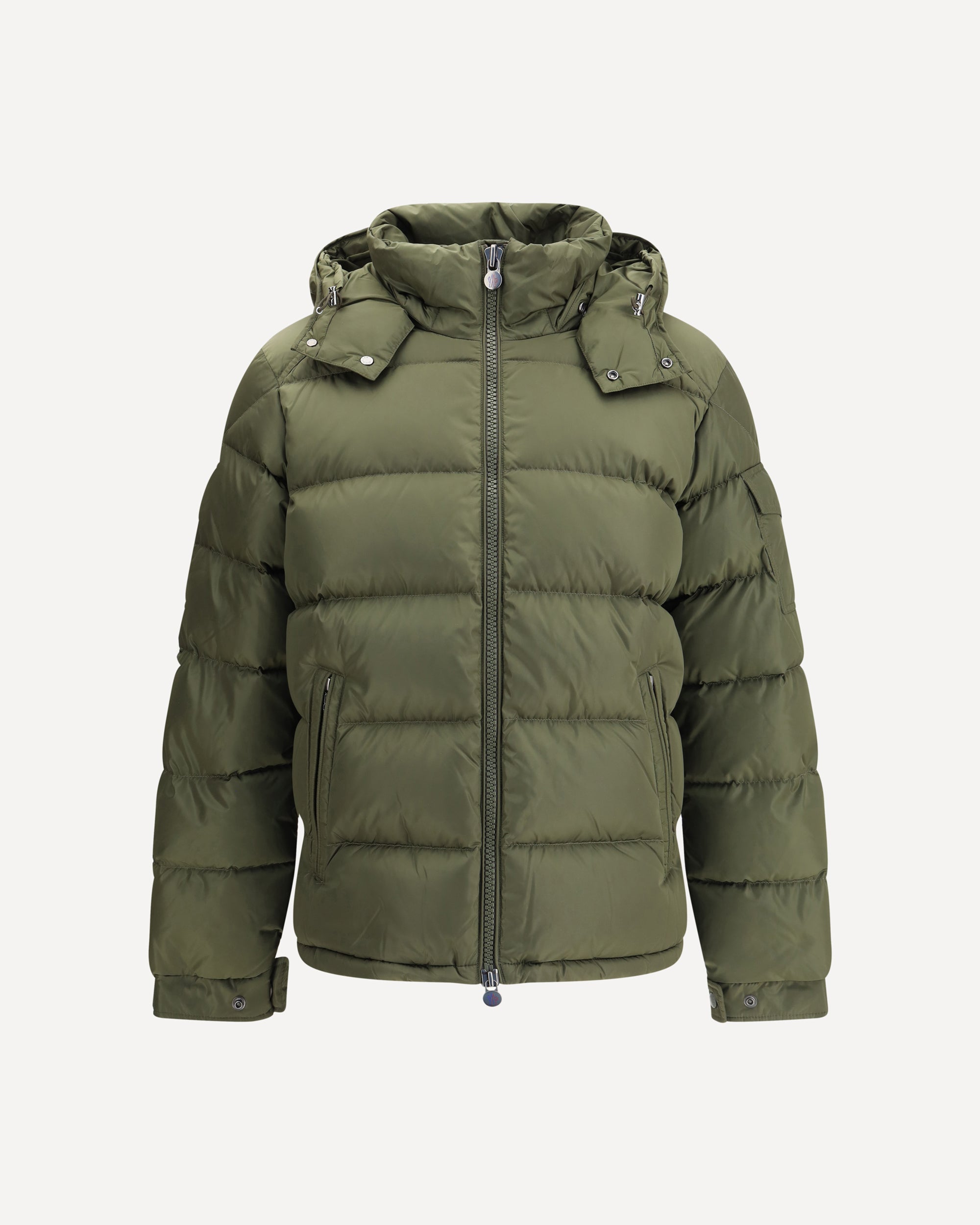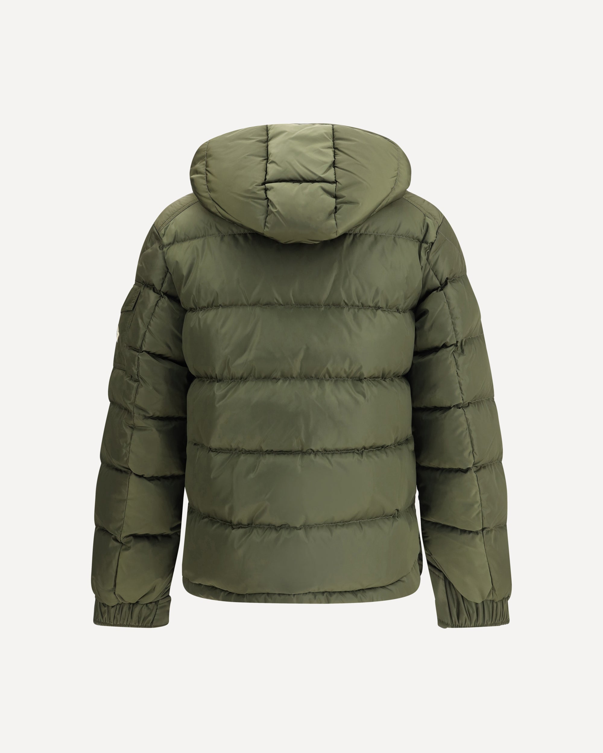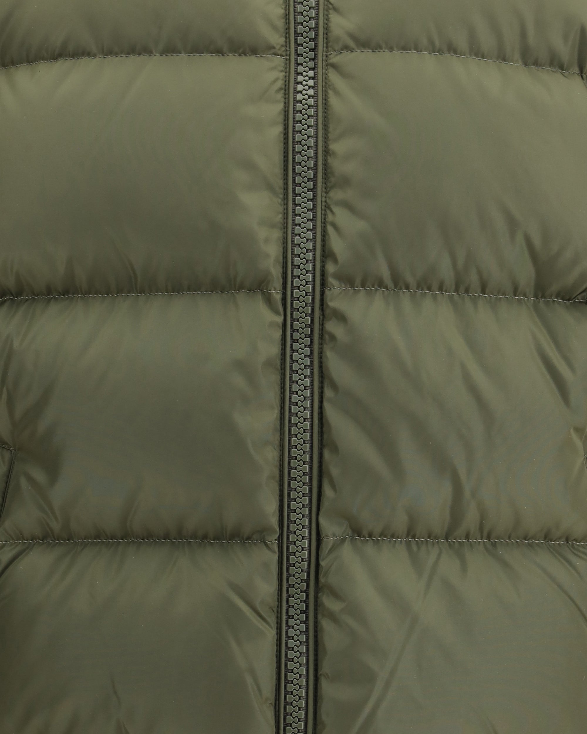 Maya Down Jacket by Moncler with adjustable drawstring hood and removable thanks to practical buttons. The high collar ensures protection, while the front closure with double slider zip guarantees functionality and comfort. It has two side welt pockets with zip, adjustable internal hem with drawstring and elasticated cuffs with button for a customizable fit. A pocket with flap and logo patch applied on the left sleeve completes the design. All-over quilting and padding ensure warmth and style even on the coldest days.