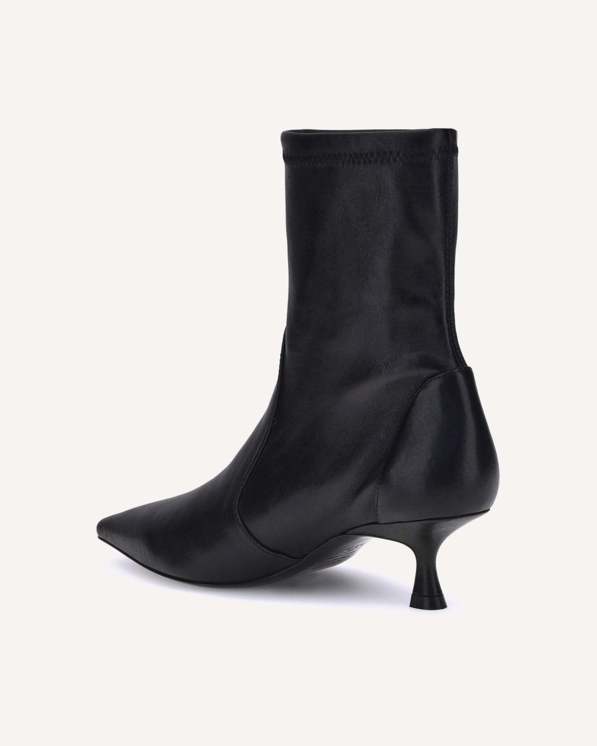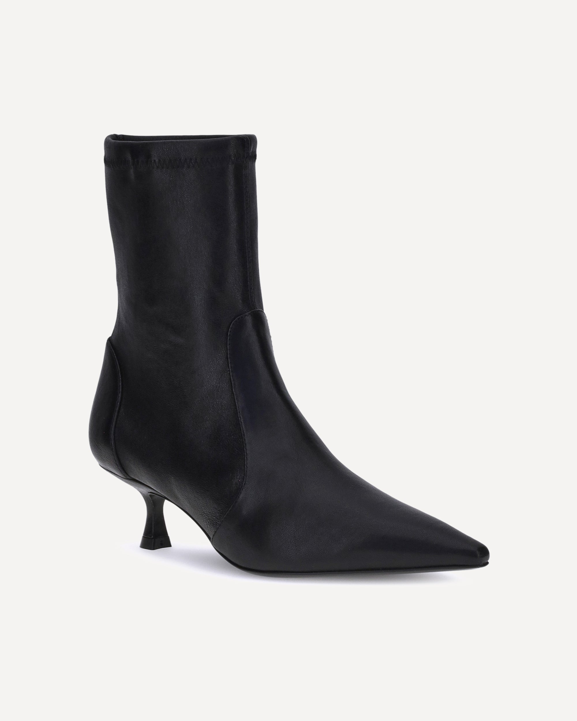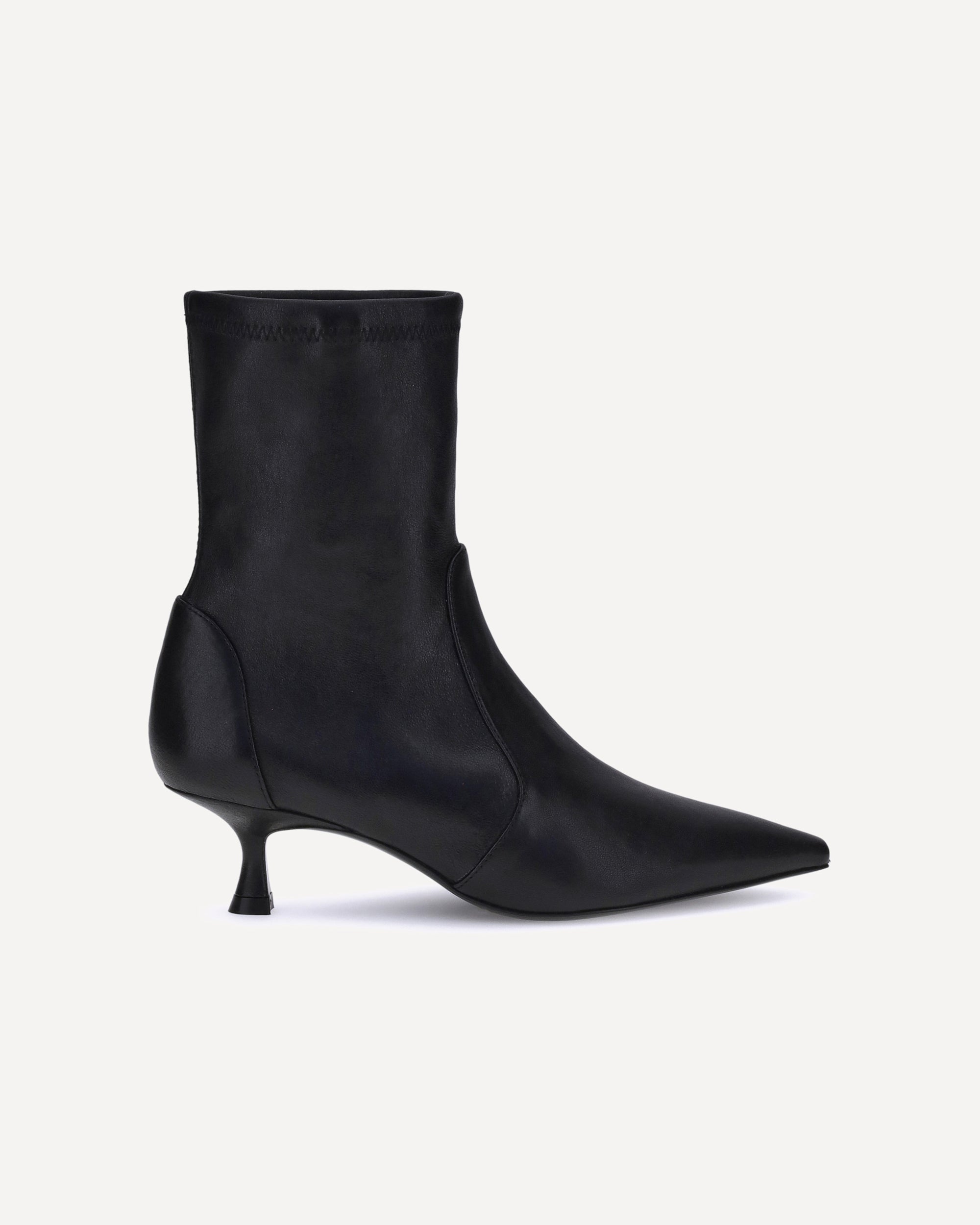 Stuart Weitzman's Naomi Ankle Boots combine elegance and comfort in an essential design. Featuring a fitted silhouette with an elongated toe, they have a practical slip-on style and a refined kitten heel that gently slims the figure. The height just above the ankle makes them versatile and perfect for both formal and casual looks.