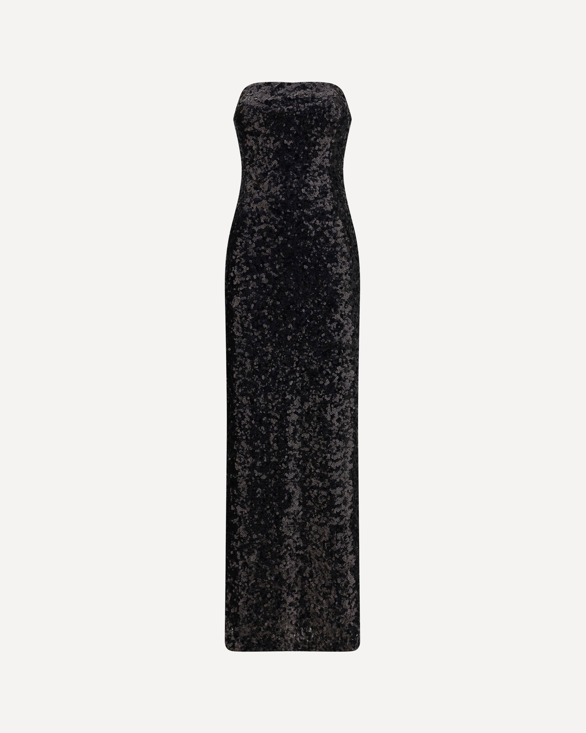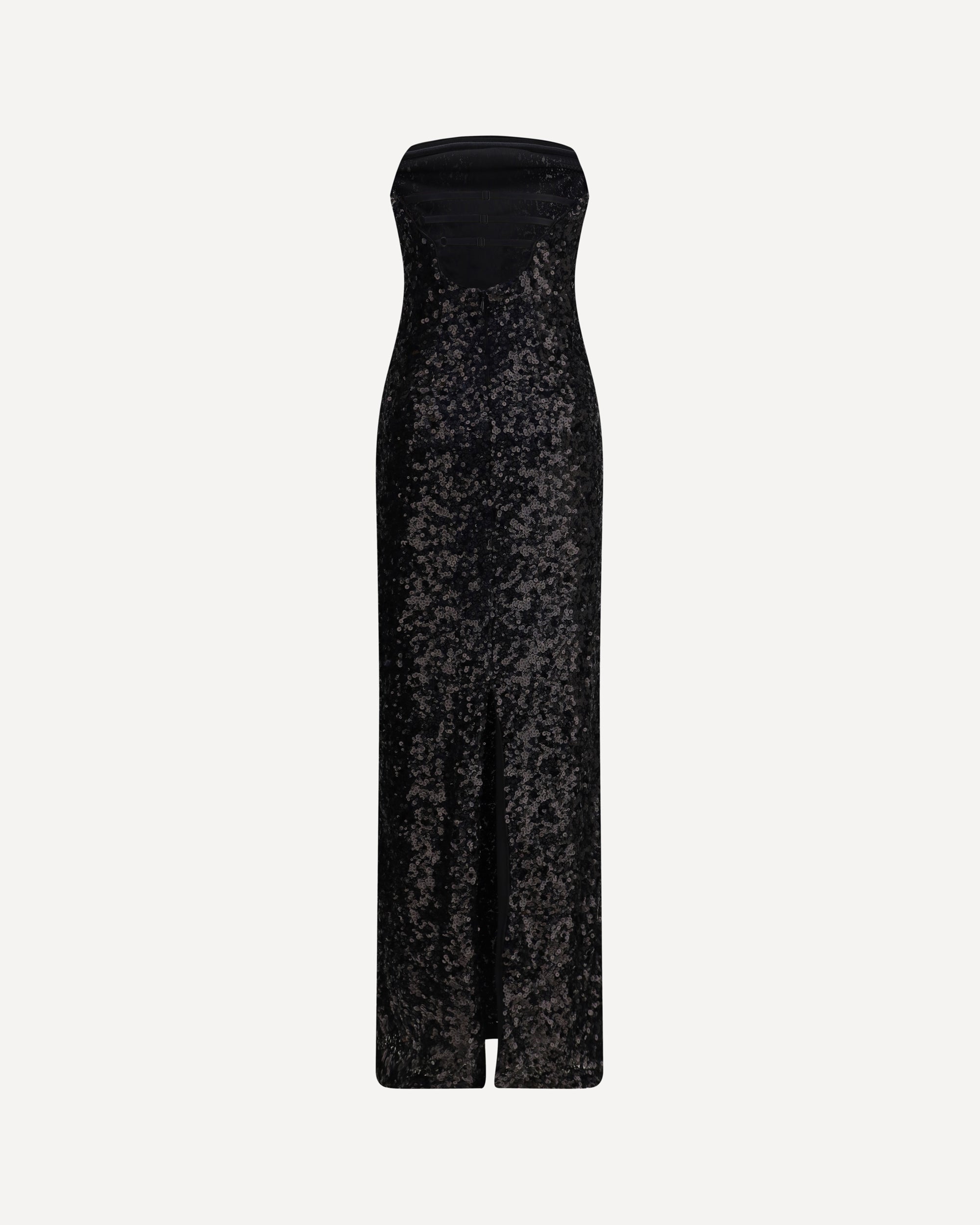 Nintendo's strapless fitted evening gown with back slit, made of stretch tulle embroidered with overlapping sequins for a three-dimensional effect. Perfect for elegant evenings and events.