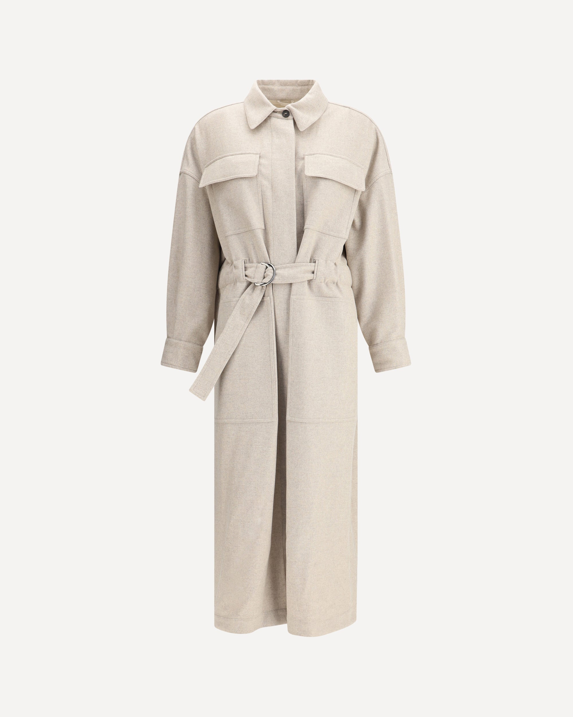 Brunello Cucinelli's Long Coat is a timelessly elegant garment perfect for any occasion. Featuring a classic collar and a front button closure, it has two flap patch pockets on the chest and two side patch pockets, combining practicality and style. The matching, adjustable waistband allows you to define the silhouette, adding a touch of sophisticated personalization to the design. A versatile and refined garment that combines warmth and luxury.