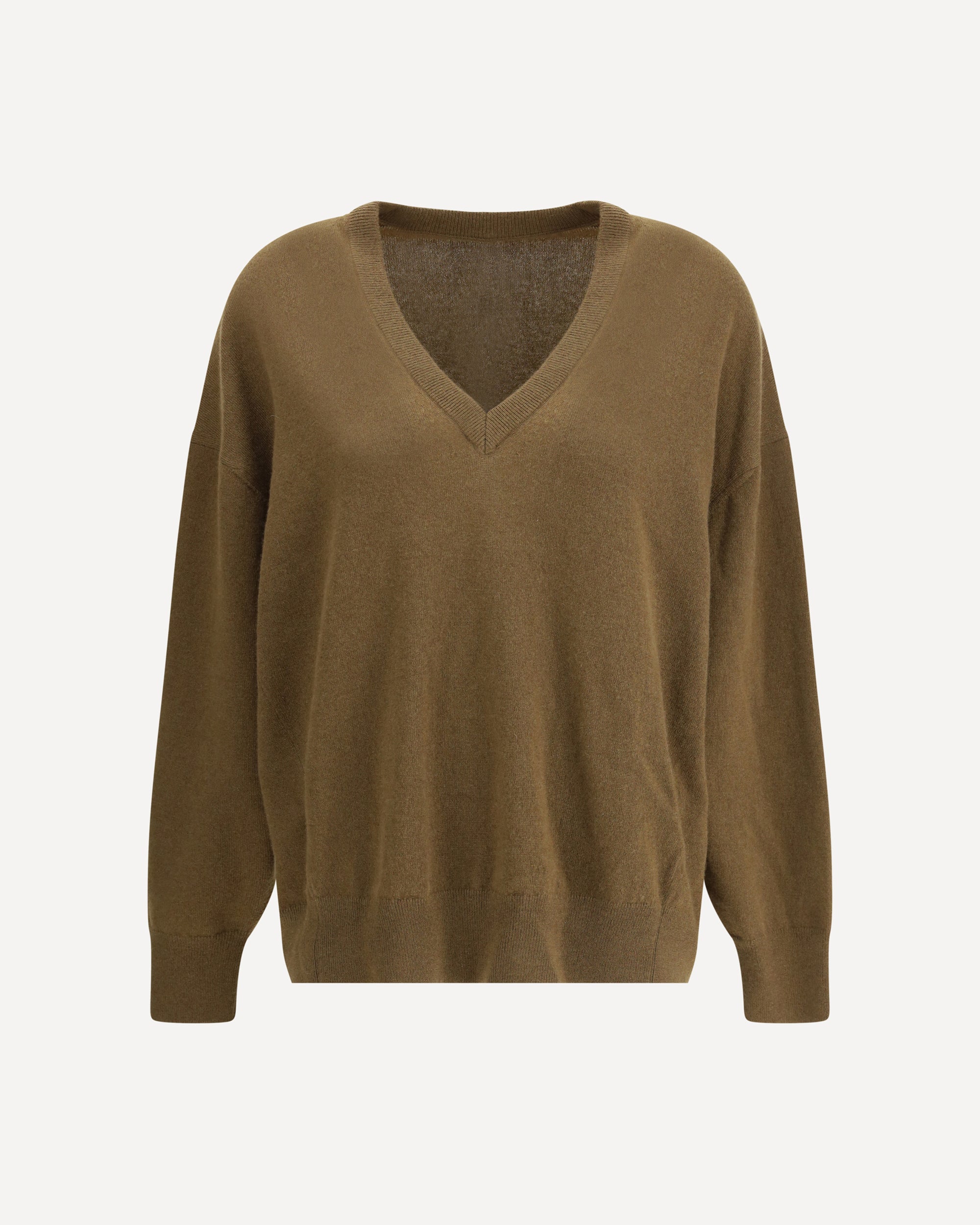 The Haven Sweater by Petar Petrov is crafted from high-end Italian cashmere, it merges the relaxed ease of a masculine knit with a fluid drape over the shoulders. A deep V-neckline lends feminine allure, balancing the generous proportions with understated sensuality. Designed in a boxy cut with dropped shoulders and full-length ribbed sleeves, it pairs effortlessly with tailored trousers or flowing skirts, making an elegant match with maxi silhouettes such as the Magnolia skirt.