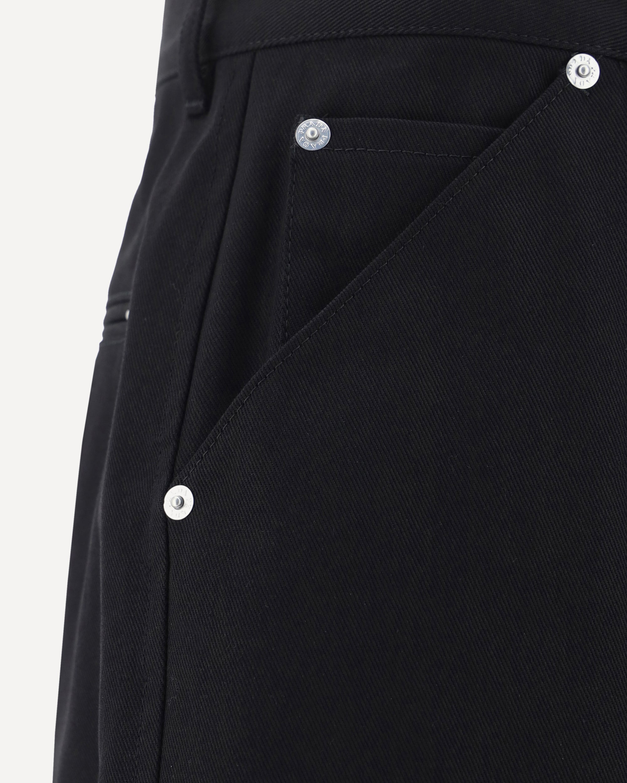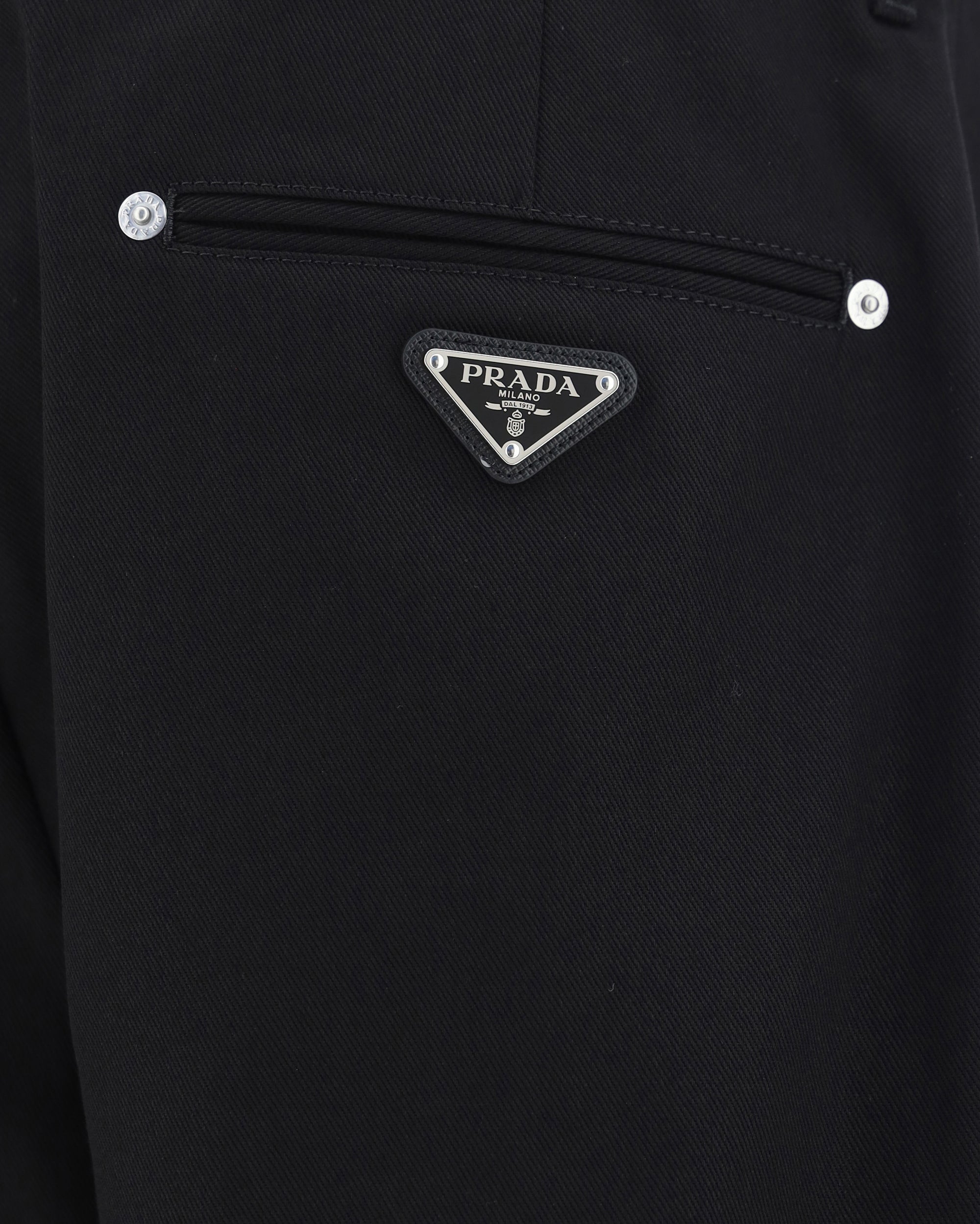 Prada's Pants made of cotton twill have a modern and refined design. They feature a concealed front button, hook-and-eye and zipper closure for a clean, minimalist effect. The tapered-leg silhouette is completed with two side pockets and a hidden back pocket. The straight hemline lends a touch of understated elegance, while the iconic enameled triangular plaque applied to the side panel stylishly signs the garment. Perfect for a contemporary and distinctive look.
