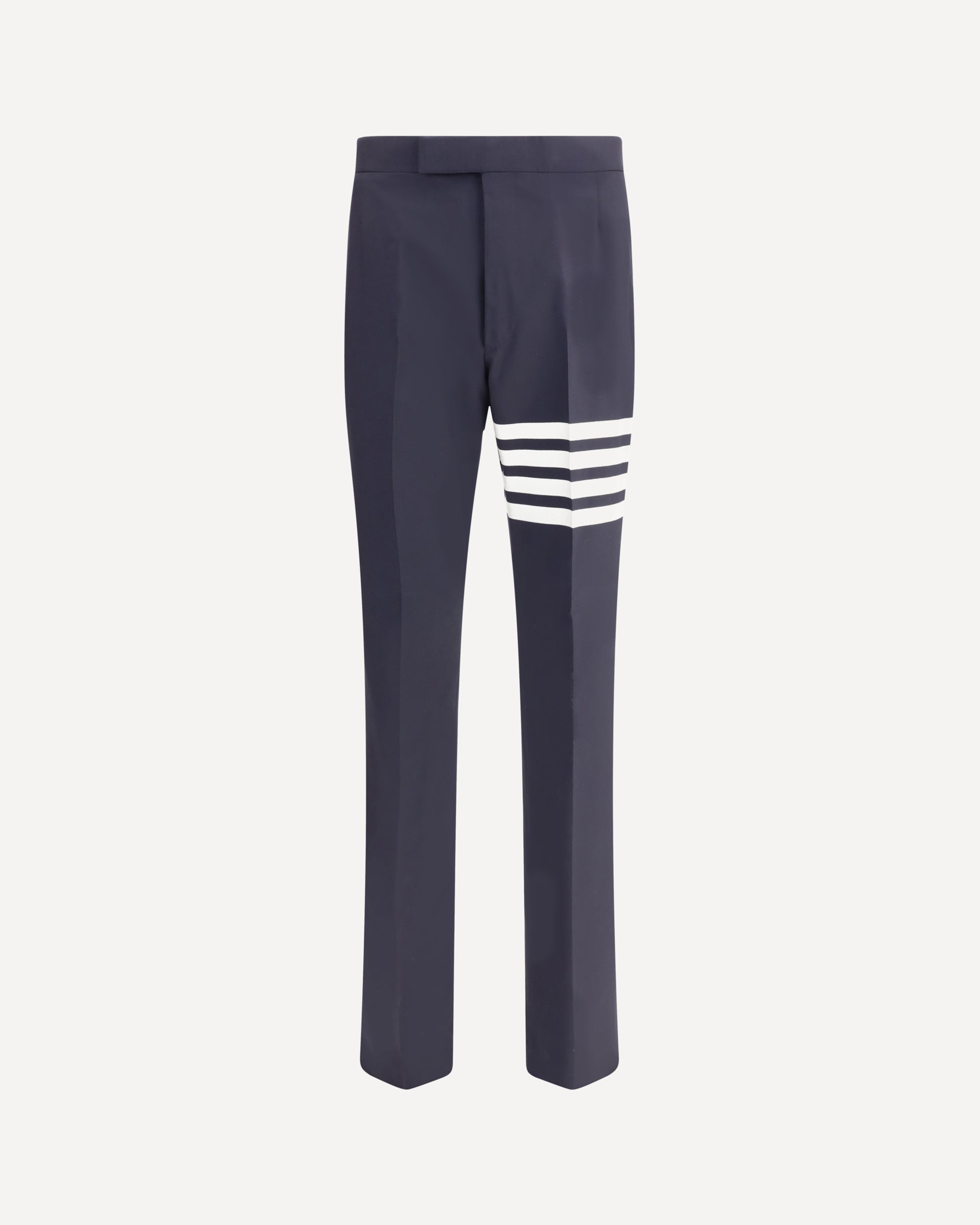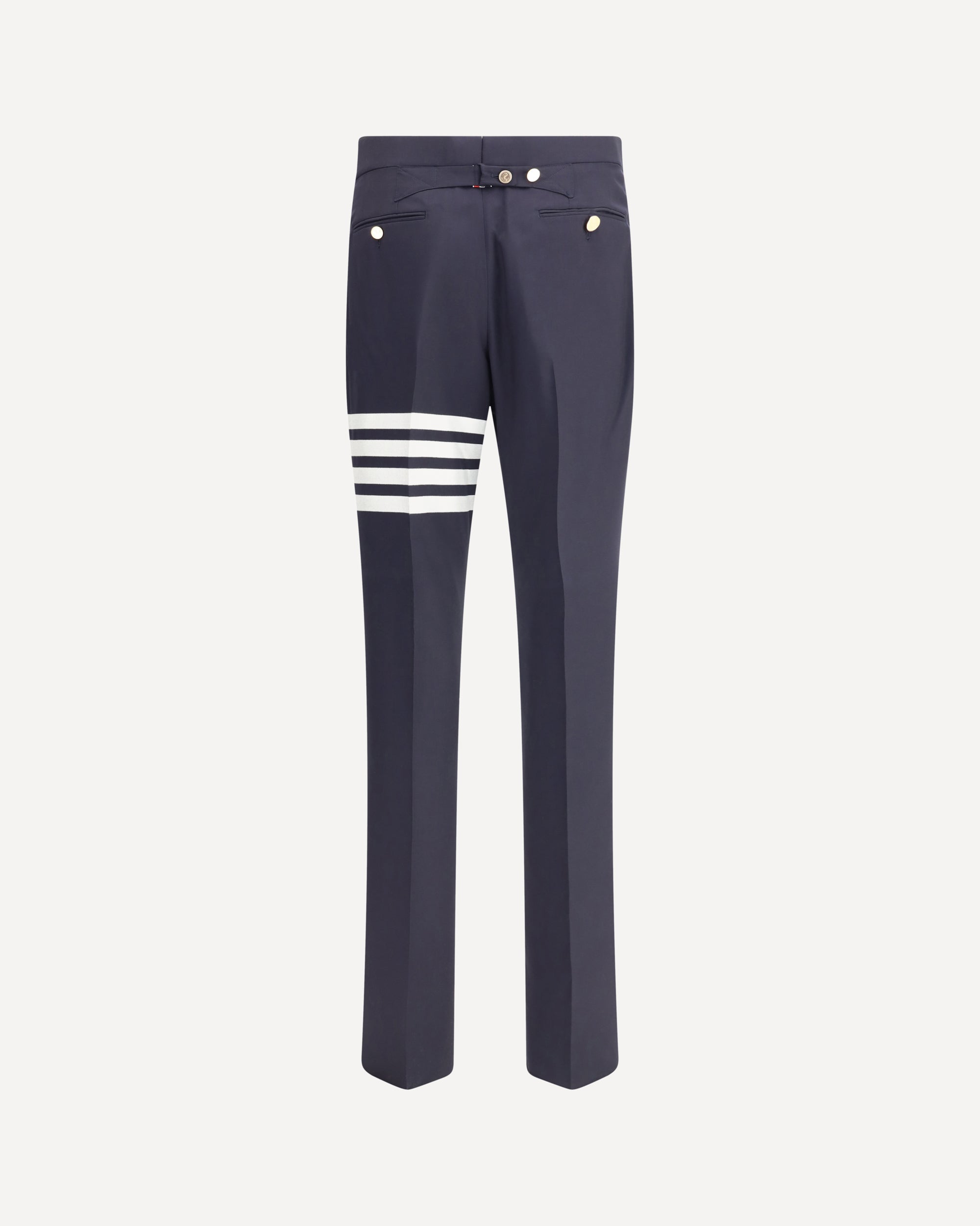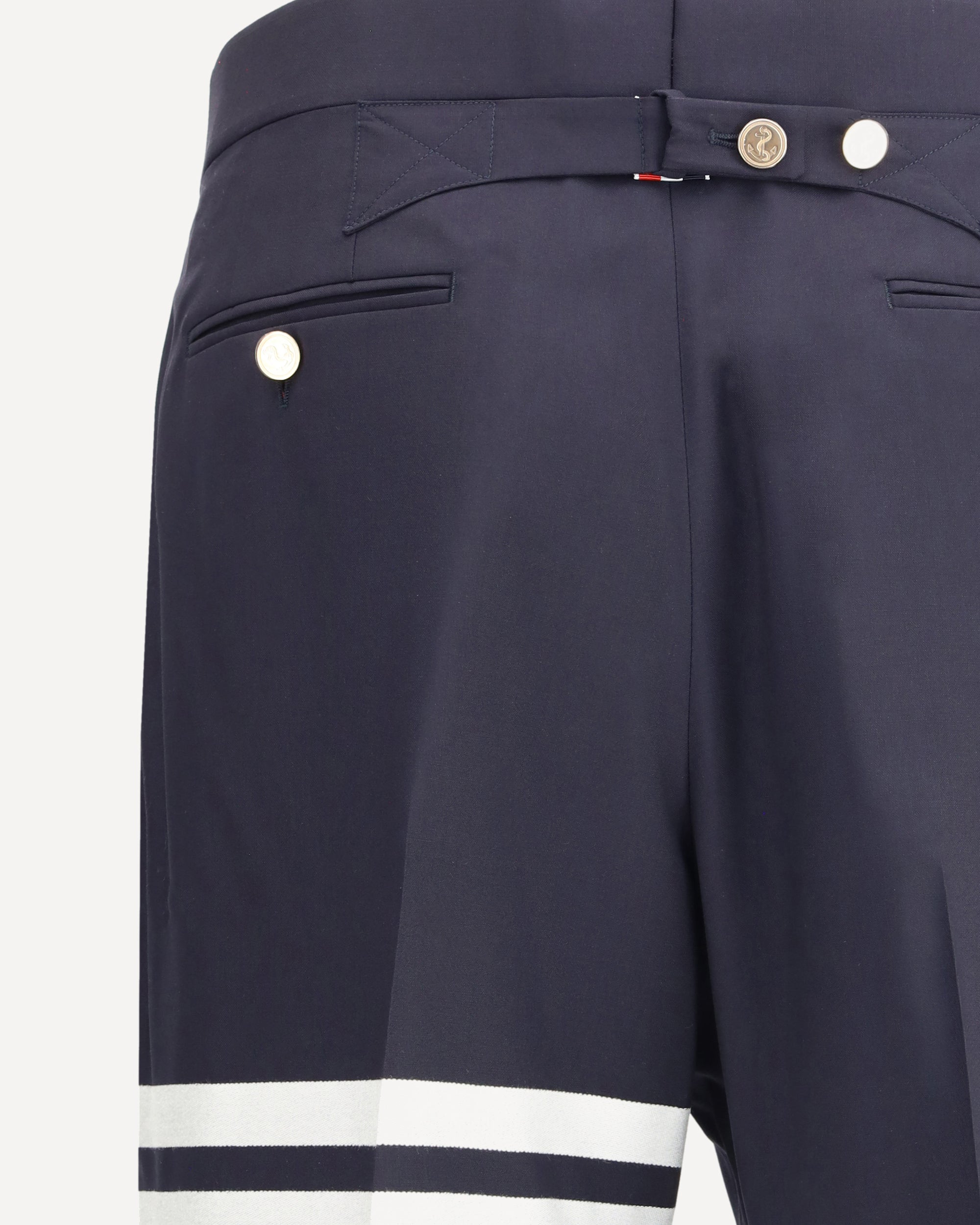 Thom Browne's wool Pants combine sartorial elegance with the brand's iconic details. Featuring a front button-and-hook closure, they feature two side slash pockets and two welt pockets at the back. Contrasting embossed buttons and the brand's iconic bands on the left leg add a distinctive touch to the monochrome design. The regular fit completes a refined garment perfect for a formal look with unmistakable style.
