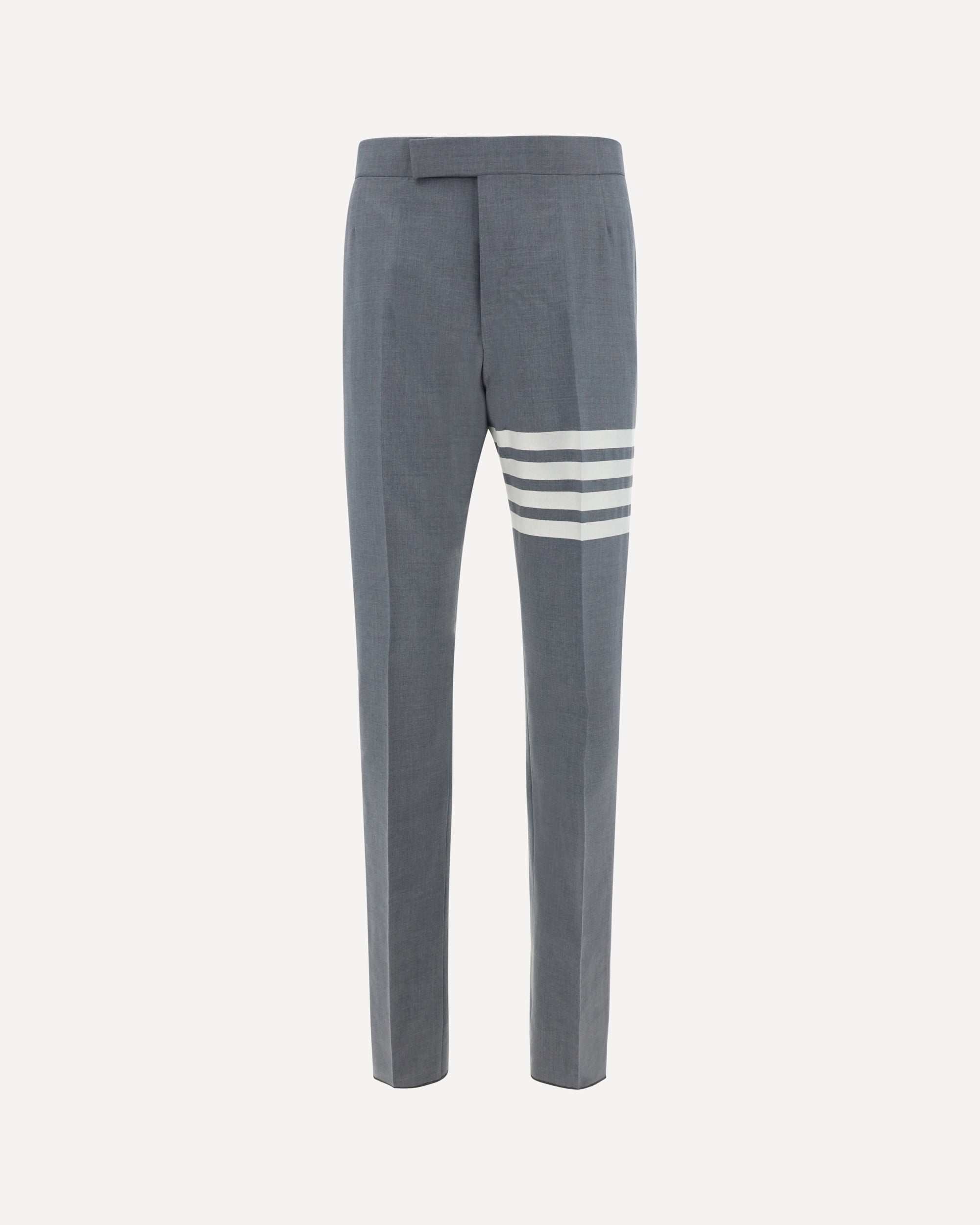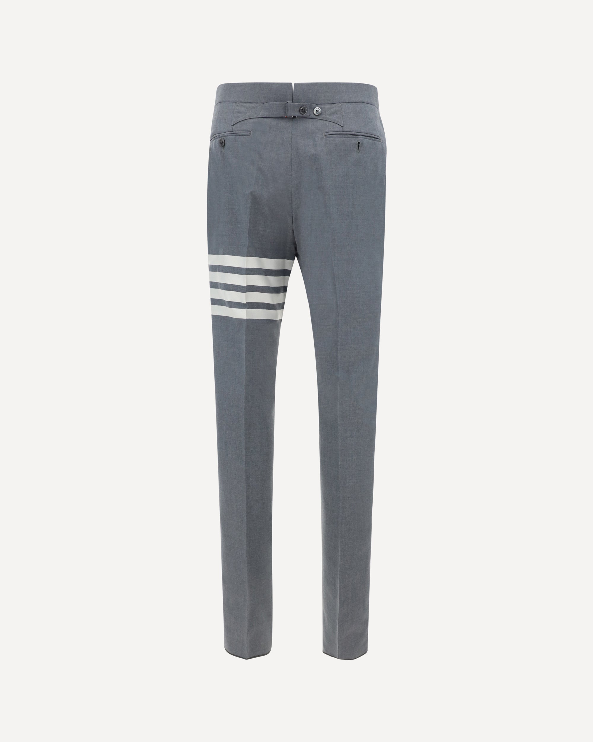 Thom Browne's wool Pants combine sartorial elegance with the brand's iconic details. Featuring a front button-and-hook closure, they feature two side slash pockets and two welt pockets at the back. Contrasting embossed buttons and the brand's iconic bands on the left leg add a distinctive touch to the monochrome design. The regular fit completes a refined garment perfect for a formal look with unmistakable style.