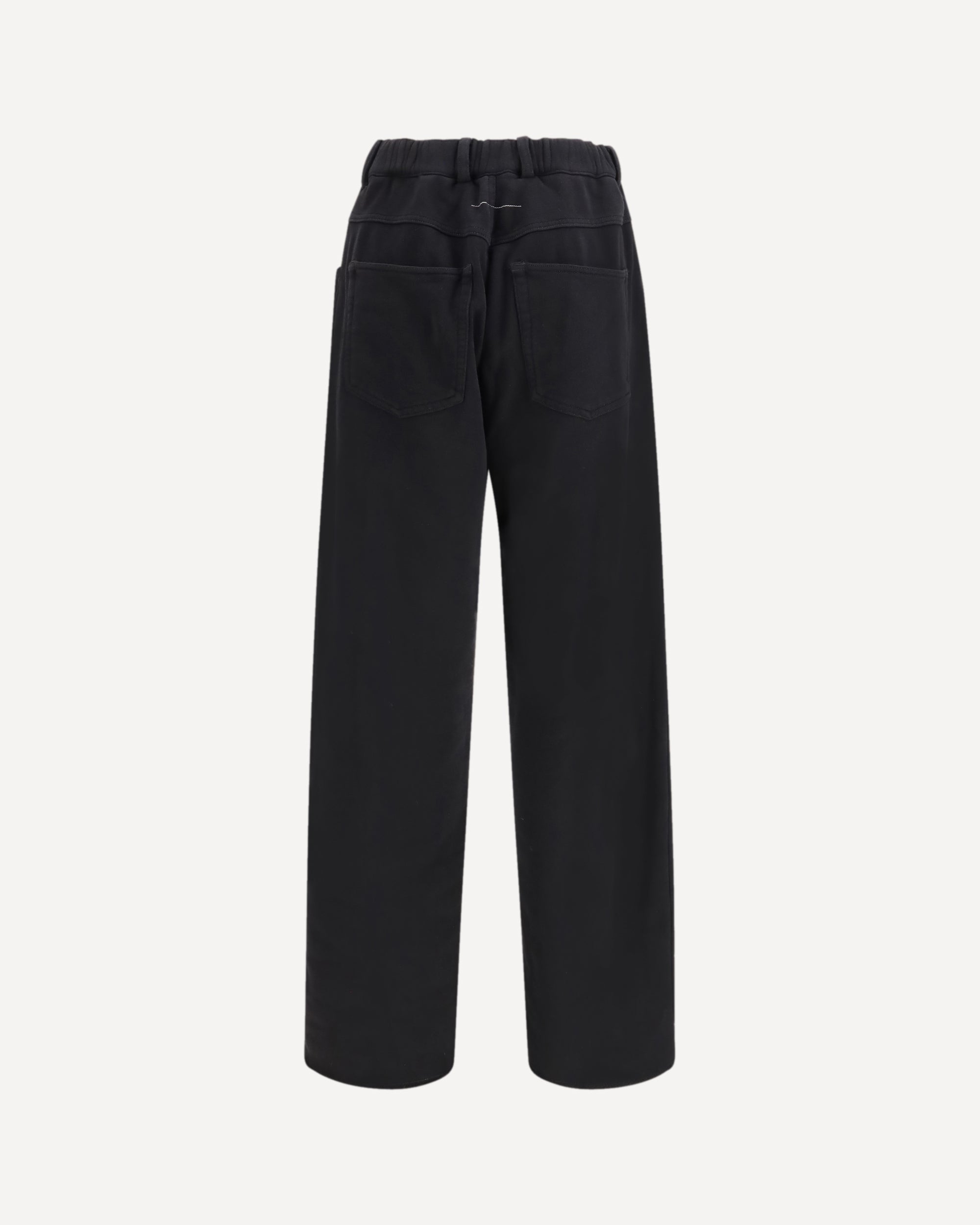 The cotton track Pants by MM6 Maison Margiela reinterpret leisurewear through the brand’s signature conceptual lens. Crafted from a fine, stretchy knit, they offer breathable lightness and a relaxed silhouette that drapes softly over the hips and thighs. The high-rise waist, secured by an elastic band, provides a comfortable fit and subtly elongates the figure, while the elasticated cuffs and refined slits at the hem introduce movement and modern ease. Side slit pockets complete a design that balances functionality with understated style.