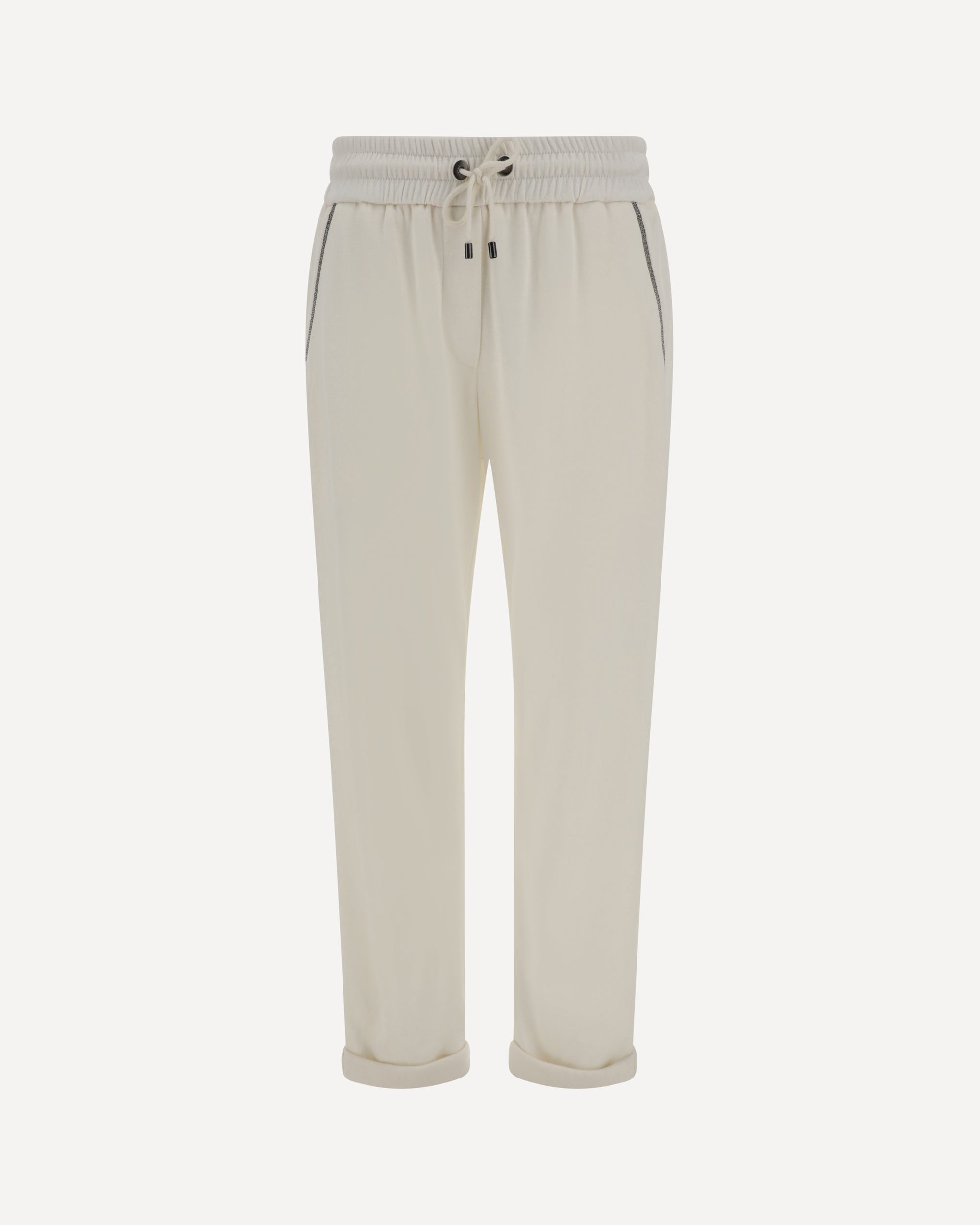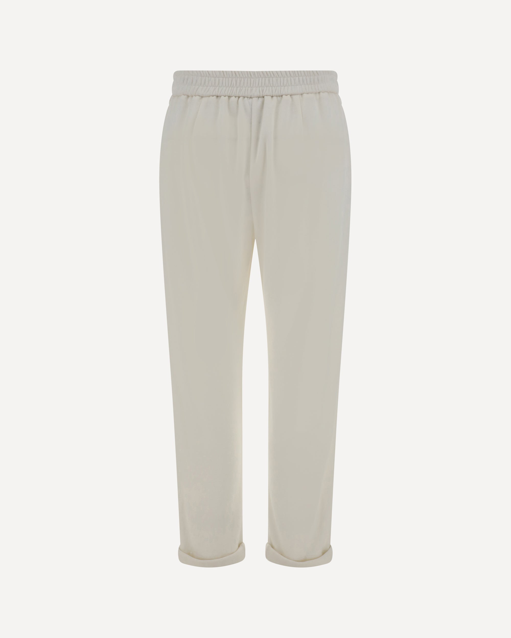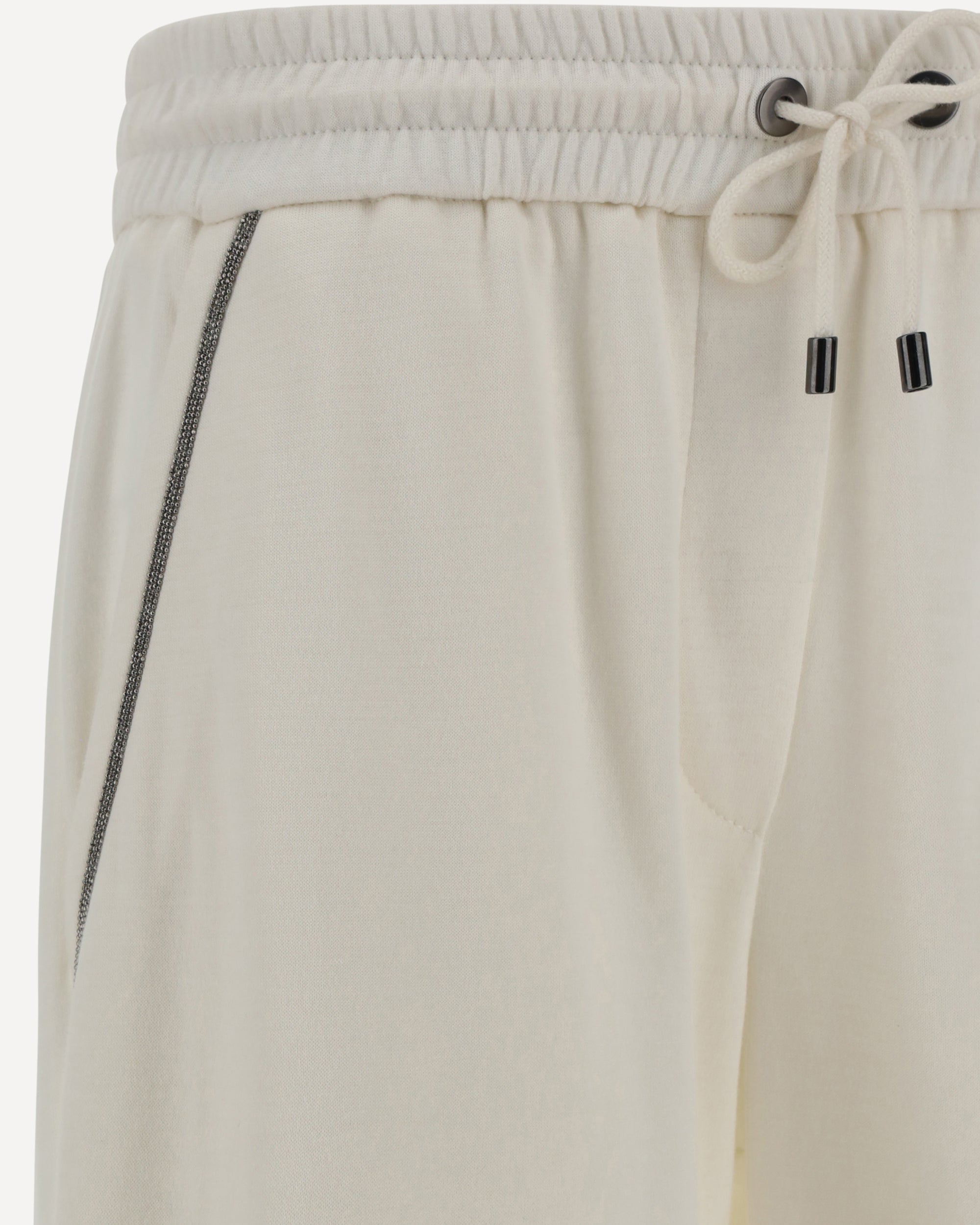 Brunello Cucinelli's cotton Pants are an elegant and comfortable piece, featuring an elasticated waistband adjustable with a drawstring, which offers a personalized fit. The two side slit pockets, embellished with sparkling jewels, add a touch of discreet luxury. The cuffed hem adds a modern detail, while the monochrome design ensures versatility and simplicity. With a regular fit, these trousers combine comfort and style, perfect for a casual-chic look.
