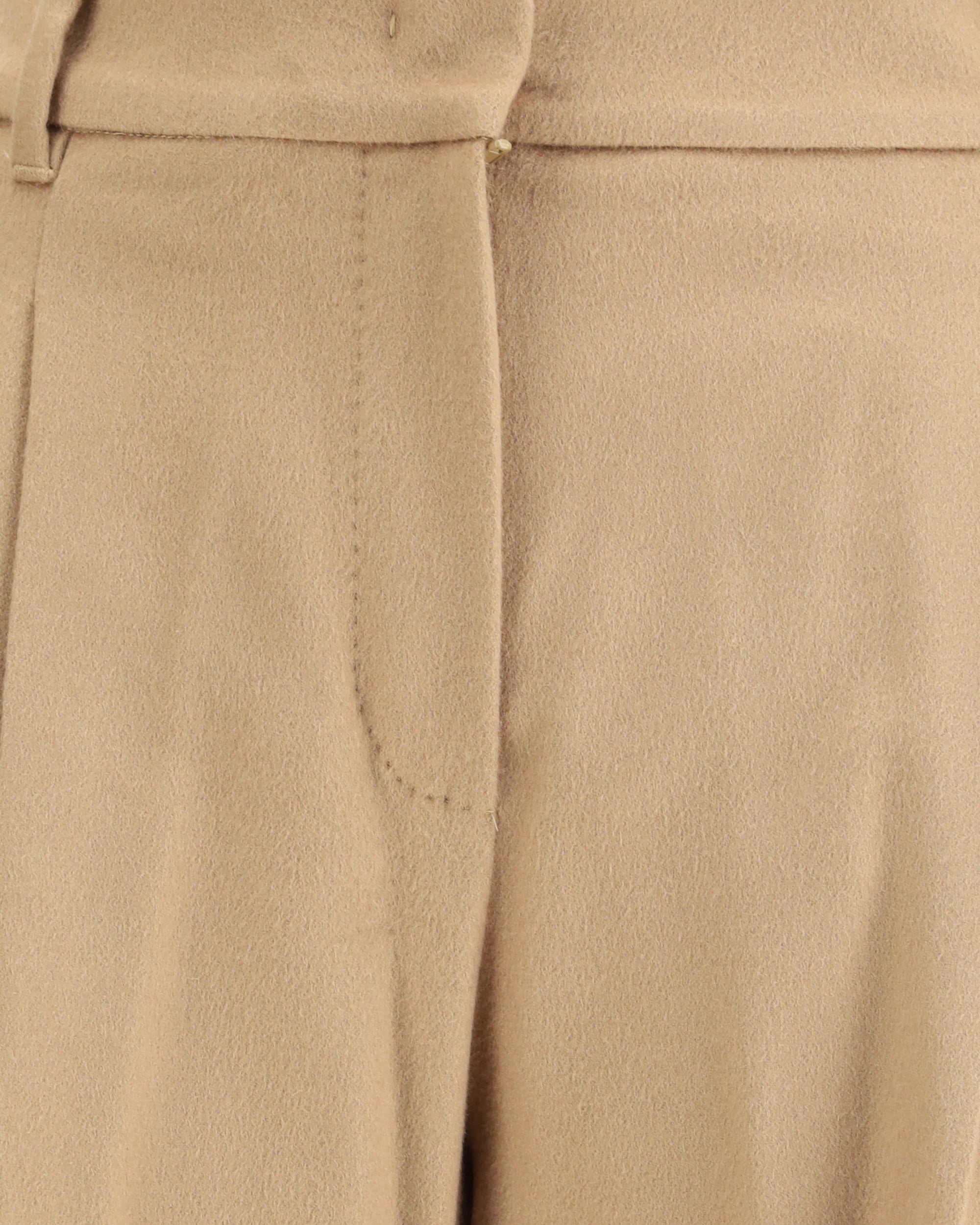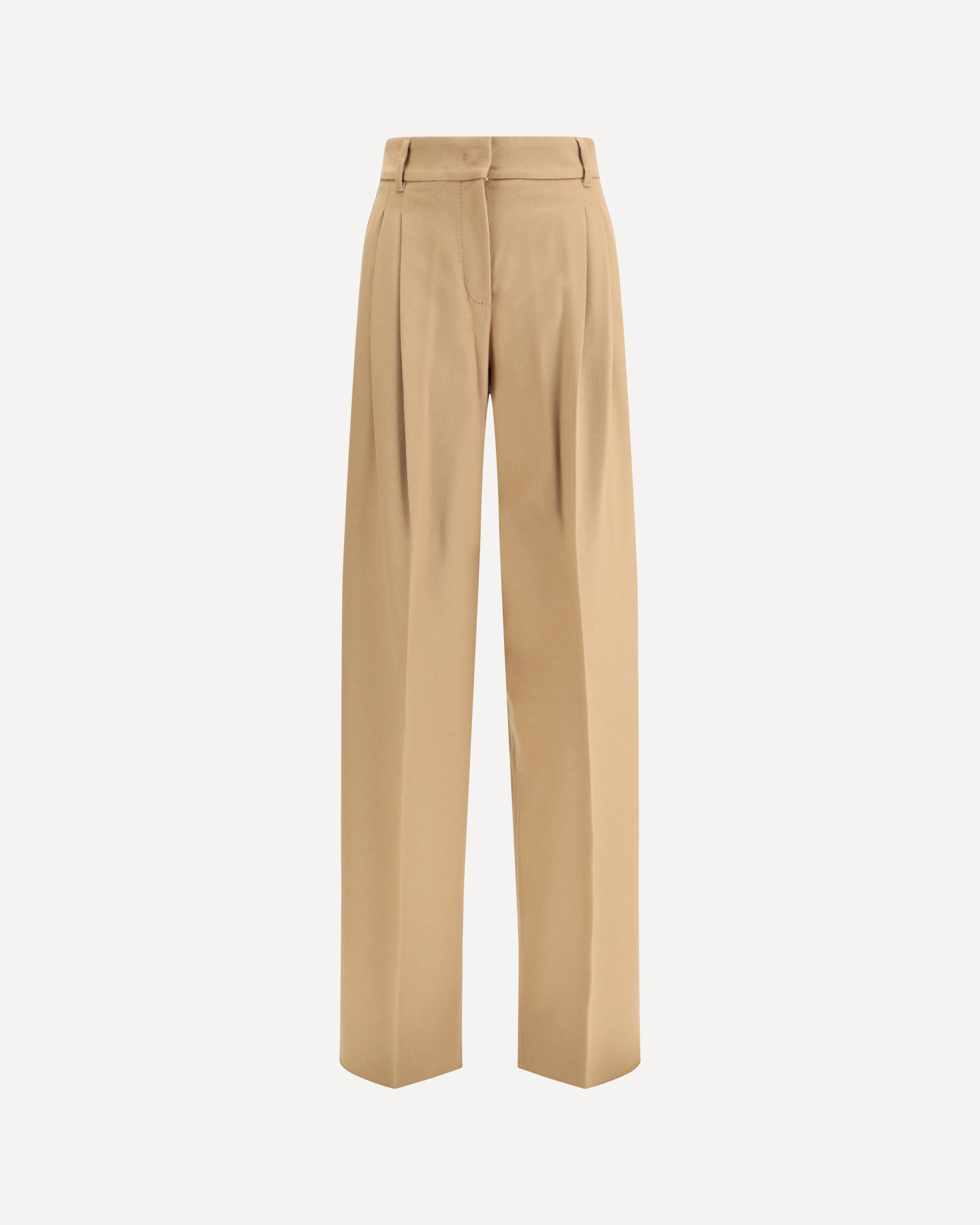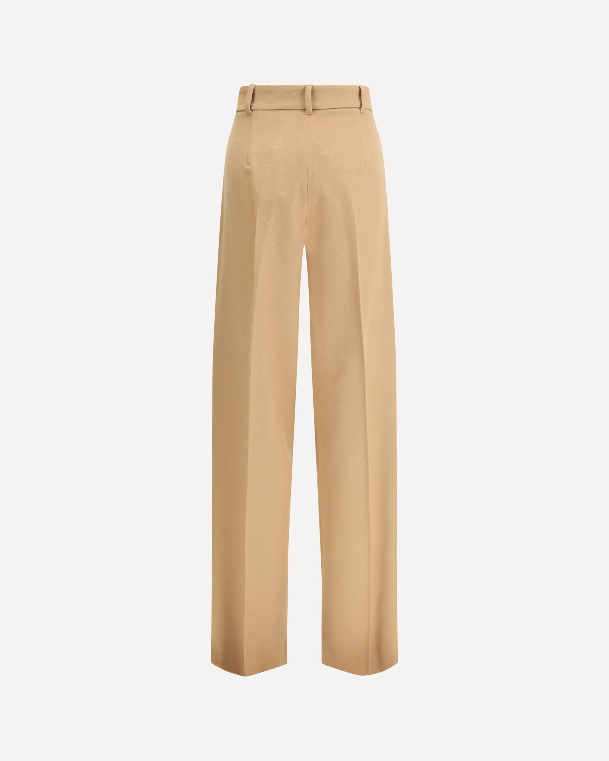 The Paride Trousers by Max Mara Studio embody relaxed sophistication and fluid elegance. Crafted from pure virgin wool drap, they feature a wide-leg silhouette and a softly flowing fit that moves effortlessly with the body. The matching coated fabric belt allows for a refined definition of the waist, while the double front pleats add subtle structure and volume. A high waistband with concealed zip and hook closure showcases precise tailoring, complemented by slanted side pockets and a pressed crease that enhances their polished look. Perfect for refined yet effortless ensembles, these trousers capture Max Mara Studio’s signature balance of comfort, craftsmanship, and timeless femininity.