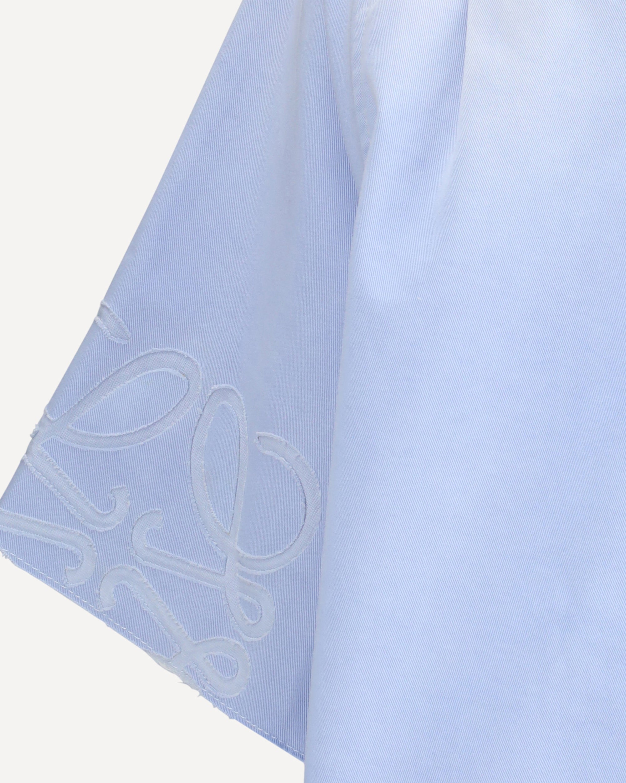 Paula's Ibiza denim-effect cotton short-sleeved Shirt by Loewe features a cool and sophisticated design. Crafted from lightweight denim-effect cotton, this shirt features a classic collar, front button closure and a welt patch pocket on the chest. Side slits add comfort and dynamism to the garment, while Anagram cut-out details on the sleeves recall the house's distinctive aesthetic, perfect for a casual yet iconic summer style.