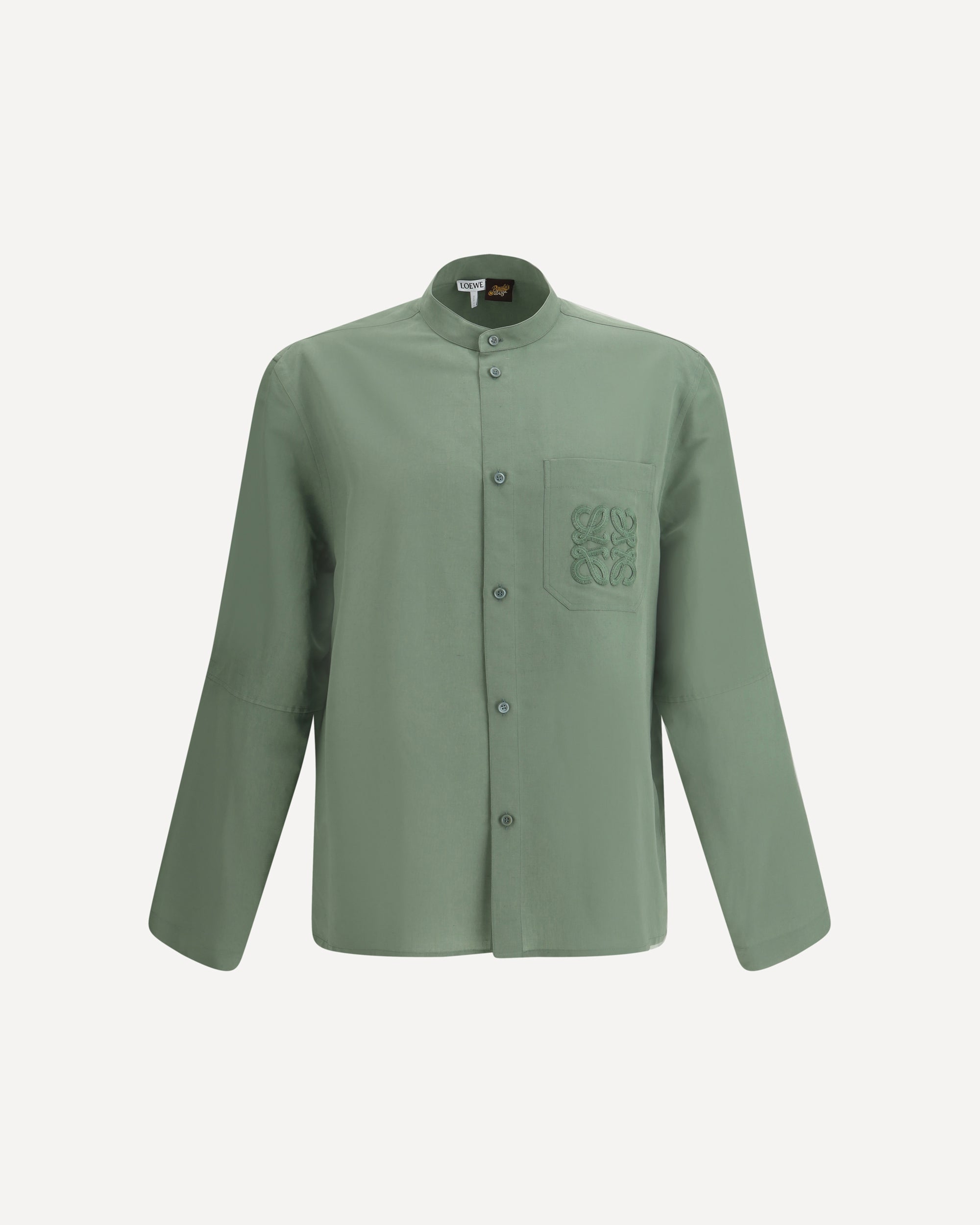 Loewe's Paula's Ibiza oversize Shirt by Loewe expresses the free and sophisticated spirit of the summer collection. Made of lightweight fabric, it features a mandarin collar and a front button closure that enhance its minimal elegance. The design is completed with a welt chest pocket embellished with the iconic embroidered Anagram, while the wide sleeves include a mid-length button to modulate the style. The oversized fit gives the garment a relaxed allure, perfect for contemporary holiday looks.