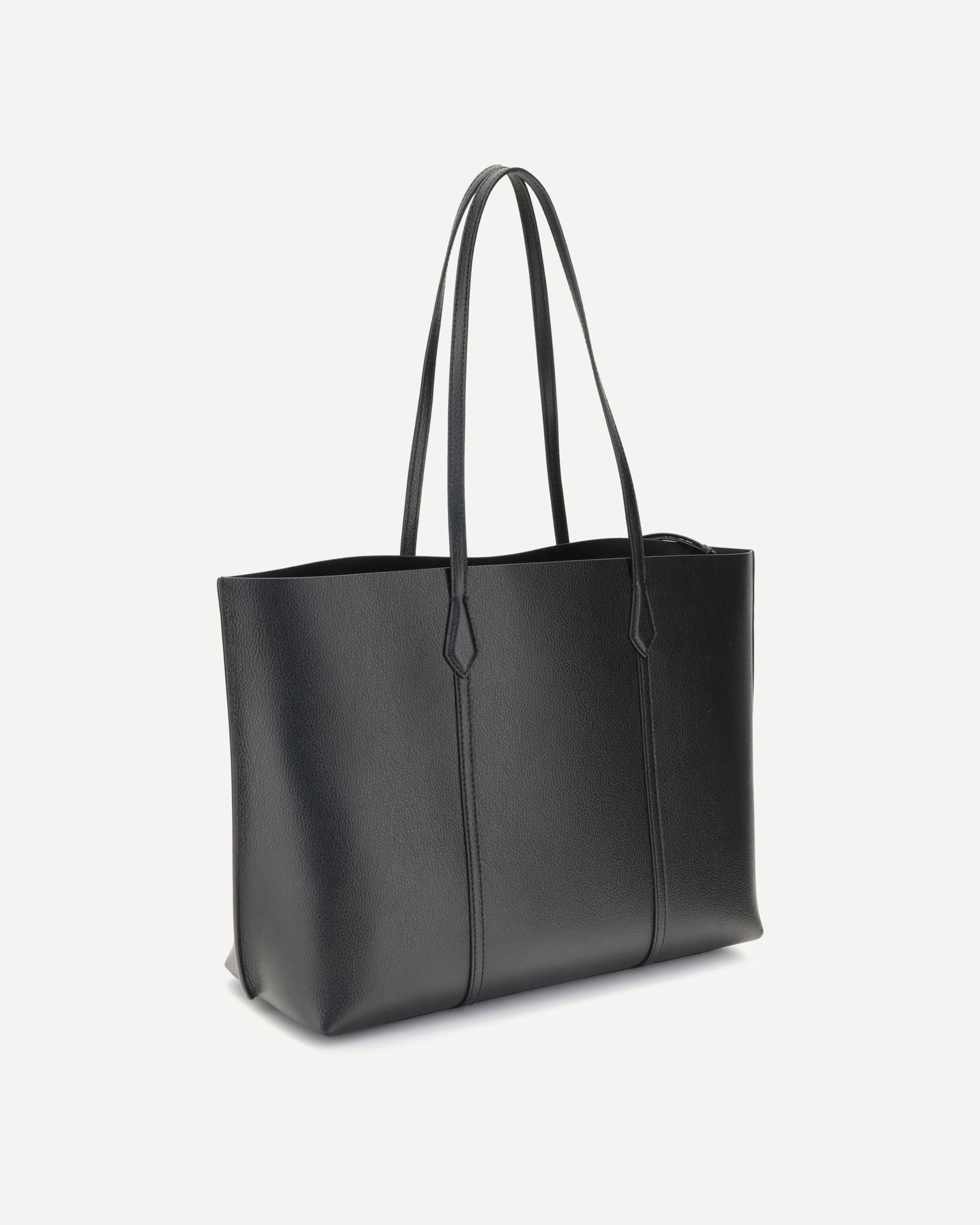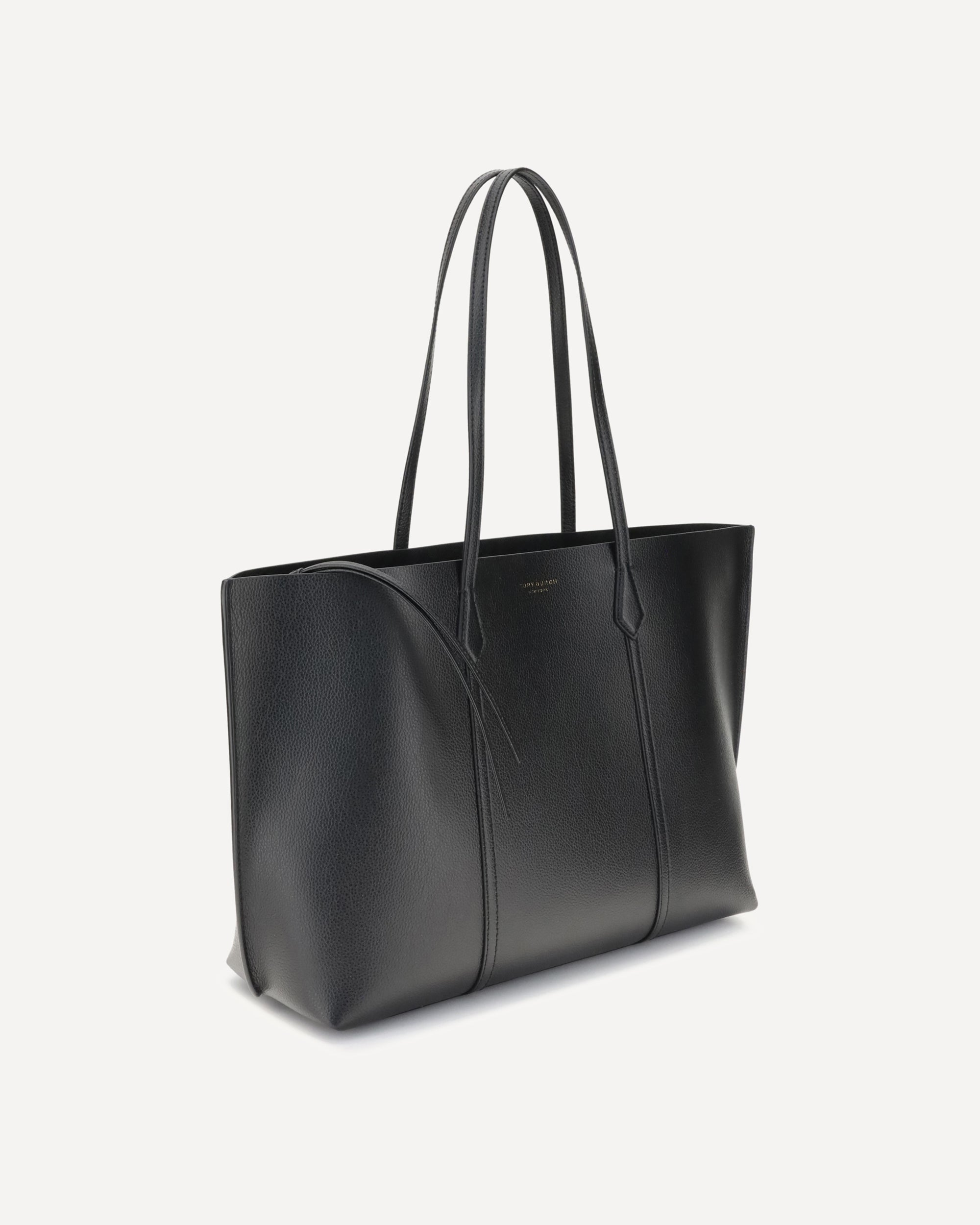 Tory Burch Grained leather Perry Tote Bag features two top handles for convenient and versatile carrying. Inside features a zippered laptop pocket, enhanced by a removable small pocket that closes with snap buttons, allowing for a balanced division in the center of the bag. The brand's iconic press-stamped monogram stands out on the front, while metal feet at the base protect the bag from wear and dirt. A functional and sophisticated accessory, perfect for those seeking style and practicality.