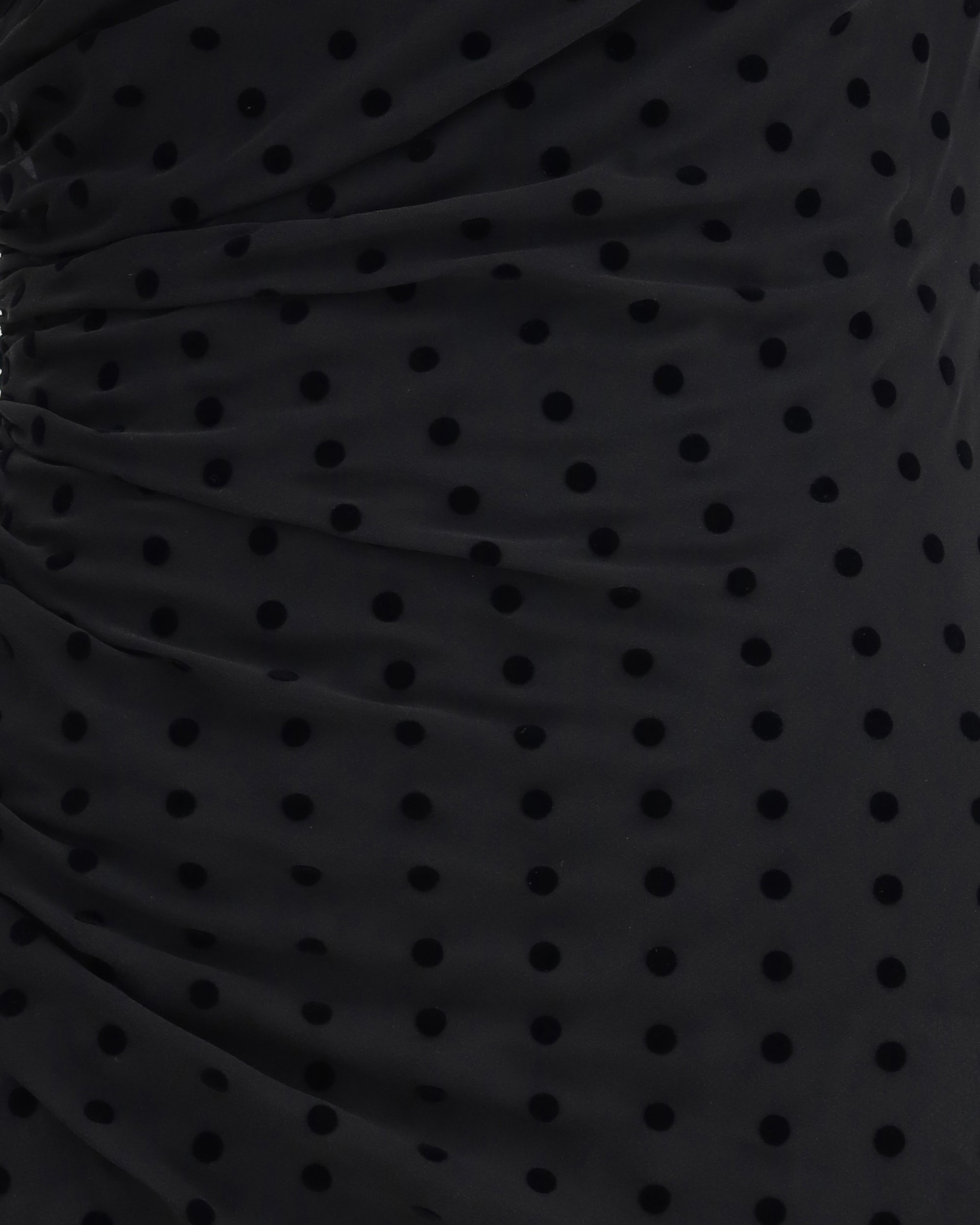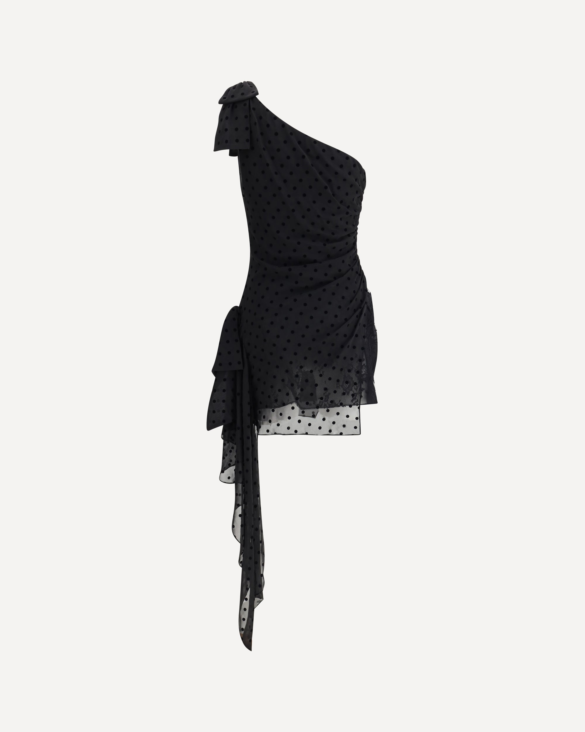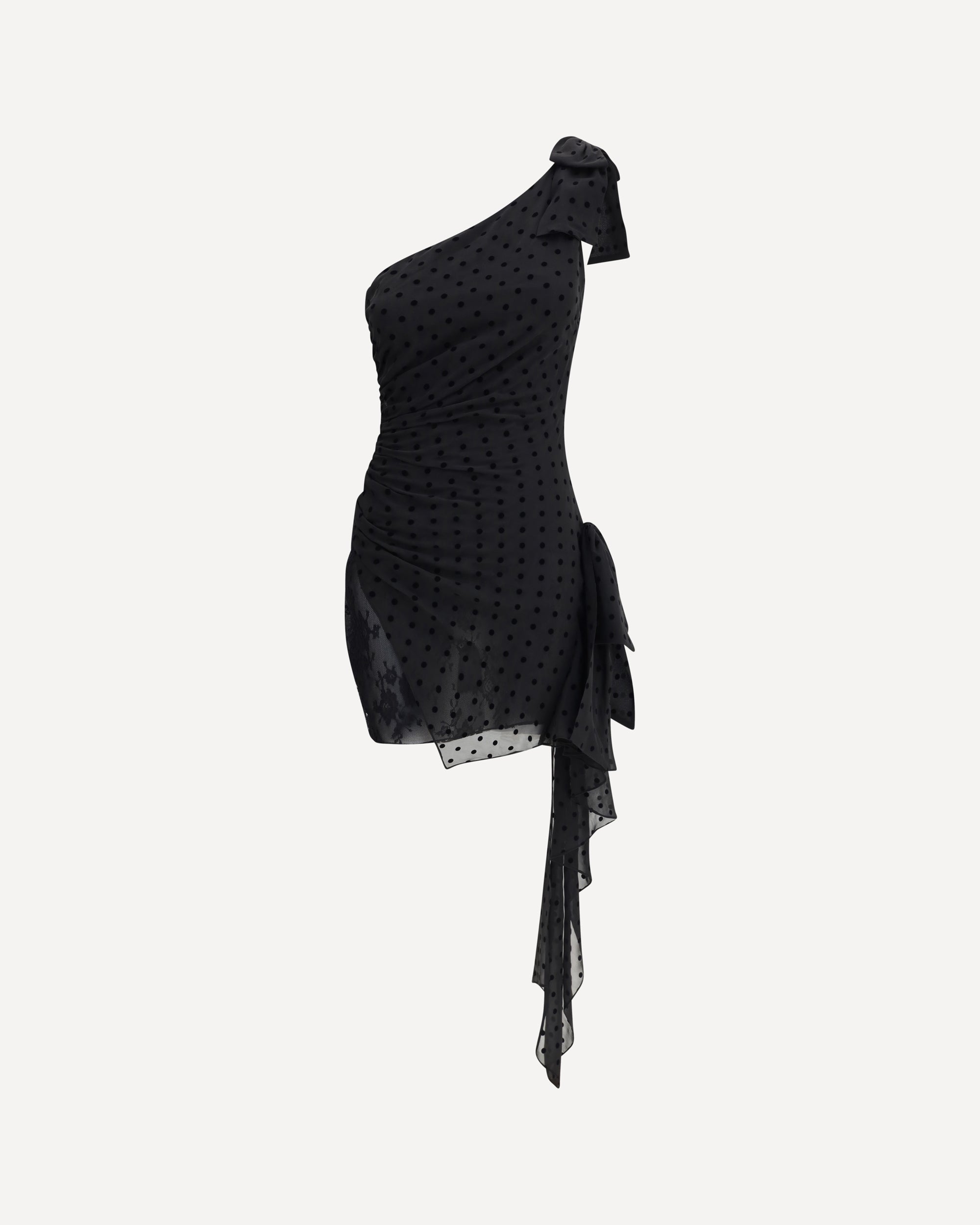 Alessandra Rich's one-shoulder Dress features a black polka-dot pattern and refined draping that enhances the silhouette. The asymmetrical hemline and ruffle details add a touch of movement and femininity, making the garment perfect for an elegant and sophisticated look.